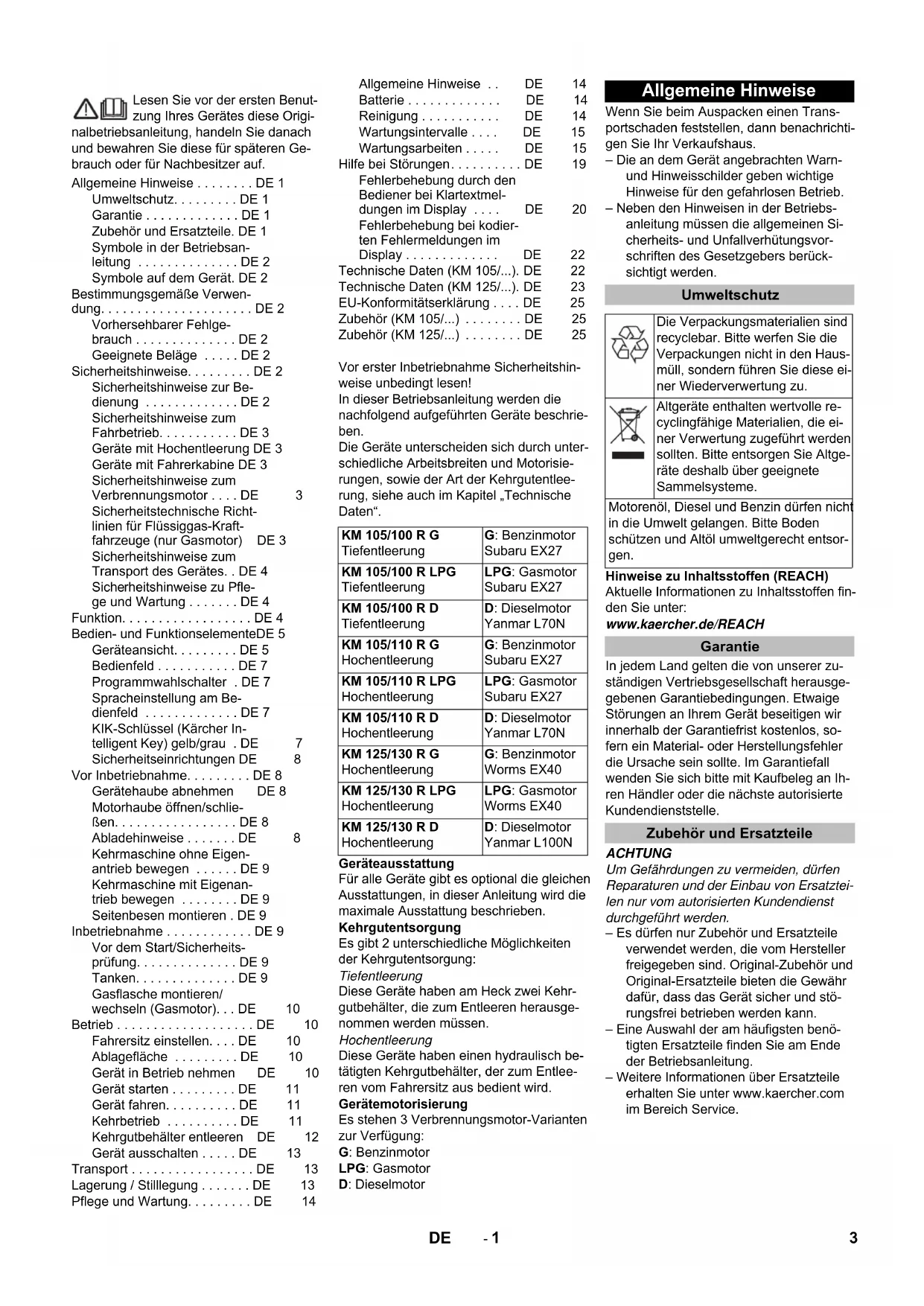 KM 105/100 R (G, LPG, D) KM 105/110 R (G, LPG, D) KM 125/130 R (G, LPG, D) KM 105/100 R (G, LPG, D) KM 105/110 R (G, LPG, D) KM 125/130 R (G, LPG, D) 59658320 09/20 Deutsch 3 English 28 Français 53 Italiano 80 Nederlands 106 Español 131 Português 157 Dansk 184 Norsk 208 Svenska 232 Suomi 256 Ελληνικά 280 Türkçe 3082- 1 Lesen Sie vor der ersten Benut- zung Ihres Gerätes diese Origi- nalbetriebsanleitung, handeln Sie danach und bewahren Sie diese für späteren Ge- brauch oder für Nachbesitzer auf. Vor erster Inbetriebnahme Sicherheitshin- weise unbedingt lesen! In dieser Betriebsanleitung werden die nachfolgend aufgeführten Geräte beschrie- ben. Die Geräte unterscheiden sich durch unter- schiedliche Arbeitsbreiten und Motorisie- rungen, sowie der Art der Kehrgutentlee- rung, siehe auch im Kapitel „Technische Daten“. Geräteausstattung Für alle Geräte gibt es optional die gleichen Ausstattungen, in dieser Anleitung wird die maximale Ausstattung beschrieben. Kehrgutentsorgung Es gibt 2 unterschiedliche Möglichkeiten der Kehrgutentsorgung: Tiefentleerung Diese Geräte haben am Heck zwei Kehr- gutbehälter, die zum Entleeren herausge- nommen werden müssen. Hochentleerung Diese Geräte haben einen hydraulisch be- tätigten Kehrgutbehälter, der zum Entlee- ren vom Fahrersitz aus bedient wird. Gerätemotorisierung Es stehen 3 Verbrennungsmotor-Varianten zur Verfügung: G: Benzinmotor LPG: Gasmotor D: Dieselmotor Wenn Sie beim Auspacken einen Trans- portschaden feststellen, dann benachrichti- gen Sie Ihr Verkaufshaus. – Die an dem Gerät angebrachten Warn- und Hinweisschilder geben wichtige Hinweise für den gefahrlosen Betrieb. – Neben den Hinweisen in der Betriebs- anleitung müssen die allgemeinen Si- cherheits- und Unfallverhütungsvor- schriften des Gesetzgebers berück- sichtigt werden. Hinweise zu Inhaltsstoffen (REACH) Aktuelle Informationen zu Inhaltsstoffen fin- den Sie unter: www.kaercher.de/REACH In jedem Land gelten die von unserer zu- ständigen Vertriebsgesellschaft herausge- gebenen Garantiebedingungen. Etwaige Störungen an Ihrem Gerät beseitigen wir innerhalb der Garantiefrist kostenlos, so- fern ein Material- oder Herstellungsfehler die Ursache sein sollte. Im Garantiefall wenden Sie sich bitte mit Kaufbeleg an Ih- ren Händler oder die nächste autorisierte Kundendienststelle. ACHTUNG Um Gefährdungen zu vermeiden, dürfen Reparaturen und der Einbau von Ersatztei- len nur vom autorisierten Kundendienst durchgeführt werden. – Es dürfen nur Zubehör und Ersatzteile verwendet werden, die vom Hersteller freigegeben sind. Original-Zubehör und Original-Ersatzteile bieten die Gewähr dafür, dass das Gerät sicher und stö- rungsfrei betrieben werden kann. – Eine Auswahl der am häufigsten benö- tigten Ersatzteile finden Sie am Ende der Betriebsanleitung. – Weitere Informationen über Ersatzteile erhalten Sie unter www.kaercher.com im Bereich Service. Allgemeine Hinweise . . . . . . . . DE 1 Umweltschutz. . . . . . . . . DE 1 Garantie . . . . . . . . . . . . . DE 1 Zubehör und Ersatzteile. DE 1 Symbole in der Betriebsan- leitung . . . . . . . . . . . . . . DE 2 Symbole auf dem Gerät. DE 2 Bestimmungsgemäße Verwen- dung. . . . . . . . . . . . . . . . . . . . . DE 2 Vorhersehbarer Fehlge- brauch . . . . . . . . . . . . . . DE 2 Geeignete Beläge . . . . . DE 2 Sicherheitshinweise. . . . . . . . . DE 2 Sicherheitshinweise zur Be- dienung . . . . . . . . . . . . . DE 2 Sicherheitshinweise zum Fahrbetrieb. . . . . . . . . . . DE 3 Geräte mit Hochentleerung DE 3 Geräte mit Fahrerkabine DE 3 Sicherheitshinweise zum Verbrennungsmotor . . . . DE 3 Sicherheitstechnische Richt- linien für Flüssiggas-Kraft- fahrzeuge (nur Gasmotor) DE 3 Sicherheitshinweise zum Transport des Gerätes. . DE 4 Siche rheitshinweise zu Pfle- ge und Wartung . . . . . . . DE 4 Funktion. . . . . . . . . . . . . . . . . . DE 4 Bedien- und FunktionselementeDE 5 Geräteansicht. . . . . . . . . DE 5 Bedienfeld . . . . . . . . . . . DE 7 Programmwahlschalter . DE 7 Spracheinstellung am Be- dienfeld . . . . . . . . . . . . . DE 7 KIK-Schlüssel (Kärcher In- telligent Key) gelb/grau . DE 7 Sicherheitseinrichtungen DE 8 Vor Inbetriebnahme. . . . . . . . . DE 8 Gerätehaube abnehmen DE 8 Motorhaube öffnen/schlie- ßen. . . . . . . . . . . . . . . . . DE 8 Abladehinweise . . . . . . . DE 8 Kehrmaschine ohne Eigen- antrieb bewegen . . . . . . DE 9 Kehrmaschine mit Eigenan- trieb bewegen . . . . . . . . DE 9 Seitenbesen montieren . DE 9 Inbetriebnahme . . . . . . . . . . . . DE 9 Vor dem Start/Sicherheits- prüfung. . . . . . . . . . . . . . DE 9 Tanken. . . . . . . . . . . . . . DE 9 Gasflasche montieren/ wechseln (Gasmotor). . . DE 10 Betrieb . . . . . . . . . . . . . . . . . . . DE 10 Fahrersitz einstellen. . . . DE 10 Ablagefläche . . . . . . . . . DE 10 Gerät in Betrieb nehmen DE 10 Gerät starten . . . . . . . . . DE 11 Gerät fahren. . . . . . . . . . DE 11 Kehrbetrieb . . . . . . . . . . DE 11 Kehrgutbehälter entleeren DE 12 Gerät ausschalten . . . . . DE 13 Transport . . . . . . . . . . . . . . . . . DE 13 Lagerung / Stilllegung . . . . . . . DE 13 Pflege und Wartung. . . . . . . . . DE 14 Allgemeine Hinweise . . DE 14 Batterie . . . . . . . . . . . . . DE 14 Reinigung . . . . . . . . . . . DE 14 Wartungsintervalle . . . . DE 15 Wartungsarbeiten . . . . . DE 15 Hilfe bei Störungen. . . . . . . . . . DE 19 Fehlerbehebung durch den Bediener bei Klartextmel- dungen im Display . . . . DE 20 Fehlerbehebung bei kodier- ten Fehlermeldungen im Display . . . . . . . . . . . . . DE 22 Technische Daten (KM 105/...). DE 22 Technische Daten (KM 125/...). DE 23 EU-Konformitätserklärung . . . . DE 25 Zubehör (KM 105/...) . . . . . . . . DE 25 Zubehör (KM 125/...) . . . . . . . . DE 25 KM 105/100 R G Tiefentleerung G: Benzinmotor Subaru EX27