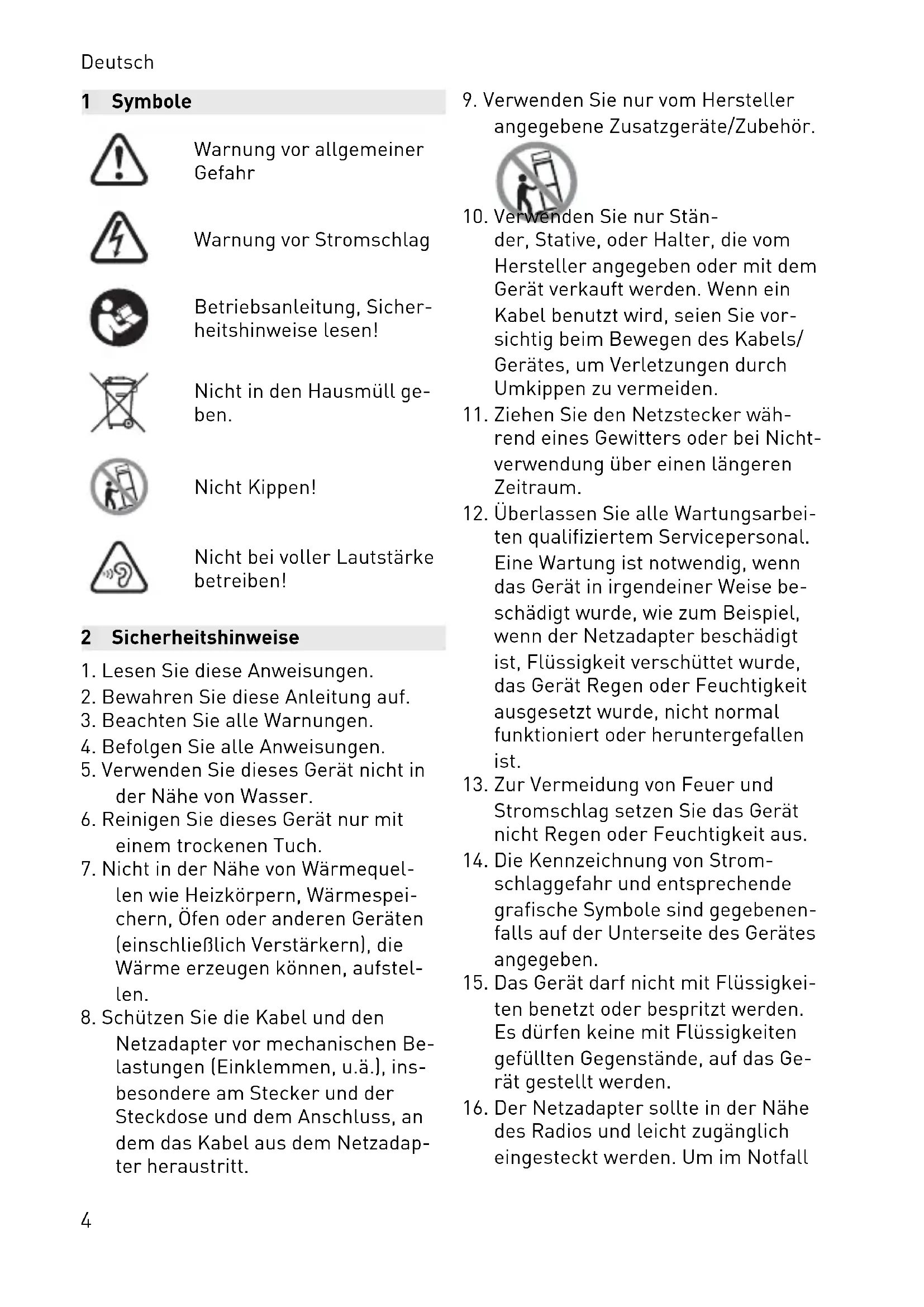 21 Symbole Warnung vor allgemeiner Gefahr Warnung vor Stromschlag Betriebsanleitung, Sicher heitshinweise lesen! Nicht in den Hausmüll ge ben. Nicht Kippen! Nicht bei voller Lautstärke betreiben! 2 Sicherheitshinweise