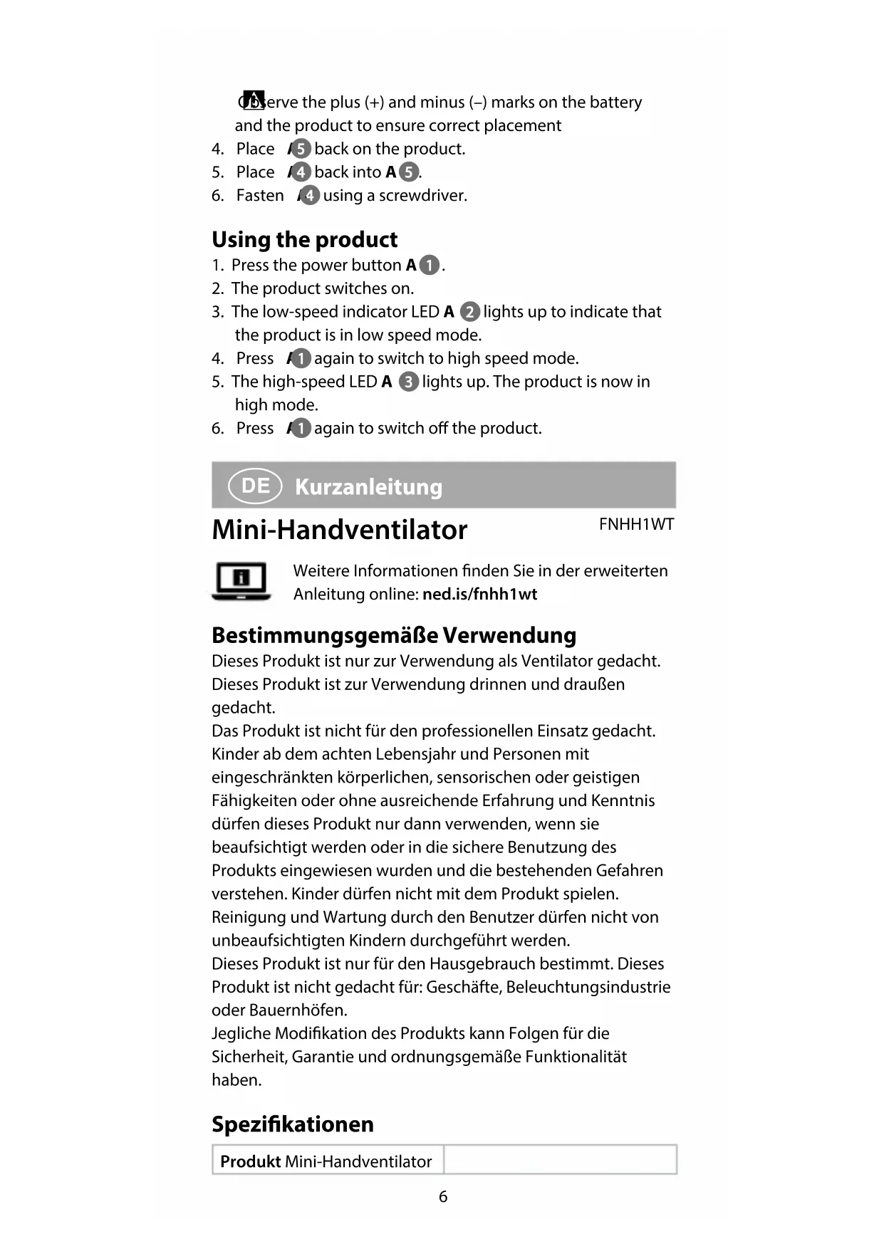 Kurzanleitung Mini-Handventilator FNHH1WTWeitere Informationen nden Sie in der erweiterten Anleitung online: ned.is/fnhh1wt Bestimmungsgemäße Verwendung Dieses Produkt ist nur zur Verwendung als Ventilator gedacht.Dieses Produkt ist zur Verwendung drinnen und draußen gedacht.Das Produkt ist nicht für den professionellen Einsatz gedacht.Kinder ab dem achten Lebensjahr und Personen mit eingeschränkten körperlichen, sensorischen oder geistigen Fähigkeiten oder ohne ausreichende Erfahrung und Kenntnis dürfen dieses Produkt nur dann verwenden, wenn sie beaufsichtigt werden oder in die sichere Benutzung des Produkts eingewiesen wurden und die bestehenden Gefahren verstehen. Kinder dürfen nicht mit dem Produkt spielen. Reinigung und Wartung durch den Benutzer dürfen nicht von unbeaufsichtigten Kindern durchgeführt werden.Dieses Produkt ist nur für den Hausgebrauch bestimmt. Dieses Produkt ist nicht gedacht für: Geschäfte, Beleuchtungsindustrie oder Bauernhöfen.Jegliche Modikation des Produkts kann Folgen für die Sicherheit, Garantie und ordnungsgemäße Funktionalität haben. Spezikationen Produkt Mini-Handventilator7 Artikelnummer FNHH1WT Größe (L x B x H) 162 x 75 x 25 mm Gewicht 60 g ohne Batterien Leistung 0,6 - 0,9 W Stromstärke 180 - 270 mA Batterie 2 x AA (nicht im Lieferumfang enthalten) Hauptbestandteile (Abbildung A) 1 Ein/Aus-Taste 2 LED-Anzeige für niedrige Geschwindigkeit 3 LED-Anzeige für hohe Geschwindigkeit 4 Schraube 5 Batterieabdeckung 6 Ventilatorständer Sicherheitshinweise