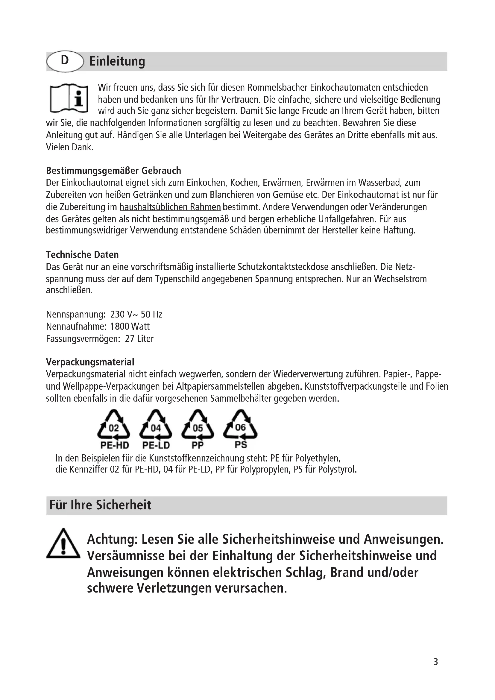 D Bedienungsanleitung GB Instruction manual F Mode d‘emploi KA 1800 KA 1801 KA 1802 KA 1804 KA 2000/E KA 2001/E KA 2002/E KA 2004/E3 Einleitung Wir freuen uns, dass Sie sich für diesen Rommelsbacher Einkochautomaten entschieden haben und bedanken uns für Ihr Vertrauen. Die einfache, sichere und vielseitige Bedienung wird auch Sie ganz sicher begeistern. Damit Sie lange Freude an Ihrem Gerät haben, bitten wir Sie, die nachfolgenden Informationen sorgfältig zu lesen und zu beachten. Bewahren Sie diese Anleitung gut auf. Händigen Sie alle Unterlagen bei Weitergabe des Gerätes an Dritte ebenfalls mit aus. Vielen Dank. Bestimmungsgemäßer Gebrauch Der Einkochautomat eignet sich zum Einkochen, Kochen, Erwärmen, Erwärmen im Wasserbad, zum Zubereiten von heißen Getränken und zum Blanchieren von Gemüse etc. Der Einkochautomat ist nur für die Zubereitung im haushaltsüblichen Rahmen bestimmt. Andere Verwendungen oder Veränderungen des Gerätes gelten als nicht bestimmungsgemäß und bergen erhebliche Unfallgefahren. Für aus bestimmungswidriger Verwendung entstandene Schäden übernimmt der Hersteller keine Haftung. Technische Daten Das Gerät nur an eine vorschriftsmäßig installierte Schutzkontaktsteckdose anschließen. Die Netz- spannung muss der auf dem Typenschild angegebenen Spannung entsprechen. Nur an Wechselstrom anschließen. Nennspannung: 230 V~ 50 Hz Nennaufnahme: 1800 Watt Fassungsvermögen: 27 Liter Verpackungsmaterial Verpackungsmaterial nicht einfach wegwerfen, sondern der Wiederverwertung zuführen. Papier-, Pappe- und Wellpappe-Verpackungen bei Altpapiersammelstellen abgeben. Kunststoffverpackungsteile und Folien sollten ebenfalls in die dafür vorgesehenen Sammelbehälter gegeben werden. In den Beispielen für die Kunststoffkennzeichnung steht: PE für Polyethylen, die Kennziffer 02 für PE-HD, 04 für PE-LD, PP für Polypropylen, PS für Polystyrol.