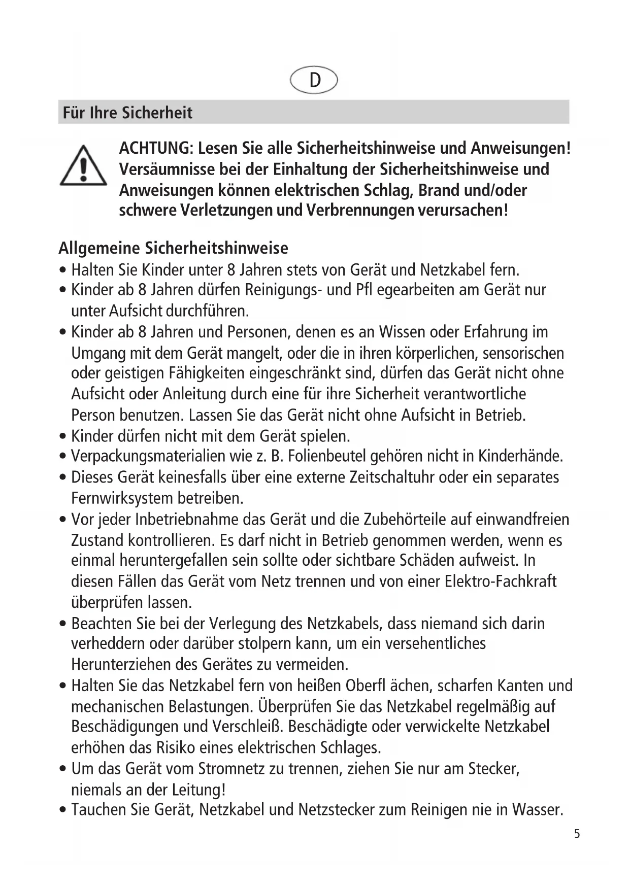 ACHTUNG: Lesen Sie alle Sicherheitshinweise und Anweisungen! Versäumnisse bei der Einhaltung der Sicherheitshinweise und Anweisungen können elektrischen Schlag, Brand und/oder schwere Verletzungen und Verbrennungen verursachen! Allgemeine Sicherheitshinweise