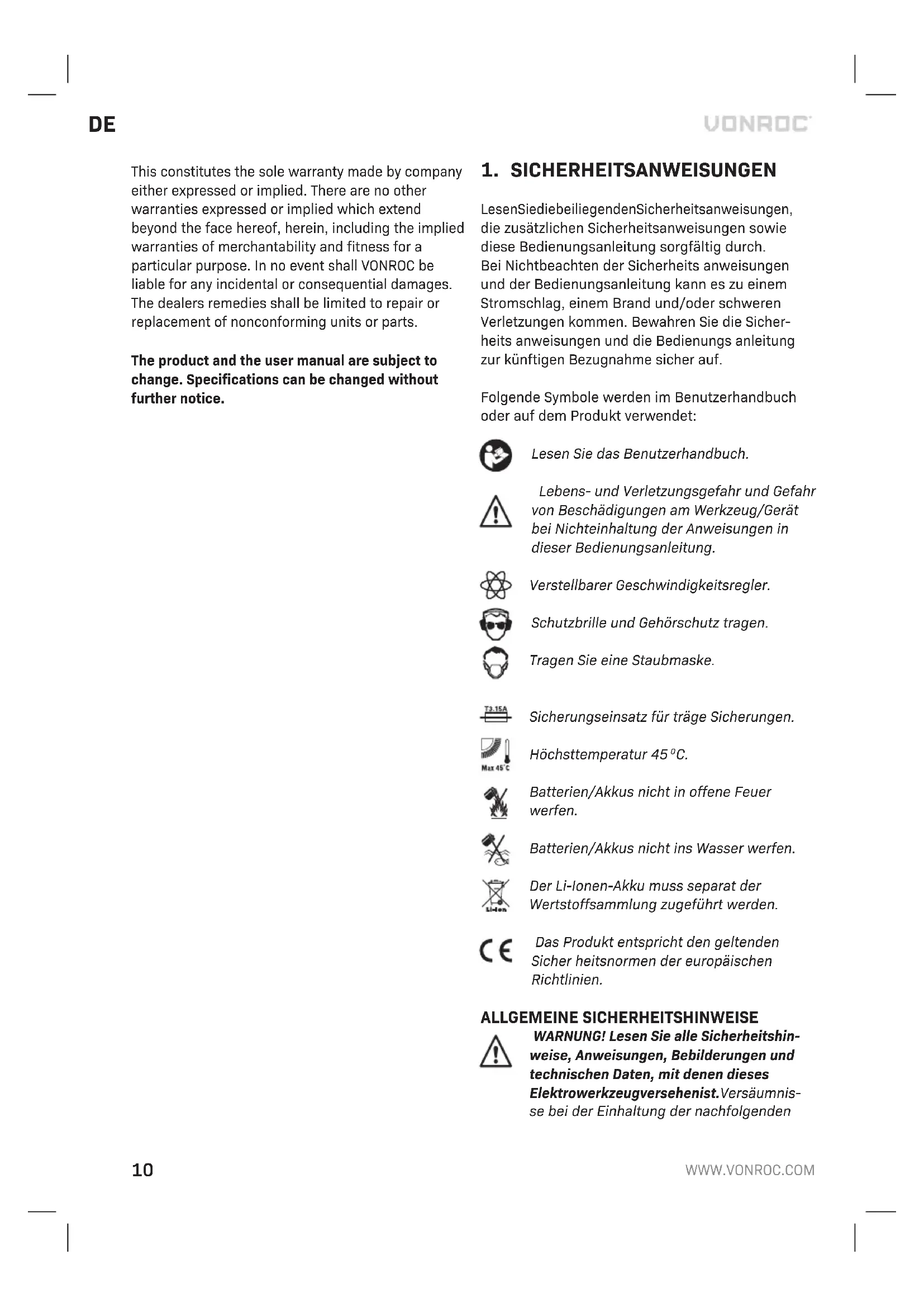 Es wurden keine Original-Ersatzteile verwendet. Dies stellt die einzige Gewährleistung des Unterne- hmens dar, sowohl ausdrücklich als auch implizit. Es gibt keine anderen ausdrücklichen oder stillsch- weigenden Garantien, die über das hier Genannte hinausgehen, einschließlich der stillschweigenden Garantien der Marktgängigkeit oder Eignung für einen bestimmten Zweck. In keinem Fall ist VONROC haftbar für Neben- oder Folgeschäden. Die Rechts- mittel des Händlers beschränken sich auf Reparatur oder Ersatz fehlerhafter Einheiten oder Teile. Am Produkt und am Benutzerhandbuch können Än- derungen vorgenommen werden. Die technischen Daten können sich ohne Vorankündigung ändern.18