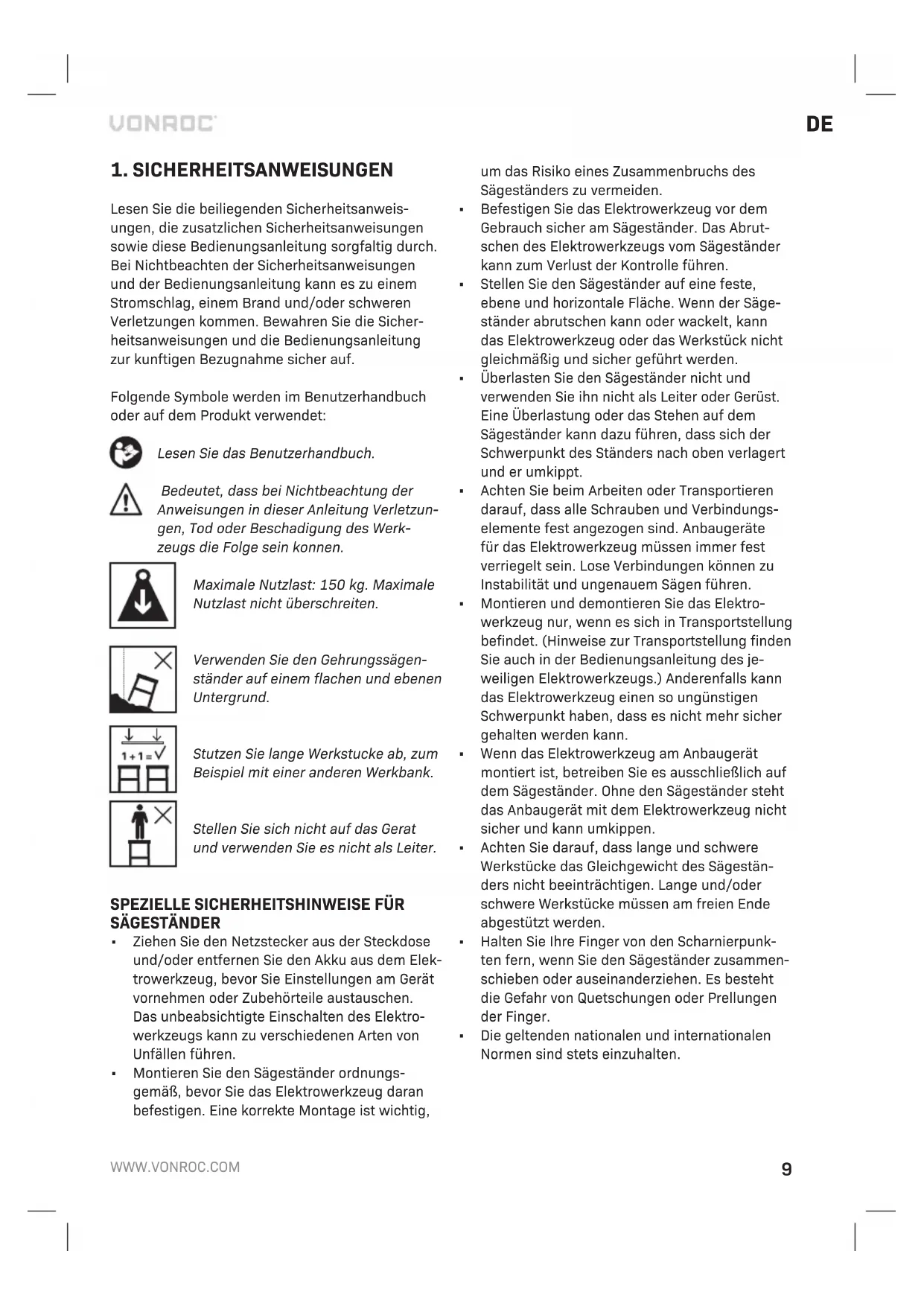 mit der montierten Tischmaschine auf dem Gehrungssägenständer, wie unter ‚Anbringen einer Gehrungssäge‘ beschrieben. Besuchen Sie www.vonroc.com oder wenden Sie sich an den Vonroc-Kundendienst, um die Univer- sal-Maschinenstützen MS807AA zu erwerben.12