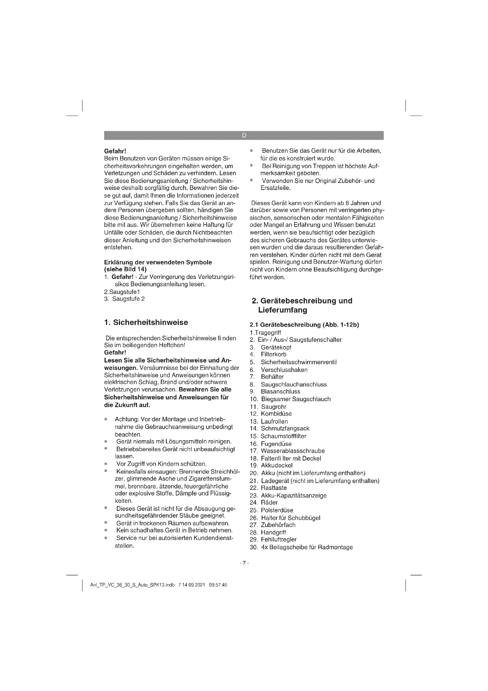 Montage des Gerätekopfes (Abb. 1,4) Der Gerätekopf (3) ist mit den Verschlusshaken (6) am Behälter (7) befestigt. Zum Abnehmen des Gerätekopfes (3) Verschlusshaken (6) öff nen und Gerätekopf (3) abnehmen. Bei Montage des Gerätekopfes (3) auf korrektes Einrasten der Verschlusshaken (6) achten. Montage der Räder (Abb. 5a-5g) Stecken Sie einen Sicherungssplint für Rad- montage (31) durch die entsprechende Bohrung in der Radachse (33) und führen Sie eine Bei- lagscheibe (30), ein Rad (24) und eine Beilags- scheibe über die Radachse (33) (Abb. 5a-5b). Nun schieben Sie die Radachse (33) durch die Anl_TP_VC_36_30_S_Auto_SPK13.indb 8 14.09.2021 09:57:45D