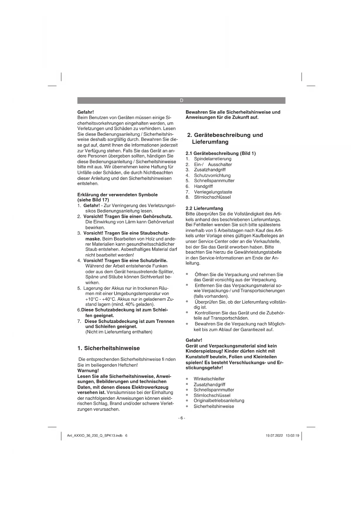 Der Motor muss während der Arbeit gut belüftet werden, daher müssen die Lüftungsöff nungen immer sauber gehalten werden. Achten Sie insbesondere bei den Schleifkörpern auf eine gute Lagerung und Transport. Setzen Sie die Schleifkörper niemals Stößen, Schlägen oder scharfen Kanten aus (z.B. beim Transport oder Lagerung in einer Werkzeugkiste). Dies könnte bei den Schleifkörpern zu Beschädigungen, wie z. B. Rissen führen und eine Gefahr für den Be- nutzer darstellen. Asbesthaltige Materialien dürfen nicht bearbeitet werden! Verwenden Sie niemals Trennscheiben zum Schruppschleifen. Hinweis: Zur Erhöhung der Leistung und Laufzeit des Ak- ku-Gerätes empfehlen wir Ihnen unseren 4,0Ah Power X-Change zu verwenden. (Art.-Nr.: 45.113.96) Anl_AXXIO_36_230_Q_SPK13.indb 10Anl_AXXIO_36_230_Q_SPK13.indb 10 19.07.2022 13:02:2119.07.2022 13:02:21D