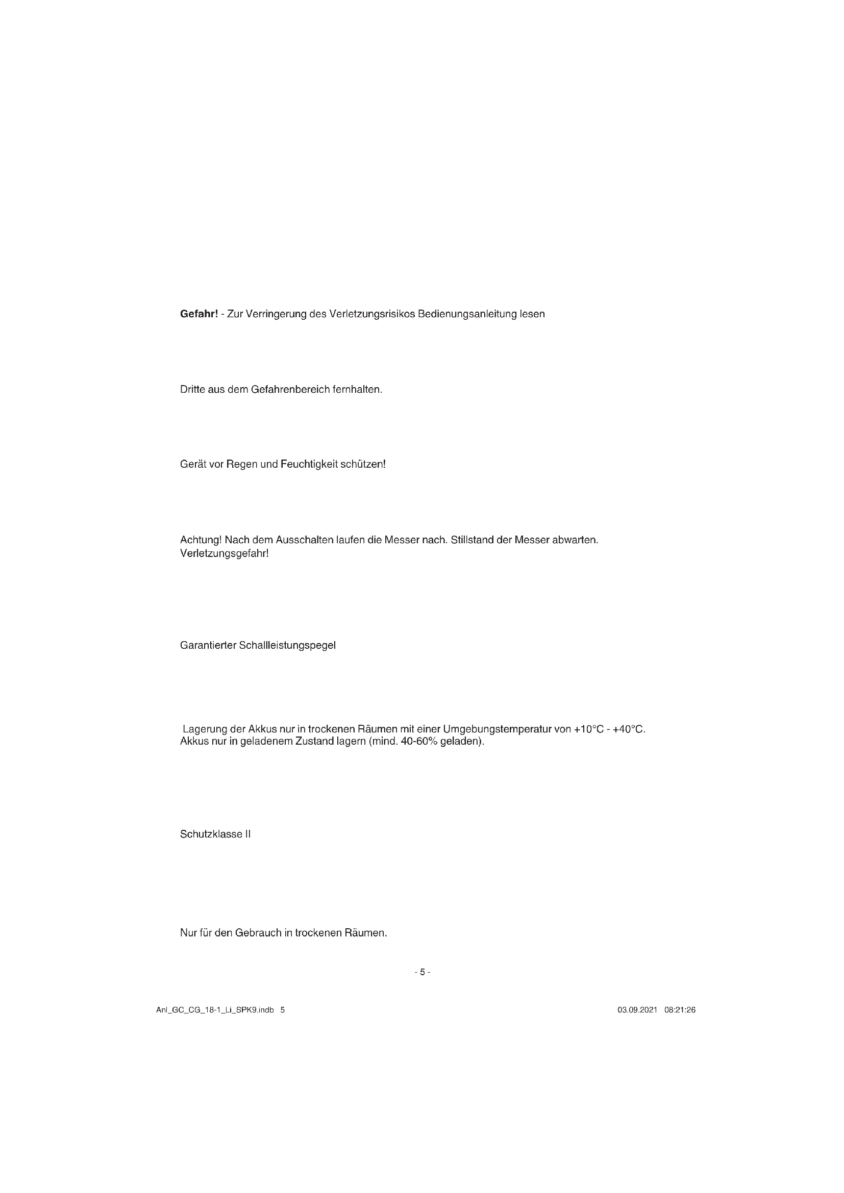 Gefahr! - Zur Verringerung des Verletzungsrisikos Bedienungsanleitung lesen Dritte aus dem Gefahrenbereich fernhalten. Achtung! Nach dem Ausschalten laufen die Messer nach. Stillstand der Messer abwarten. Verletzungsgefahr! Gerät vor Regen und Feuchtigkeit schützen! Lagerung der Akkus nur in trockenen Räumen mit einer Umgebungstemperatur von +10°C - +40°C. Akkus nur in geladenem Zustand lagern (mind. 40-60% geladen). Nur für den Gebrauch in trockenen Räumen. Schutzklasse II Garantierter Schallleistungspegel