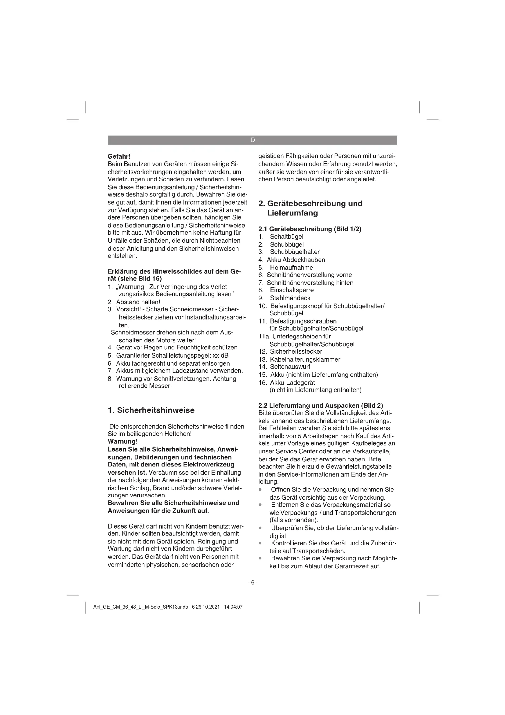 Bewahren Sie die Verpackung nach Möglich- keit bis zum Ablauf der Garantiezeit auf. Anl_GE_CM_36_48_Li_M-Solo_SPK13.indb 6 26.10.2021 14:04:07D