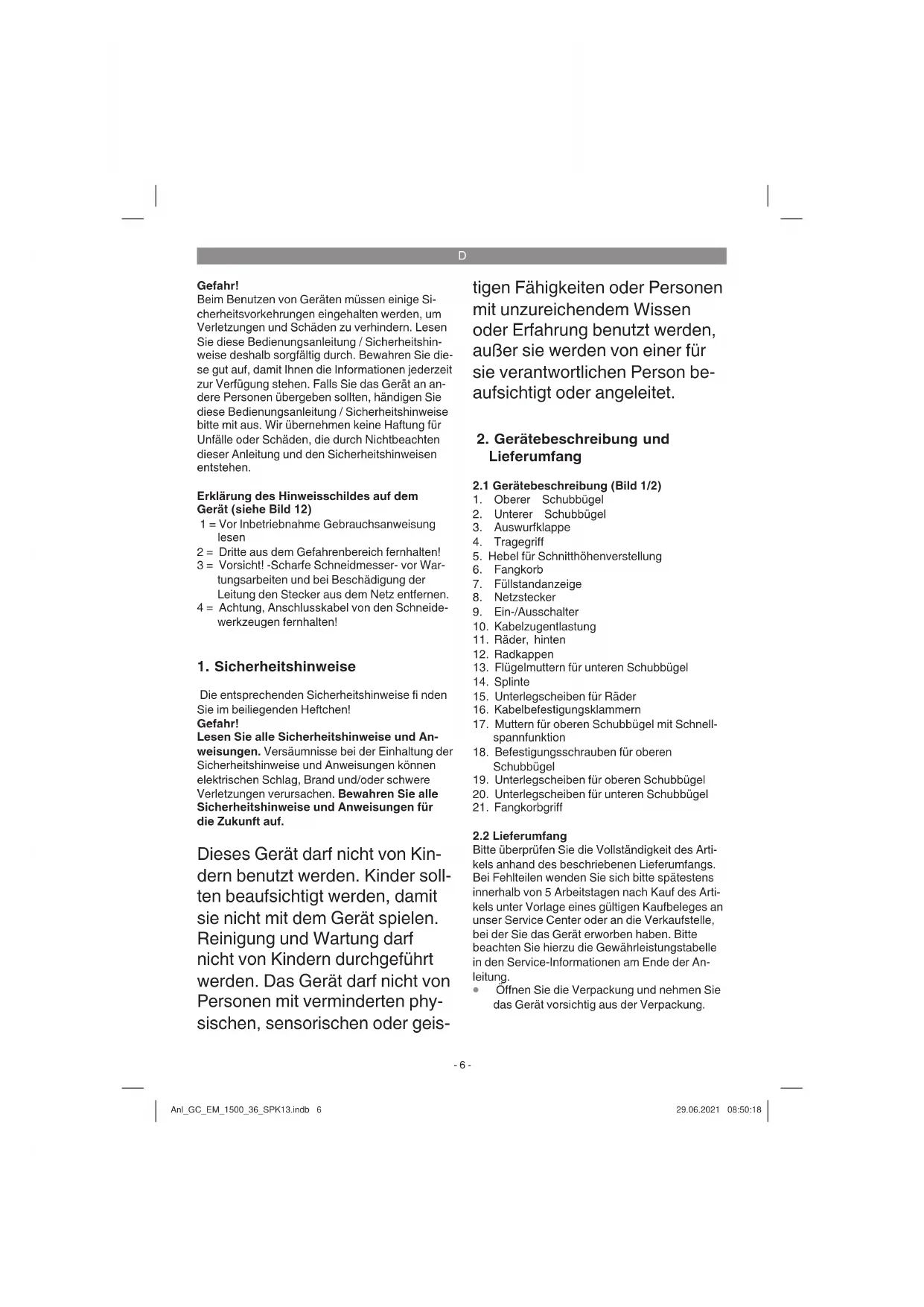 Verbinden Sie den Netzstecker (Bild 1/Pos. 8) mit einem Verlängerungskabel. Das Verlängerungs- kabel muss wie in Bild 10 dargestellt mit der Ka- belzugentlastung gesichert werden. Vorsicht! Um ein ungewolltes Einschalten zu verhindern, ist der Rasenmäher mit einer Einschaltsperre (Bild 10/ Pos. A) ausgestattet, die gedrückt werden muss, bevor der Schaltbügel (Bild 10 / Pos. B) ak- tiviert werden kann. Wird der Schaltbügel losge- lassen wird der Rasenmäher ausgeschaltet. Füh- ren Sie diesen Vorgang einige Male durch, damit Sie sicher sind, dass ihr Gerät korrekt funktioniert. Bevor Sie Reparatur oder Wartungsarbeiten am Gerät vornehmen, müssen Sie sich vergewissern, dass sich das Messer nicht dreht und das Gerät vom Netz getrennt ist. Warnung! Öff nen Sie die Auswurfklappe nie, wenn die Fangeinrichtung entleert wird und der Motor noch läuft. Umlaufendes Messer kann zu Verletzungen führen. Befestigen Sie die Auswurfklappe bzw. den Gras- fangkorb immer sorgfältig. Beim Entfernen vorher den Motor ausschalten. Der durch die Führungsholme gegebene Sicher- heitsabstand zwischen Messergehäuse und Benutzer ist stets einzuhalten. Beim Mähen und Fahrtrichtungsänderungen an Böschungen und Hängen ist besondere Vorsicht geboten. Achten Sie auf einen sicheren Stand, tragen Sie Schuhe mit rutschfesten, griffi gen Sohlen und lange Ho- sen. Mähen Sie immer quer zum Hang. Hänge über 15 Grad Schräge dürfen mit dem Rasenmäher aus Sicherheitsgründen nicht gemäht werden. Üben Sie besondere Vorsicht beim Rückwärts- bewegen und beim Ziehen des Rasenmähers. Stolpergefahr! Hinweise zum richtigen Mähen Beim Mähen wird eine überlappende Arbeitswei- se empfohlen. Nur mit scharfen, einwandfreien Messern schnei- den, damit die Grashalme nicht ausfransen und der Rasen nicht gelb wird. Zur Erzielung eines sauberen Schnittbildes den Rasenmäher in möglichst geraden Bahnen füh- Anl_GC_EM_1500_36_SPK13.indb 9Anl_GC_EM_1500_36_SPK13.indb 9 29.06.2021 08:50:1929.06.2021 08:50:19D