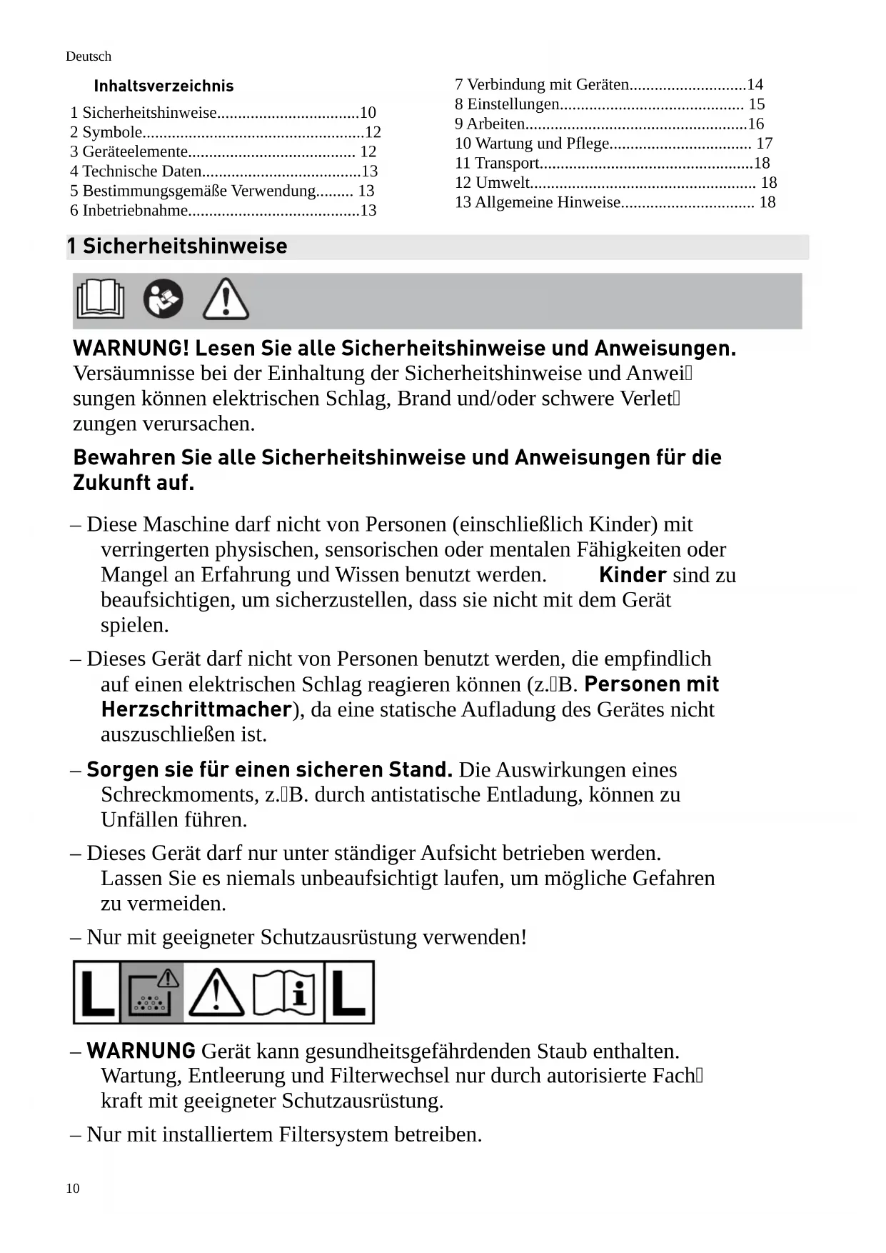 - 13 Allgemeine Hinweise 1 Sicherheitshinweise WARNUNG! Lesen Sie alle Sicherheitshinweise und Anweisungen. Versäumnisse bei der Einhaltung der Sicherheitshinweise und Anwei sungen können elektrischen Schlag, Brand und/oder schwere Verlet zungen verursachen. Bewahren Sie alle Sicherheitshinweise und Anweisungen für die Zukunft auf. – Diese Maschine darf nicht von Personen (einschließlich Kinder) mit verringerten physischen, sensorischen oder mentalen Fähigkeiten oder Mangel an Erfahrung und Wissen benutzt werden. Kinder sind zu beaufsichtigen, um sicherzustellen, dass sie nicht mit dem Gerät spielen. – Dieses Gerät darf nicht von Personen benutzt werden, die empfindlich auf einen elektrischen Schlag reagieren können (z.B. Personen mit Herzschrittmacher), da eine statische Aufladung des Gerätes nicht auszuschließen ist. – Sorgen sie für einen sicheren Stand. Die Auswirkungen eines Schreckmoments, z.B. durch antistatische Entladung, können zu Unfällen führen. – Dieses Gerät darf nur unter ständiger Aufsicht betrieben werden. Lassen Sie es niemals unbeaufsichtigt laufen, um mögliche Gefahren zu vermeiden. – Nur mit geeigneter Schutzausrüstung verwenden! – WARNUNG Gerät kann gesundheitsgefährdenden Staub enthalten. Wartung, Entleerung und Filterwechsel nur durch autorisierte Fach kraft mit geeigneter Schutzausrüstung. – Nur mit installiertem Filtersystem betreiben. Deutsch 10– ACHTUNG Dieses Gerät ist nur für den Gebrauch in Innenräumen bestimmt. Dieses Gerät darf nur in Innenräumen aufbewahrt werden. – WARNUNG Die Steckdose an der Maschine nur für die in den Anwei sungen festgelegten Zwecke verwenden. – WARNUNG Bei Austritt von Schaum oder Flüssigkeit Maschine sofort abschalten. – VORSICHT Die Wasserstandsbegrenzungseinrichtung regelmäßig reinigen und auf Anzeichen von Beschädigung untersuchen. – WARNUNG Bediener müssen angemessen in den Gebrauch dieser Maschinen unterwiesen werden. – WARNUNG Beim Absaugen von Stäuben, die den Grenzwert über schreiten oder bei erheblichem Umfang von Eichen- oder Buchenholz stäuben nur eine einzige Staubquelle (Elektro- oder Druckluftwerk zeug) absaugen. – Explosions- und Brandgefahr! Nicht aufsaugen: – Funken, glühende Teile oder heiße Stäube; – brennbare oder explosive Stoffe (z.B. Magnesium, Aluminium, Benzin, Verdünnung); – aggressive Stoffe (z.B. Säuren, Laugen, Lösungsmittel); – chemisch reaktive Stoffe, die zur Entstehung von Wärme, Säuren/ Basen, Gasen usw. führen (z.B. reaktive 2K-Materialien, Aluminium und Wasser). – Nationale Sicherheitsvorschriften sowie Angaben des Werkstoffhers tellers beachten! – Vor der Reinigung oder Wartung oder beim Austausch von Verbrauchs artikeln oder bei Umwandlung des Gerätes muss immer zuerst der Netzstecker aus der Steckdose gezogen werden. – Nur wenn nach Sichtprüfung intakt, in trockener Umgebung, nach Einweisung arbeiten! – Regelmäßig den Stecker, die Steckdose, das Kabel und den Filter prüfen, um eine Gefährdung zu vermeiden. Beschädigte elektrische Komponenten ausschließlich von einer autorisierten Kundendienst werkstatt erneuern lassen. – Verwenden Sie nur den original Festool Saugschlauch. Deutsch 11– Berücksichtigen Sie das Arbeitsumfeld und achten Sie beim Trans port oder beim Arbeiten mit dem Gerät auf sich selbst und Dritte. Dadurch vermeiden Sie z.B. Stolpergefahren durch Saugschlauch oder Netzleitung. – Tragen Sie das Gerät nur an dem dafür vorgesehenen Handgriff. – Nicht mittels Kranhaken oder Hebezeug hochheben und transpor tieren. – Halten Sie Verpackungsfolien von Kindern fern. Es besteht Erstickungsgefahr. 2 Symbole Warnung vor allgemeiner Gefahr Warnung vor Stromschlag Betriebsanleitung, Sicherheitshin weise lesen! Atemschutz tragen. Tipp, Hinweis Warnung! Das Gerät kann gesund heitsgefährdenden Staub enthalten! StaubklasseL (leichte Gefahr), geeignet zur Abscheidung von Staub mit einem Expositions-Grenzwert größer als 1 mg/m p. 18