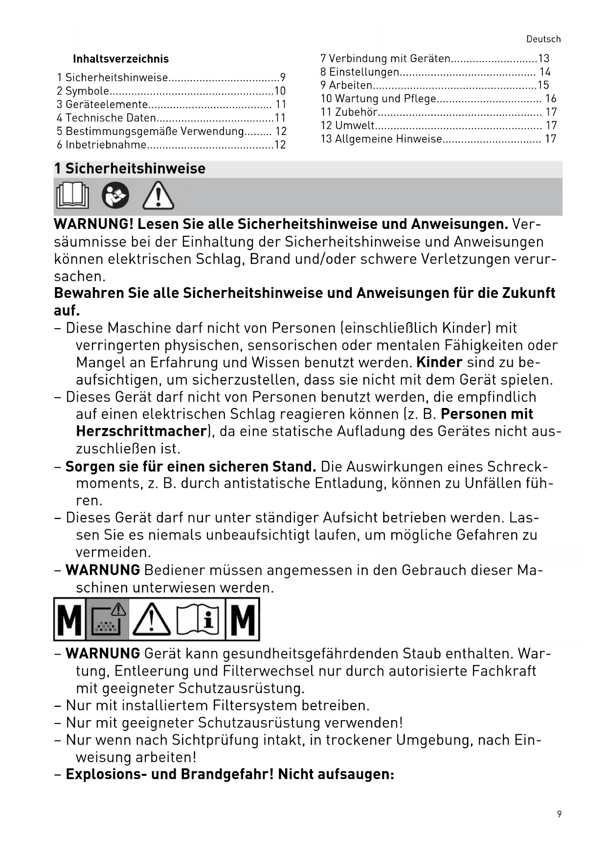 - 13 Allgemeine Hinweise 1 Sicherheitshinweise WARNUNG! Lesen Sie alle Sicherheitshinweise und Anweisungen. Ver säumnisse bei der Einhaltung der Sicherheitshinweise und Anweisungen können elektrischen Schlag, Brand und/oder schwere Verletzungen verur sachen. Bewahren Sie alle Sicherheitshinweise und Anweisungen für die Zukunft auf. – Diese Maschine darf nicht von Personen (einschließlich Kinder) mit verringerten physischen, sensorischen oder mentalen Fähigkeiten oder Mangel an Erfahrung und Wissen benutzt werden. Kinder sind zu be aufsichtigen, um sicherzustellen, dass sie nicht mit dem Gerät spielen. – Dieses Gerät darf nicht von Personen benutzt werden, die empfindlich auf einen elektrischen Schlag reagieren können (z.B. Personen mit Herzschrittmacher), da eine statische Aufladung des Gerätes nicht aus zuschließen ist. – Sorgen sie für einen sicheren Stand. Die Auswirkungen eines Schreck moments, z.B. durch antistatische Entladung, können zu Unfällen füh ren. – Dieses Gerät darf nur unter ständiger Aufsicht betrieben werden. Las sen Sie es niemals unbeaufsichtigt laufen, um mögliche Gefahren zu vermeiden. – WARNUNG Bediener müssen angemessen in den Gebrauch dieser Ma schinen unterwiesen werden. – WARNUNG Gerät kann gesundheitsgefährdenden Staub enthalten. War tung, Entleerung und Filterwechsel nur durch autorisierte Fachkraft mit geeigneter Schutzausrüstung. – Nur mit installiertem Filtersystem betreiben. – Nur mit geeigneter Schutzausrüstung verwenden! – Nur wenn nach Sichtprüfung intakt, in trockener Umgebung, nach Ein weisung arbeiten! – Explosions- und Brandgefahr! Nicht aufsaugen: Deutsch 9– Funken, glühende Teile oder heiße Stäube; – brennbare oder explosive Stoffe (z.B. Magnesium, Aluminium, Benzin, Verdünnung); – aggressive Stoffe (z.B. Säuren, Laugen, Lösungsmittel); – chemisch reaktive Stoffe, die zur Entstehung von Wärme, Säuren/Ba sen, Gasen usw. führen (z.B. reaktive 2K-Materialien, Aluminium und Wasser). – Nationale Sicherheitsvorschriften sowie Angaben des Werkstoffherstel lers beachten! p. 17