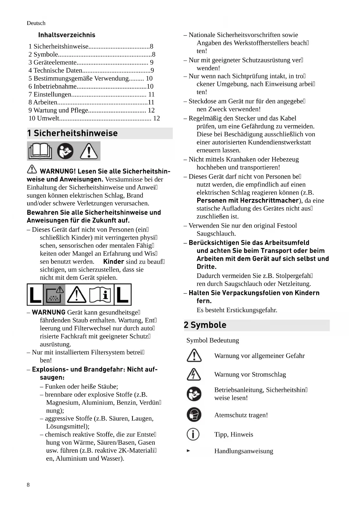 - 10 Umwelt 1 Sicherheitshinweise WARNUNG! Lesen Sie alle Sicherheitshin weise und Anweisungen. Versäumnisse bei der Einhaltung der Sicherheitshinweise und Anwei sungen können elektrischen Schlag, Brand und/oder schwere Verletzungen verursachen. Bewahren Sie alle Sicherheitshinweise und Anweisungen für die Zukunft auf. – Dieses Gerät darf nicht von Personen (ein schließlich Kinder) mit verringerten physi schen, sensorischen oder mentalen Fähig keiten oder Mangel an Erfahrung und Wis sen benutzt werden. Kinder sind zu beauf sichtigen, um sicherzustellen, dass sie nicht mit dem Gerät spielen. – WARNUNG Gerät kann gesundheitsge fährdenden Staub enthalten. Wartung, Ent leerung und Filterwechsel nur durch auto risierte Fachkraft mit geeigneter Schutz ausrüstung. – Nur mit installiertem Filtersystem betrei ben! – Explosions- und Brandgefahr: Nicht auf saugen: – Funken oder heiße Stäube; – brennbare oder explosive Stoffe (z.B. Magnesium, Aluminium, Benzin, Verdün nung); – aggressive Stoffe (z.B. Säuren, Laugen, Lösungsmittel); – chemisch reaktive Stoffe, die zur Entste hung von Wärme, Säuren/Basen, Gasen usw. führen (z.B. reaktive 2K-Materiali en, Aluminium und Wasser). – Nationale Sicherheitsvorschriften sowie Angaben des Werkstoffherstellers beach ten! – Nur mit geeigneter Schutzausrüstung ver wenden! – Nur wenn nach Sichtprüfung intakt, in tro ckener Umgebung, nach Einweisung arbei ten! – Steckdose am Gerät nur für den angegebe nen Zweck verwenden! – Regelmäßig den Stecker und das Kabel prüfen, um eine Gefährdung zu vermeiden. Diese bei Beschädigung ausschließlich von einer autorisierten Kundendienstwerkstatt erneuern lassen. – Nicht mittels Kranhaken oder Hebezeug hochheben und transportieren! – Dieses Gerät darf nicht von Personen be nutzt werden, die empfindlich auf einen elektrischen Schlag reagieren können (z.B. Personen mit Herzschrittmacher), da eine statische Aufladung des Gerätes nicht aus zuschließen ist. – Verwenden Sie nur den original Festool Saugschlauch. – Berücksichtigen Sie das Arbeitsumfeld und achten Sie beim Transport oder beim Arbeiten mit dem Gerät auf sich selbst und Dritte. Dadurch vermeiden Sie z.B. Stolpergefah ren durch Saugschlauch oder Netzleitung. – Halten Sie Verpackungsfolien von Kindern fern. Es besteht Erstickungsgefahr. 2 Symbole Symbol Bedeutung Warnung vor allgemeiner Gefahr Warnung vor Stromschlag Betriebsanleitung, Sicherheitshin weise lesen! Atemschutz tragen! Tipp, Hinweis Handlungsanweisung Deutsch 8Symbol Bedeutung Warnung! Das Gerät kann gesund heitsgefährdenden Staub enthalten! Nicht in den Hausmüll geben. 3 Geräteelemente [1-1] Ansaugöffnung [1-2] Modulsteckplatz (Druckluftmodul bei CTL 36/48 E LE, CTL 36/48 E LE AC, Steckdosenmodul bei CTL 26 E SD) [1-3] Gerätesteckdose [1-4] Schlauchdepot [1-5] Handgriff [1-6] SysDoc [1-7] Automatische Abreinigung (nur Vari anten mit AutoClean) [1-8] Geräteschalter [1-9] Saugkraftregulierung [1-10] Verschlussklammer [1-11] Schmutzbehälter [1-13] Bremse Die angegebenen Abbildungen befinden sich am Anfang der Betriebsanleitung. 4 Technische Daten Absaugmobile Leistungsaufnahme 350 ‑ 1200 W Anschlusswert an Geräte steckdose max. p. 12