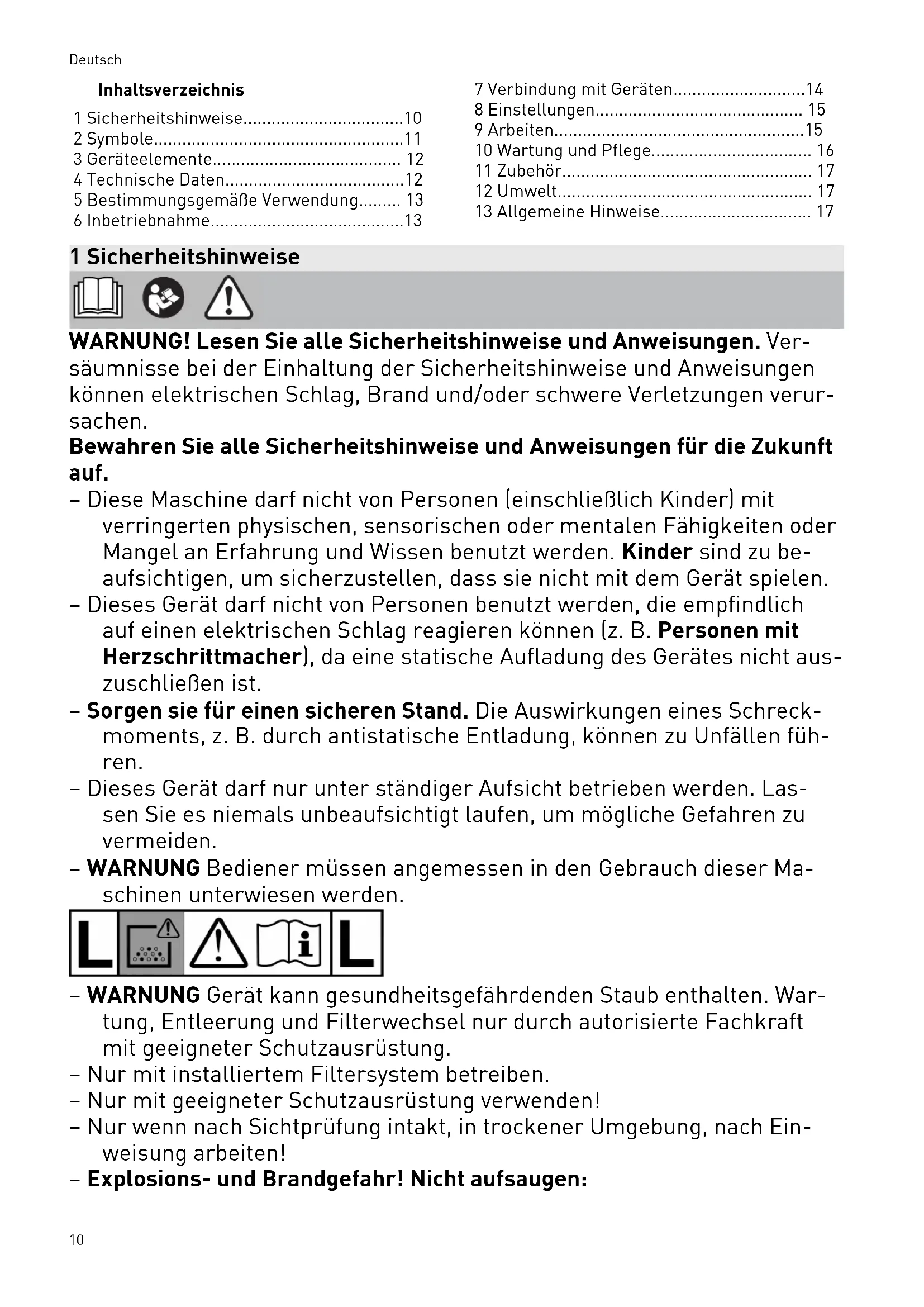 - 13 Allgemeine Hinweise 1 Sicherheitshinweise WARNUNG! Lesen Sie alle Sicherheitshinweise und Anweisungen. Ver säumnisse bei der Einhaltung der Sicherheitshinweise und Anweisungen können elektrischen Schlag, Brand und/oder schwere Verletzungen verur sachen. Bewahren Sie alle Sicherheitshinweise und Anweisungen für die Zukunft auf. – Diese Maschine darf nicht von Personen (einschließlich Kinder) mit verringerten physischen, sensorischen oder mentalen Fähigkeiten oder Mangel an Erfahrung und Wissen benutzt werden. Kinder sind zu be aufsichtigen, um sicherzustellen, dass sie nicht mit dem Gerät spielen. – Dieses Gerät darf nicht von Personen benutzt werden, die empfindlich auf einen elektrischen Schlag reagieren können (z.B. Personen mit Herzschrittmacher), da eine statische Aufladung des Gerätes nicht aus zuschließen ist. – Sorgen sie für einen sicheren Stand. Die Auswirkungen eines Schreck moments, z.B. durch antistatische Entladung, können zu Unfällen füh ren. – Dieses Gerät darf nur unter ständiger Aufsicht betrieben werden. Las sen Sie es niemals unbeaufsichtigt laufen, um mögliche Gefahren zu vermeiden. – WARNUNG Bediener müssen angemessen in den Gebrauch dieser Ma schinen unterwiesen werden. – WARNUNG Gerät kann gesundheitsgefährdenden Staub enthalten. War tung, Entleerung und Filterwechsel nur durch autorisierte Fachkraft mit geeigneter Schutzausrüstung. – Nur mit installiertem Filtersystem betreiben. – Nur mit geeigneter Schutzausrüstung verwenden! – Nur wenn nach Sichtprüfung intakt, in trockener Umgebung, nach Ein weisung arbeiten! – Explosions- und Brandgefahr! Nicht aufsaugen: Deutsch 10– Funken, glühende Teile oder heiße Stäube; – brennbare oder explosive Stoffe (z.B. Magnesium, Aluminium, Benzin, Verdünnung); – aggressive Stoffe (z.B. Säuren, Laugen, Lösungsmittel); – chemisch reaktive Stoffe, die zur Entstehung von Wärme, Säuren/Ba sen, Gasen usw. führen (z.B. reaktive 2K-Materialien, Aluminium und Wasser). – Nationale Sicherheitsvorschriften sowie Angaben des Werkstoffherstel lers beachten! p. 17