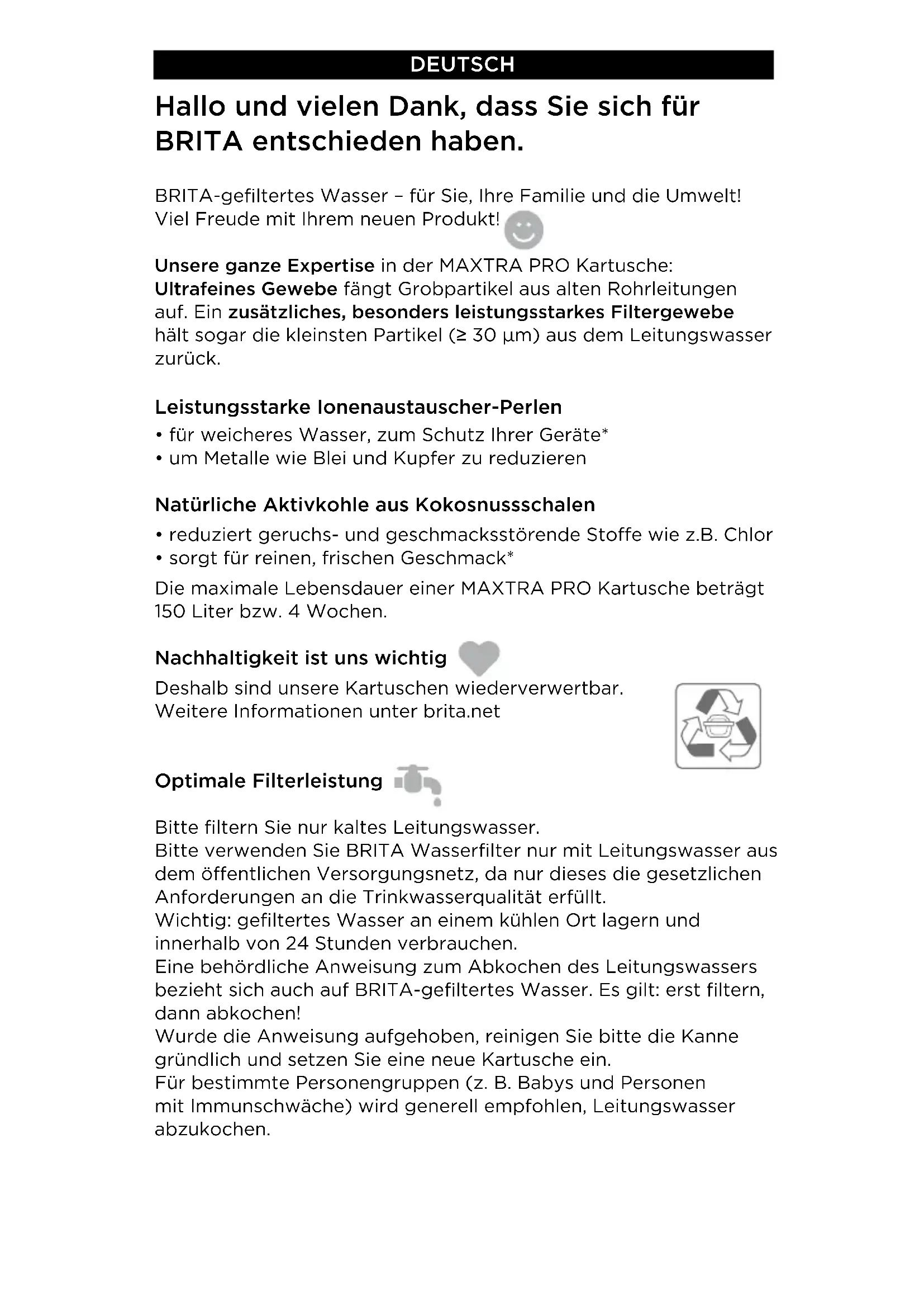 - sorgt für reinen, frischen Geschmack* Die maximale Lebensdauer einer MAXTRA PRO Kartusche beträgt 150Liter bzw. 4Wochen. Nachhaltigkeit ist uns wichtig Deshalb sind unsere Kartuschen wiederverwertbar. Weitere Informationen unter brita.net Optimale Filterleistung Bitte filtern Sie nur kaltes Leitungswasser. Bitte verwenden Sie BRITA Wasserfilter nur mit Leitungswasser aus dem öentlichen Versorgungsnetz, da nur dieses die gesetzlichen Anforderungen an die Trinkwasserqualität erfüllt. Wichtig: gefiltertes Wasser an einem kühlen Ort lagern und innerhalb von 24Stunden verbrauchen. Eine behördliche Anweisung zum Abkochen des Leitungswassers bezieht sich auch auf BRITA-gefiltertes Wasser. Es gilt: erst filtern, dann abkochen! Wurde die Anweisung aufgehoben, reinigen Sie bitte die Kanne gründlich und setzen Sie eine neue Kartusche ein. Für bestimmte Personengruppen (z.B. Babys und Personen mit Immunschwäche) wird generell empfohlen, Leitungswasser abzukochen.Höchste Qualität und Hygiene Mehr als 50Jahre Erfahrung mit Wasserfiltern stehen für: 9 Innovation 9 Höchste Qualität Um unsere hohen Qualitätsstandards zu erfüllen, führen wir strenge interne und externe Qualitätskontrollen durch. Jede MAXTRA PRO Kartusche wird bei der Herstellung aus Hygienegründen mit Heißdampf behandelt und anschließend in Schutzfolie verpackt. (Hinweis: Die Kartusche kann durch Kondensation nach der Dampfbehandlung feucht sein). Aus hygienischen Gründen wird das Filtermaterial der MAXTRA PRO Kartusche einer speziellen Behandlung mit Silber unterzogen. Es kann daher eine geringe Menge Silber an das Wasser abgegeben werden. Dies entspricht den Empfehlungen der Weltgesundheitsorganisation (WHO). BRITA empfiehlt, die Kartusche regelmäßig zu wechseln. Bitte befolgen Sie die empfohlene Reinigungsanleitung und die Hinweise zur Bedienung (Punkt 1–7). Die Kanne sollte regelmäßig gereinigt werden. Hinweis Bei längerer Nichtnutzung entfernen Sie bitte die Kartusche, leeren die Kanne aus und legen die Kartusche lose in den leeren Trichter. Siehe Punkt 7 „Wechsel der MAXTRA PRO Kartusche“. Bedienung– ganz einfach