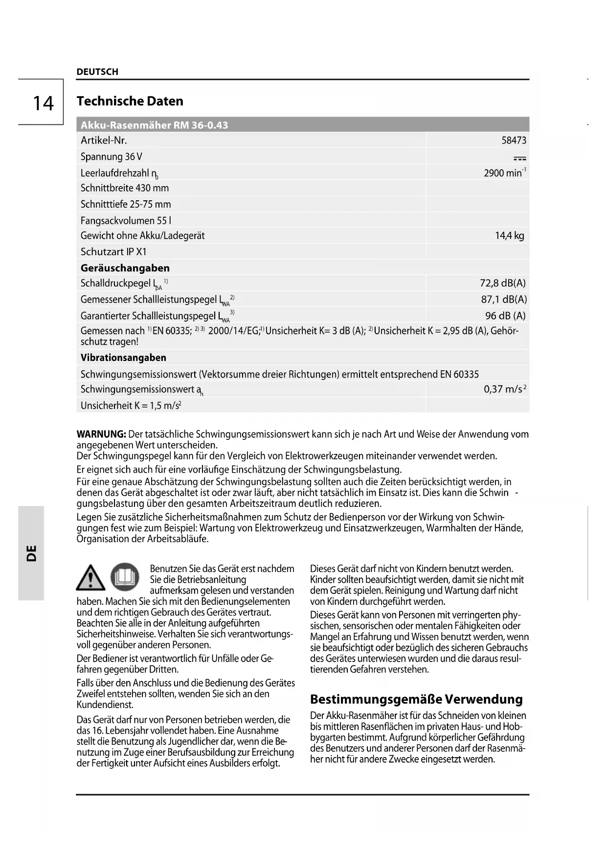 Technische Daten Akku-Rasenmäher RM 36-0.43 Artikel-Nr.