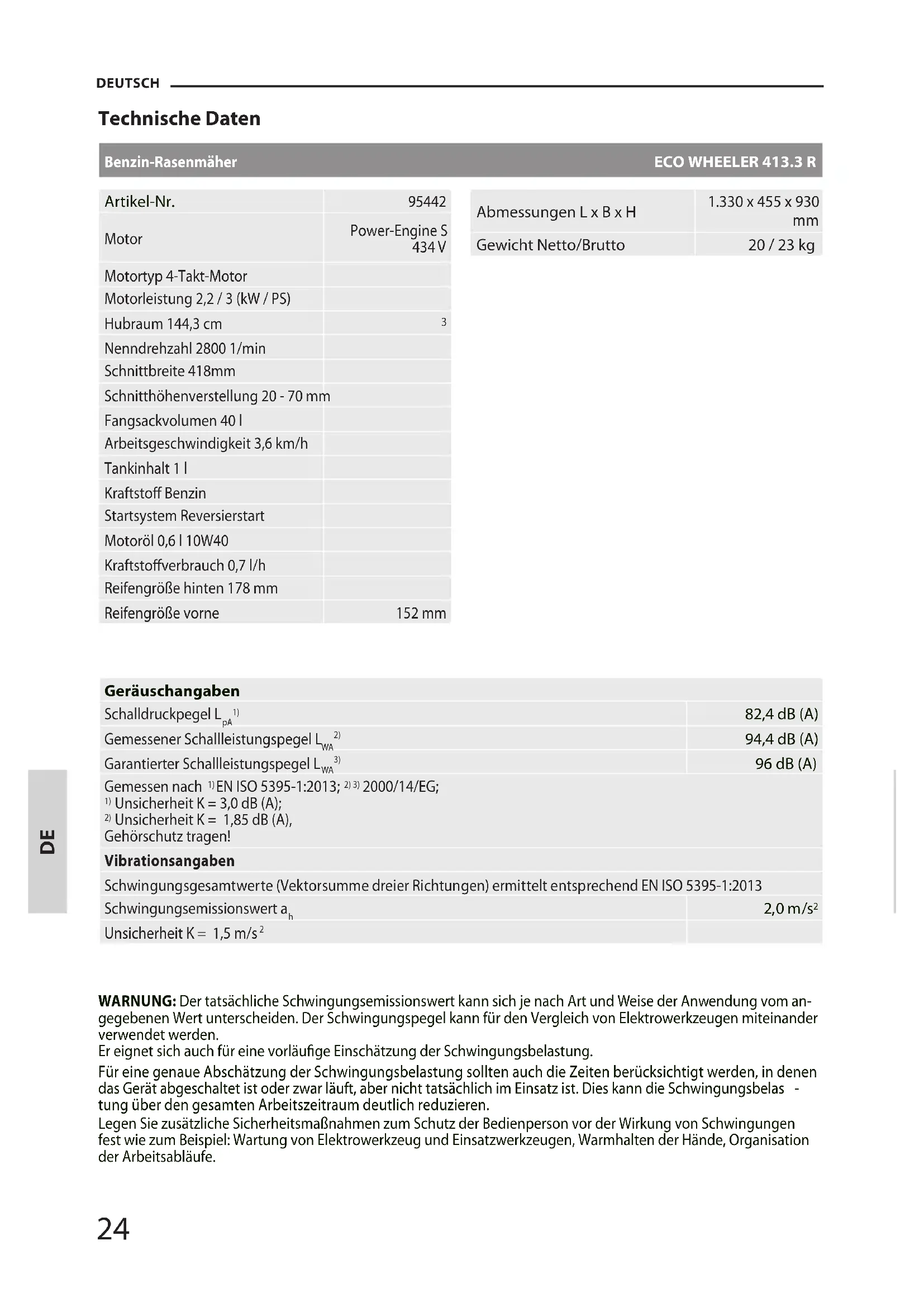 Unsicherheit K = 1,85 dB (A), Gehörschutz tragen! Vibrationsangaben Schwingungsgesamtwerte (Vektorsumme dreier Richtungen) ermittelt entsprechend EN ISO 5395-1:2013 Schwingungsemissionswert a