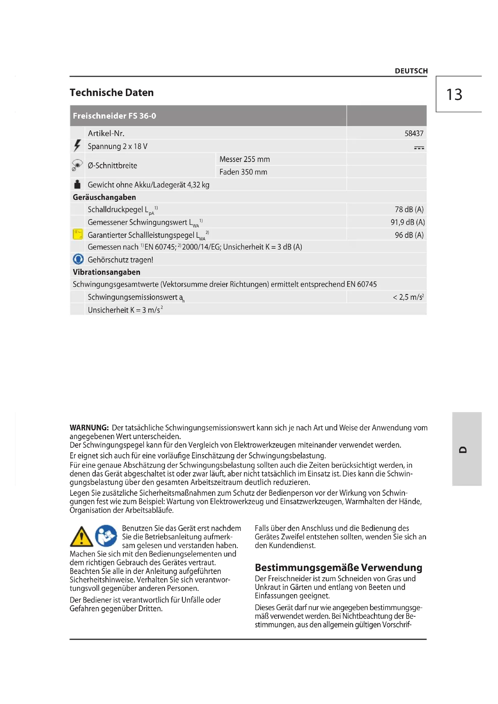 D13 DEUTSCH Benutzen Sie das Gerät erst nachdem Sie die Betriebsanleitung aufmerk- sam gelesen und verstanden haben. Machen Sie sich mit den Bedienungselementen und dem richtigen Gebrauch des Gerätes vertraut. Beachten Sie alle in der Anleitung aufgeführten Sicherheitshinweise. Verhalten Sie sich verantwor- tungsvoll gegenüber anderen Personen. Der Bediener ist verantwortlich für Unfälle oder Gefahren gegenüber Dritten. Falls über den Anschluss und die Bedienung des Gerätes Zweifel entstehen sollten, wenden Sie sich an den Kundendienst. Bestimmungsgemäße Verwendung Der Freischneider ist zum Schneiden von Gras und Unkraut in Gärten und entlang von Beeten und Einfassungen geeignet. Dieses Gerät darf nur wie angegeben bestimmungsge- mäß verwendet werden. Bei Nichtbeachtung derBe- stimmungen, aus den allgemein gültigen Vorschrif- Technische Daten Freischneider FS 36-0 Artikel-Nr.