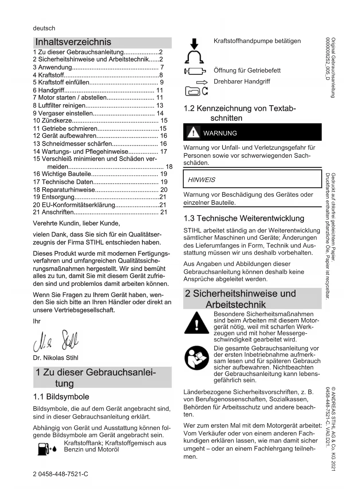 - 21 Anschriften Verehrte Kundin, lieber Kunde, vielen Dank, dass Sie sich für ein Qualitätser‐ zeugnis der Firma STIHL entschieden haben. Dieses Produkt wurde mit modernen Fertigungs‐ verfahren und umfangreichen Qualitätssiche‐ rungsmaßnahmen hergestellt. Wir sind bemüht alles zu tun, damit Sie mit diesem Gerät zufrie‐ den sind und problemlos damit arbeiten können. Wenn Sie Fragen zu Ihrem Gerät haben, wen‐ den Sie sich bitte an Ihren Händler oder direkt an unsere Vertriebsgesellschaft. Ihr Dr. Nikolas Stihl 1 Zu dieser Gebrauchsanlei‐ tung p. 21