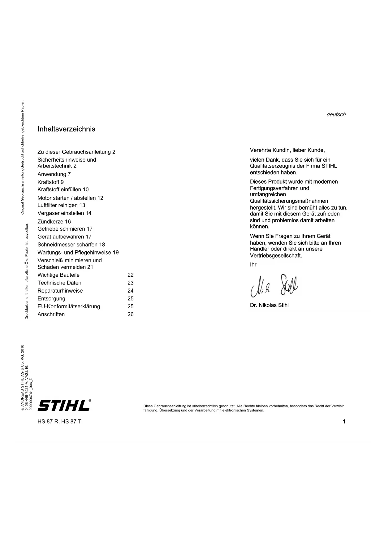fältigung, Übersetzung und der Verarbeitung mit elektronischen Systemen. Inhaltsverzeichnis Verehrte Kundin, lieber Kunde, vielen Dank, dass Sie sich für ein Qualitätserzeugnis der Firma STIHL entschieden haben. Dieses Produkt wurde mit modernen Fertigungsverfahren und umfangreichen Qualitätssicherungsmaßnahmen hergestellt. Wir sind bemüht alles zu tun, damit Sie mit diesem Gerät zufrieden sind und problemlos damit arbeiten können. Wenn Sie Fragen zu Ihrem Gerät haben, wenden Sie sich bitte an Ihren Händler oder direkt an unsere Vertriebsgesellschaft. Ihr Dr. Nikolas Stihl Zu dieser Gebrauchsanleitung 2 Sicherheitshinweise und Arbeitstechnik 2 Anwendung 7 Kraftstoff 9 Kraftstoff einfüllen 10 Motor starten / abstellen 12 Luftfilter reinigen 13 Vergaser einstellen 14 Zündkerze 16 Getriebe schmieren 17 Gerät aufbewahren 17 Schneidmesser schärfen 18 Wartungs- und Pflegehinweise 19 Verschleiß minimieren und Schäden vermeiden 21 Wichtige Bauteile 22 Technische Daten 23 Reparaturhinweise 24 Entsorgung 25 EU-Konformitätserklärung 25 Anschriften 26HS 87 R, HS 87 T deutsch