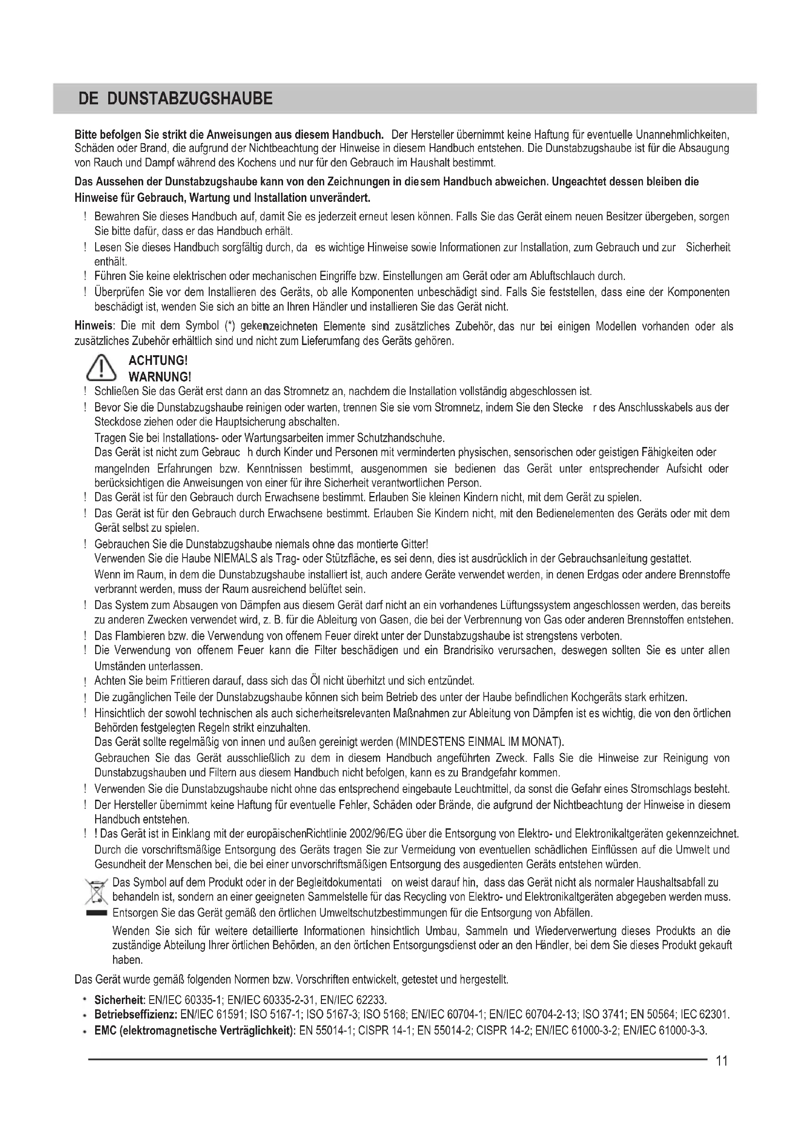 Bitte befolgen Sie strikt die Anweisungen aus diesem Handbuch. Der Hersteller übernimmt keine Haftung für eventuelle Unannehmlichkeiten, Schäden oder Brand, die aufgrund der Nichtbeachtung der Hinweise in diesem Handbuch entstehen. Die Dunstabzugshaube ist für die Absaugung von Rauch und Dampf während des Kochens und nur für den Gebrauch im Haushalt bestimmt. Das Aussehen der Dunstabzugshaube kann von den Zeichnungen in die sem Handbuch abweichen. Ungeachtet dessen bleiben die Hinweise für Gebrauch, Wartung und Installation unverändert. Bewahren Sie dieses Handbuch auf, damit Sie es jederzeit erneut lesen können. Falls Sie das Gerät einem neuen Besitzer übergeben, sorgen Sie bitte dafür, dass er das Handbuch erhält. Lesen Sie dieses Handbuch sorgfältig durch, da es wichtige Hinweise sowie Informationen zur Installation, zum Gebrauch und zur Sicherheit enthält. Führen Sie keine elektrischen oder mechanischen Eingriffe bzw. Einstellungen am Gerät oder am Abluftschlauch durch. Überprüfen Sie vor dem Installieren des Geräts, ob alle Komponenten unbeschädigt sind. Falls Sie feststellen, dass eine der Komponenten beschädigt ist, wenden Sie sich an bitte an Ihren Händler und installieren Sie das Gerät nicht. Hinweis: Die mit dem Symbol (*) geken nzeichneten Elemente sind zusätzliches Zubehör, das nur b ei einigen Modellen vorhanden oder als zusätzliches Zubehör erhältlich sind und nicht zum Lieferumfang des Geräts gehören. ACHTUNG! WARNUNG! Schließen Sie das Gerät erst dann an das Stromnetz an, nachdem die Installation vollständig abgeschlossen ist. Bevor Sie die Dunstabzugshaube reinigen oder warten, trennen Sie sie vom Stromnetz, indem Sie den Stecke r des Anschlusskabels aus der Steckdose ziehen oder die Hauptsicherung abschalten. Tragen Sie bei Installations- oder Wartungsarbeiten immer Schutzhandschuhe. Das Gerät ist nicht zum Gebrauc h durch Kinder und Personen mit verminderten physischen, sensorischen oder geistigen Fähigkeiten oder mangelnden Erfahrungen bzw. Kenntnissen bestimmt, ausgenommen sie bedienen das Gerät unter entsprechender Aufsicht oder berücksichtigen die Anweisungen von einer für ihre Sicherheit verantwortlichen Person. Das Gerät ist für den Gebrauch durch Erwachsene bestimmt. Erlauben Sie kleinen Kindern nicht, mit dem Gerät zu spielen. Das Gerät ist für den Gebrauch durch Erwachsene bestimmt. Erlauben Sie Kindern nicht, mit den Bedienelementen des Geräts oder mit dem Gerät selbst zu spielen. Gebrauchen Sie die Dunstabzugshaube niemals ohne das montierte Gitter! Verwenden Sie die Haube NIEM ALS als Trag- oder Stützfläche, es sei denn, dies ist ausdrücklich in der Gebrauchsanleitung gestattet. Wenn im Raum, in dem die Dunstabzugshaube installiert ist, auch andere Geräte verwendet werden, in denen Erdgas oder andere Brennstoffe verbrannt werden, muss der Raum ausreichend belüftet sein. Das System zum Absaugen von Dämpfen aus diesem Gerät darf nicht an ein vorhandenes Lüftungssystem angeschlossen werden, das bereits zu anderen Zwecken verwendet wird, z. B. für die Ableitun g von Gasen, die bei der Verbrennung von Gas oder anderen Brennstoffen entstehen. Das Flambieren bzw. die Verwendung von offenem Feuer direkt unter der Dunstabzugshaube ist strengstens verboten. Die Verwendung von offenem Feuer kann die Filter beschädigen und ein Brandrisiko verursachen, deswegen sollten Sie es unter allen Umständen unterlassen. Achten Sie beim Frittieren darauf, dass sich das Öl nich t überhitzt und sich entzündet. Die zugänglichen Teile der Dunstabzugshaube können sich beim Betrieb des unter der Haube befindlichen Kochgeräts stark erhitzen. Hinsichtlich der sowohl technischen als auch sicherheitsrelevanten Maßnahmen zur Ableitung von Dämpfen ist es wichtig, die von den örtlichen Behörden festgelegten Regeln strikt einzuhalten. Das Gerät sollte regelmäßig von innen und außen gereinigt werden (MINDESTENS EINMAL IM MONAT). Gebrauchen Sie das Gerät ausschließlich zu dem in diesem Handbuch angeführten Zweck. Falls Sie die Hinweise zur Reinigung von Dunstabzugshauben und Filtern au s diesem Handb uch nicht befolgen, kann es zu Brandgefahr kommen. Verwenden Sie die Dunstabzugshaube nicht ohne das entsprechend eingebaute Leuchtmittel, da sonst die Gefahr eines Stromschlags besteht. Der Hersteller übernimmt keine Haftung für eventuelle Fehler, Schäden oder Brände, die aufgrund der Nichtbeachtung der Hinweise in diesem Handbuch entstehen. ! Das Gerät ist in Einklang mit der europäischen Richtlinie 2002/96/EG über die Entsorgung von Elektro- und Elektronikaltgeräten gekennzeichnet. Durch die vorschriftsmäßige Entsorgung des Geräts tragen Sie zur Vermeidung von eventuellen schädlichen Einflüssen auf die Umwelt und Gesundheit der Menschen bei, die bei einer unvorschriftsmäßigen Entsorgung des ausgedienten Geräts entstehen würden. Das Symbol auf dem Produkt oder in der Begleitdokumentati on weist darauf hin, dass das Gerät nicht als normaler Haushaltsabfall zu behandeln ist, sondern an einer geeigneten Sammelstelle für das Recycling von Elektro- und Elektronikaltgeräten abgegeben werden muss. Entsorgen Sie das Gerät gemäß den örtlichen Umweltschutzbestimmungen für die Entsorgung von Abfällen. Wenden Sie sich für weitere detaillierte Informationen hinsichtlich Umbau, Sammeln und Wiederverwertung dieses Produkts an die zuständige Abteilung Ihrer örtlichen Behör den, an den örtl ichen Entsorgungsdienst oder an den H ändler, bei dem Sie dieses Produkt gekauft haben. Das Gerät wurde gemäß folgenden Normen bzw. Vorschriften entwickelt, getestet und hergestellt. Sicherheit: EN/IEC 60335-1; EN/IEC 60335-2-31, EN/IEC 62233. Betriebseffizienz: EN/IEC 61591; ISO 5167-1; ISO 5167-3; ISO 5168; EN/IEC 60704-1; EN/IEC 60704-2-13; ISO 3741; EN 50564; IEC 62301. EMC (elektromagnetische Verträglichke it): EN 55014-1; CISPR 14-1; EN 55014-2; CISPR 14-2; EN/IEC 61000-3-2; EN/IEC 61000-3-3.
