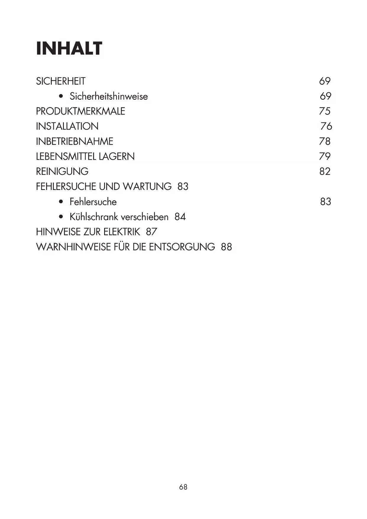 FEHLERSUCHE Stromausfall Öffnen Sie die Kühlschranktür nicht häuger als nötig. Kühlschrank ist außergewöhnlich kalt Möglicherweise haben Sie den Thermostat-Drehknopf versehentlich auf eine höhere Position eingestellt. Kühlschrank ist außergewöhnlich warm Der Kompressor ist möglicherweise nicht in Betrieb. Drehen Sie den Thermostatregler auf die maximale Einstellung und warten Sie ein paar Minuten. Wenn kein Brummgeräusch zu hören ist, funktioniert das Gerät nicht. Wenden Sie sich an das Geschäft, in dem Sie das Gerät gekauft haben. Kühlschrank funktioniert nicht Prüfen Sie, ob er eingesteckt und eingeschaltet ist. Prüfen Sie, ob die Sicherung im Stecker durchgebrannt ist. Der Kühlschrank sollte in einem gut belüfteten Raum aufgestellt werden. Lassen Sie den Kühlschrank 30 Minuten lang stehen. An der Außenseite des Kühlschranks bildet sich Kondenswasser Dies kann auf eine Änderung der Raumtemperatur zurückzuführen sein. Wischen Sie alle Rückstände von Feuchtigkeit ab. Wenn das Problem weiterhin besteht, wenden Sie sich bitte an den Händler, bei dem Sie das Gerät gekauft haben. Gurgeln, zischen Diese Geräusche werden durch die Zirkulation der Kältemittelüssigkeit im Kühlsystem verursacht. Seit der Einführung von FCKW-freien Gasen sind solche Geräusche stärker ausgeprägt. Es liegt keine Störung vor, und die Leistung Ihres Kühlschranks ist dadurch nicht beeinträchtigt.84 Brummen, schnurren oder pulsieren Solche Geräusche kommen vom Kompressormotor, der das Kältemittel durch das System pumpt.