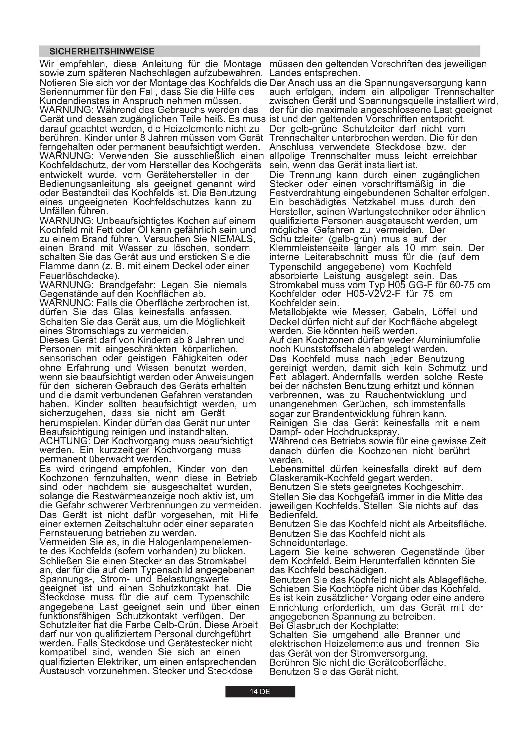814 g/h 220-240V 50/60Hz -14 DE WARNUNG: Verwenden Sie ausschließlich einen Kochfeldschutz, der vom Hersteller des Kochgeräts entwickelt wurde, vom Gerätehersteller in der Bedienungsanleitung als geeignet genannt wird oder Bestandteil des Kochfelds ist. Die Benutzung eines ungeeigneten Kochfeldschutzes kann zu Unfällen führen. Es wird dringend empfohlen, Kinder von den Kochzonen fernzuhalten, wenn diese in Betrieb sind oder nachdem sie ausgeschaltet wurden, solange die Restwärmeanzeige noch aktiv ist, um die Gefahr schwerer Verbrennungen zu vermeiden. Schließen Sie einen Stecker an das Stromkabel an, der für die auf dem Typenschild angegebenen Spannungs-, Strom- und Belastungswerte geeignet ist und einen Schutzkontakt hat. Die Steckdose muss für die auf dem Typenschild angegebene Last geeignet sein und über einen funktionsfähigen Schutzkontakt verfügen. Der Schutzleiter hat die Farbe Gelb-Grün. Diese Arbeit darf nur von qualifiziertem Personal durchgeführt werden. Falls Steckdose und Gerätestecker nicht kompatibel sind, wenden Sie sich an einen qualifizierten Elektriker, um einen entsprechenden Austausch vorzunehmen. Stecker und Steckdose WARNUNG: Unbeaufsichtigtes Kochen auf einem Kochfeld mit Fett oder Öl kann gefährlich sein und zu einem Brand führen. Versuchen Sie NIEMALS, einen Brand mit Wasser zu löschen, sondern schalten Sie das Gerät aus und ersticken Sie die Flamme dann (z. B. mit einem Deckel oder einer Feuerlöschdecke). Dieses Gerät darf von Kindern ab 8 Jahren und Personen mit eingeschränkten körperlichen, sensorischen oder geistigen Fähigkeiten oder ohne Erfahrung und Wissen benutzt werden, wenn sie beaufsichtigt werden oder Anweisungen für den sicheren Gebrauch des Geräts erhalten und die damit verbundenen Gefahren verstanden haben. Kinder sollten beaufsichtigt werden, um sicherzugehen, dass sie nicht am Gerät herumspielen. Kinder dürfen das Gerät nur unter Beaufsichtigung reinigen und instandhalten. ACHTUNG: Der Kochvorgang muss beaufsichtigt werden. Ein kurzzeitiger Kochvorgang muss permanent überwacht werden. WARNUNG: Falls die Oberfläche zerbrochen ist, dürfen Sie das Glas keinesfalls anfassen. Schalten Sie das Gerät aus, um die Möglichkeit eines Stromschlags zu vermeiden. Vermeiden Sie es, in die Halogenlampenelemen- te des Kochfelds (sofern vorhanden) zu blicken. WARNUNG: Brandgefahr: Legen Sie niemals Gegenstände auf den Kochflächen ab. Das Gerät ist nicht dafür vorgesehen, mit Hilfe einer externen Zeitschaltuhr oder einer separaten Fernsteuerung betrieben zu werden. WARNUNG: Während des Gebrauchs werden das Gerät und dessen zugänglichen Teile heiß. Es muss darauf geachtet werden, die Heizelemente nicht zu berühren. Kinder unter 8 Jahren müssen vom Gerät ferngehalten oder permanent beaufsichtigt werden. Wir empfehlen, diese Anleitung für die Montage sowie zum späteren Nachschlagen aufzubewahren. Notieren Sie sich vor der Montage des Kochfelds die Seriennummer für den Fall, dass Sie die Hilfe des Kundendienstes in Anspruch nehmen müssen. SICHERHEITSHINWEISE Reinigen Sie das Gerät keinesfalls mit einem Dampf- oder Hochdruckspray. Benutzen Se das Gerät ncht. müssen den geltenden Vorschriften des jeweiligen Landes entsprechen. Metallobjekte wie Messer, Gabeln, Löffel und Deckel dürfen nicht auf der Kochfläche abgelegt werden. Sie könnten heiß werden. Benutzen Sie stets geeignetes Kochgeschirr. Der Anschluss an die Spannungsversorgung kann auch erfolgen, indem ein allpoliger Trennschalter zwischen Gerät und Spannungsquelle installiert wird, der für die maximale angeschlossene Last geeignet ist und den geltenden Vorschriften entspricht. Ein beschädigtes Netzkabel muss durch den Hersteller, seinen Wartungstechniker oder ähnlich qualifizierte Personen ausgetauscht werden, um mögliche Gefahren zu vermeiden. Der Schu tzleiter (gelb-grün) mus s auf der Klemmleistenseite länger als 10 mm sein. Der interne Leiterabschnitt muss für die (auf dem Typenschild angegebene) vom Kochfeld absorbierte Leistung ausgelegt sein. Das Stromkabel muss vom Typ H05 GG-F für 60-75 cm Kochfelder oder H05-V2V2-F für 75 cm Kochfelder sein. Auf den Kochzonen dürfen weder Aluminiumfolie noch Kunststoffschalen abgelegt werden. Stellen Sie das Kochgefäß immer in die Mitte des jeweiligen Kochfelds. Stellen Sie nichts auf das Bedienfeld. Schieben Sie Kochtöpfe nicht über das Kochfeld. Das Kochfeld muss nach jeder Benutzung gereinigt werden, damit sich kein Schmutz und Fett ablagert. Andernfalls werden solche Reste bei der nächsten Benutzung erhitzt und können verbrennen, was zu Rauchentwicklung und unangenehmen Gerüchen, schlimmstenfalls sogar zur Brandentwicklung führen kann. Benutzen Sie das Kochfeld nicht als Schneidunterlage. Es st ken zusätzlcher Vorgang oder ene andere Enrchtung erforderlch, um das Gerät mt der angegebenen Spannung zu betreben. Schalten Se umgehend alle Brenner und elektrschen Hezelemente aus und trennen Se das Gerät von der Stromversorgung. Berühren Se ncht de Geräteoberfläche. Der gelb-grüne Schutzleiter darf nicht vom Trennschalter unterbrochen werden. Die für den Anschluss verwendete Steckdose bzw. der allpolige Trennschalter muss leicht erreichbar sein, wenn das Gerät installiert ist. Die Trennung kann durch einen zugänglichen Stecker oder einen vorschriftsmäßig in die Festverdrahtung eingebundenen Schalter erfolgen. Lagern Sie keine schweren Gegenstände über dem Kochfeld. Beim Herunterfallen könnten Sie das Kochfeld beschädigen. Lebensmittel dürfen keinesfalls direkt auf dem Glaskeramik-Kochfeld gegart werden. Während des Betriebs sowie für eine gewisse Zeit danach dürfen die Kochzonen nicht berührt werden. Benutzen Sie das Kochfeld nicht als Arbeitsfläche. Benutzen Sie das Kochfeld nicht als Ablagefläche. Be Glasbruch der Kochplatte:15 DE Wenn unter der Kochmulde ein zugängliches Möbelteil vorhanden ist, muss zwischen der Kochmulde und der unteren Möbelnische eine Trennplatte 