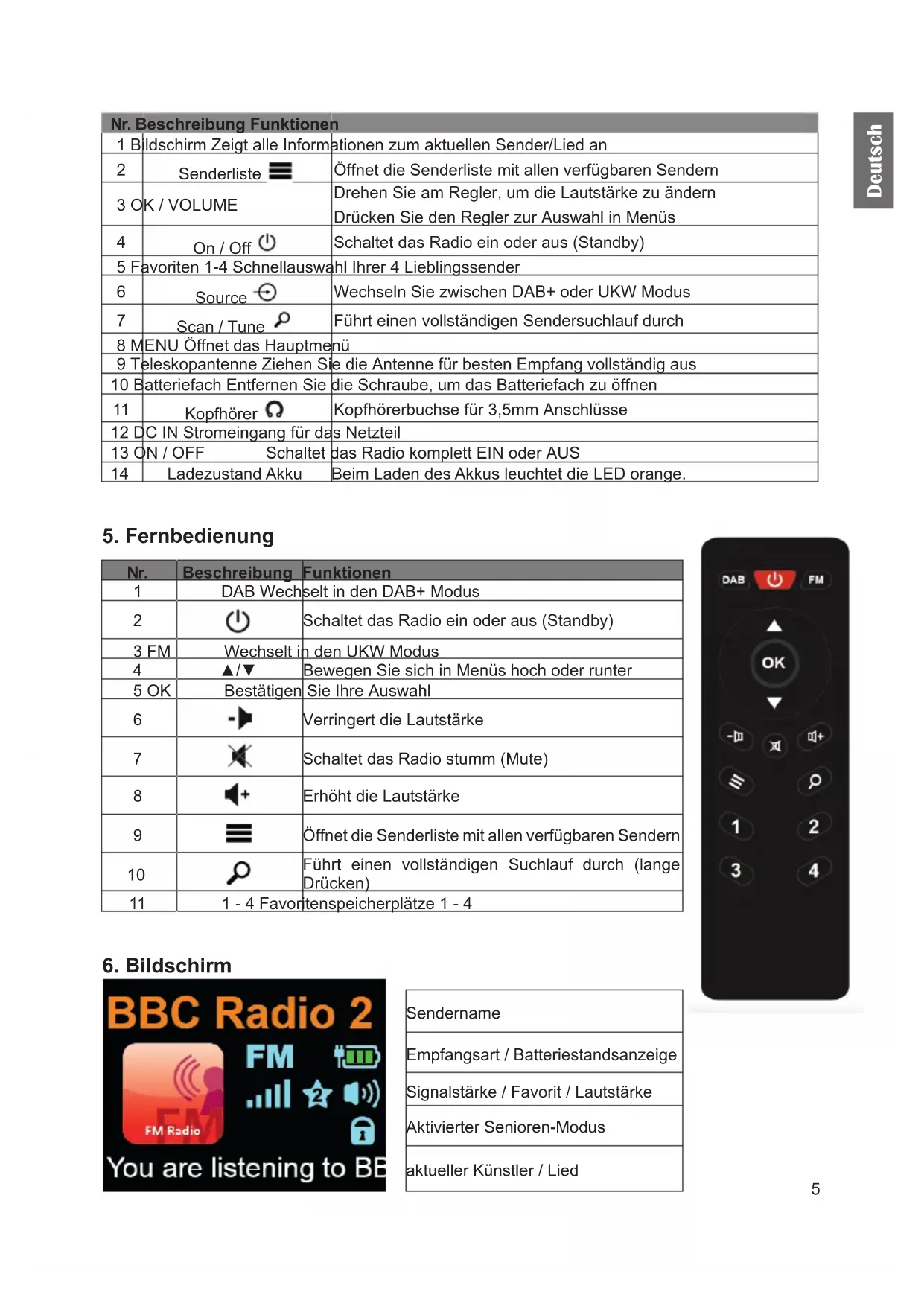 Deutsch Nr. Beschreibung Funktionen 1 Bildschirm Zeigt alle Informationen zum aktuellen Sender/Lied an
