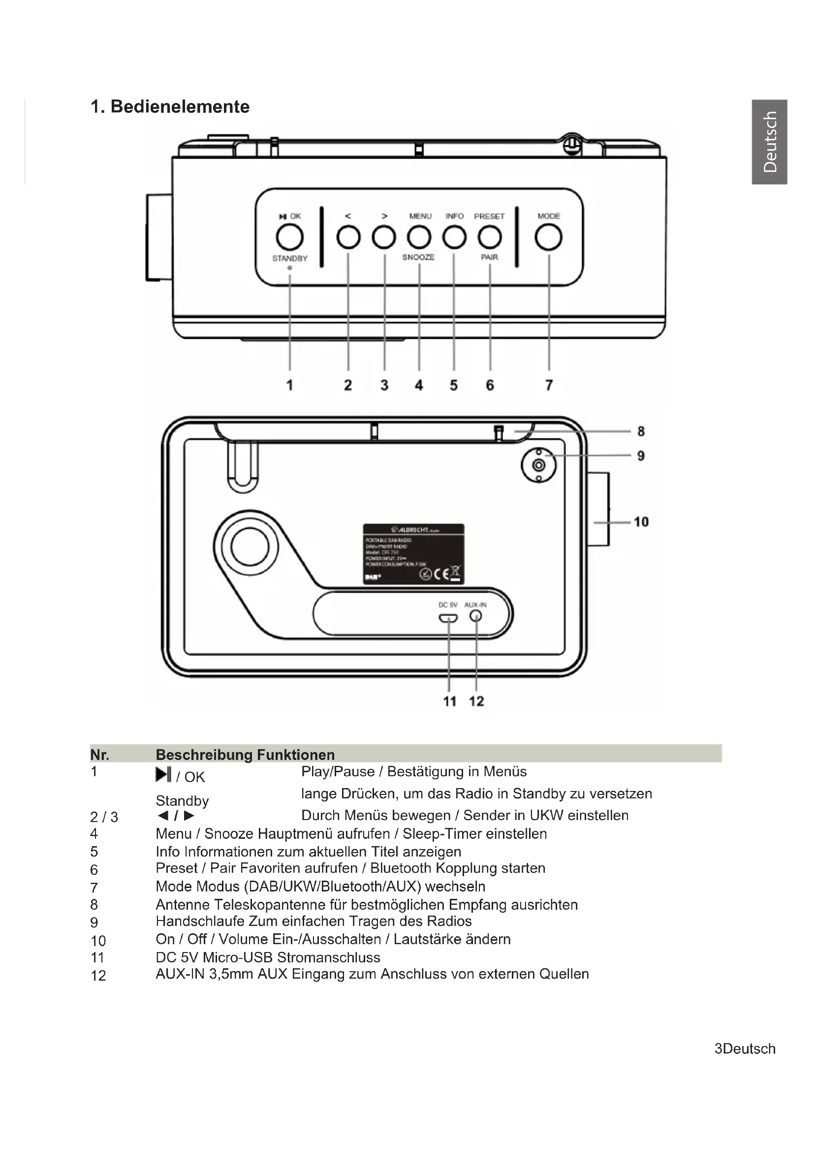 AUX-IN 3,5mm AUX Eingang zum Anschluss von externen Quellen4 Deutsch Deutsch