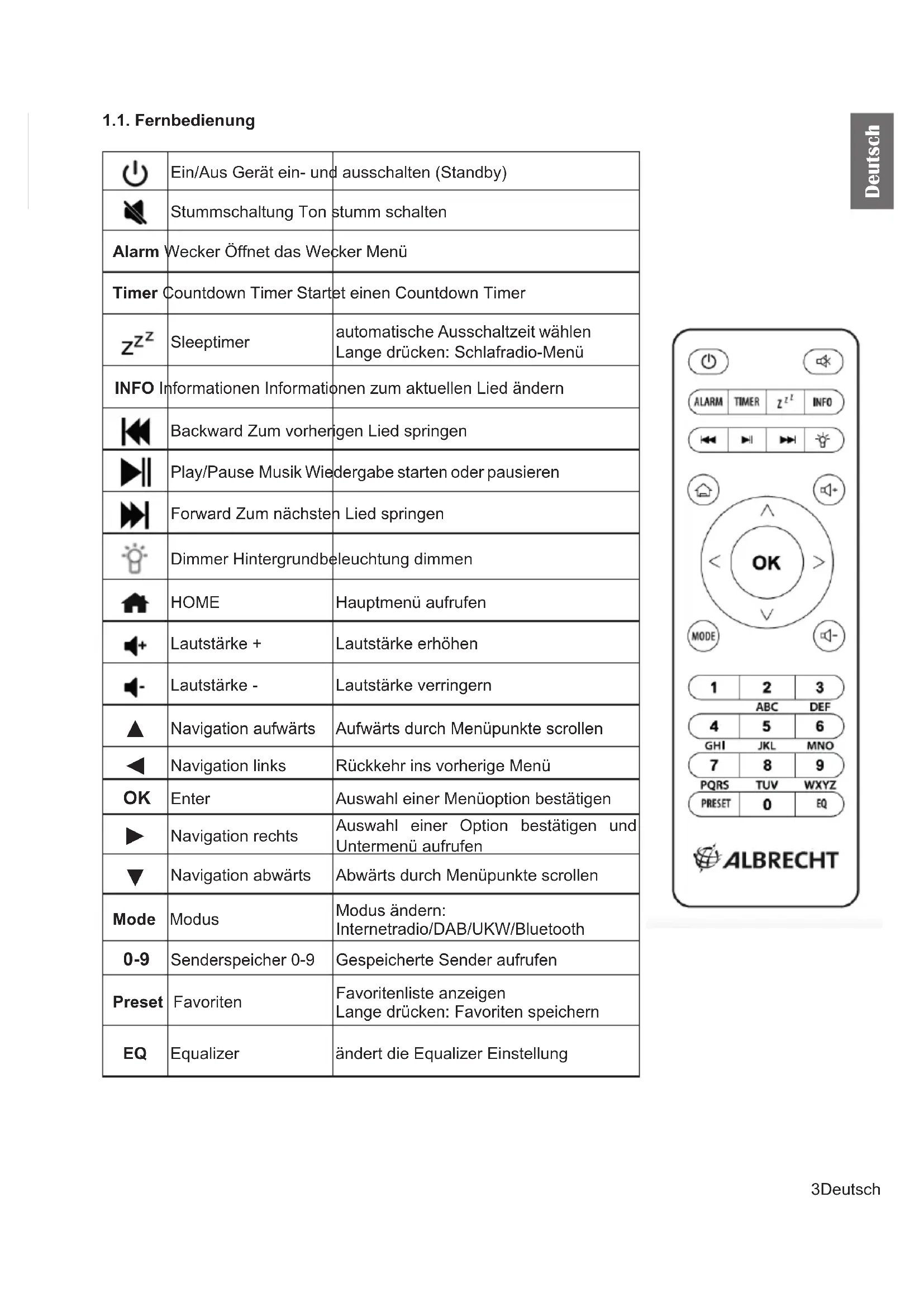 Navigation abwärts Abwärts durch Menüpunkte scrollen Mode Modus Modus ändern: Internetradio/DAB/UKW/Bluetooth 0-9 Senderspeicher 0-9 Gespeicherte Sender aufrufen Preset Favoriten Favoritenliste anzeigen Lange drücken: Favoriten speichern EQ Equalizer ändert die Equalizer Einstellung4 Deutsch Deutsch