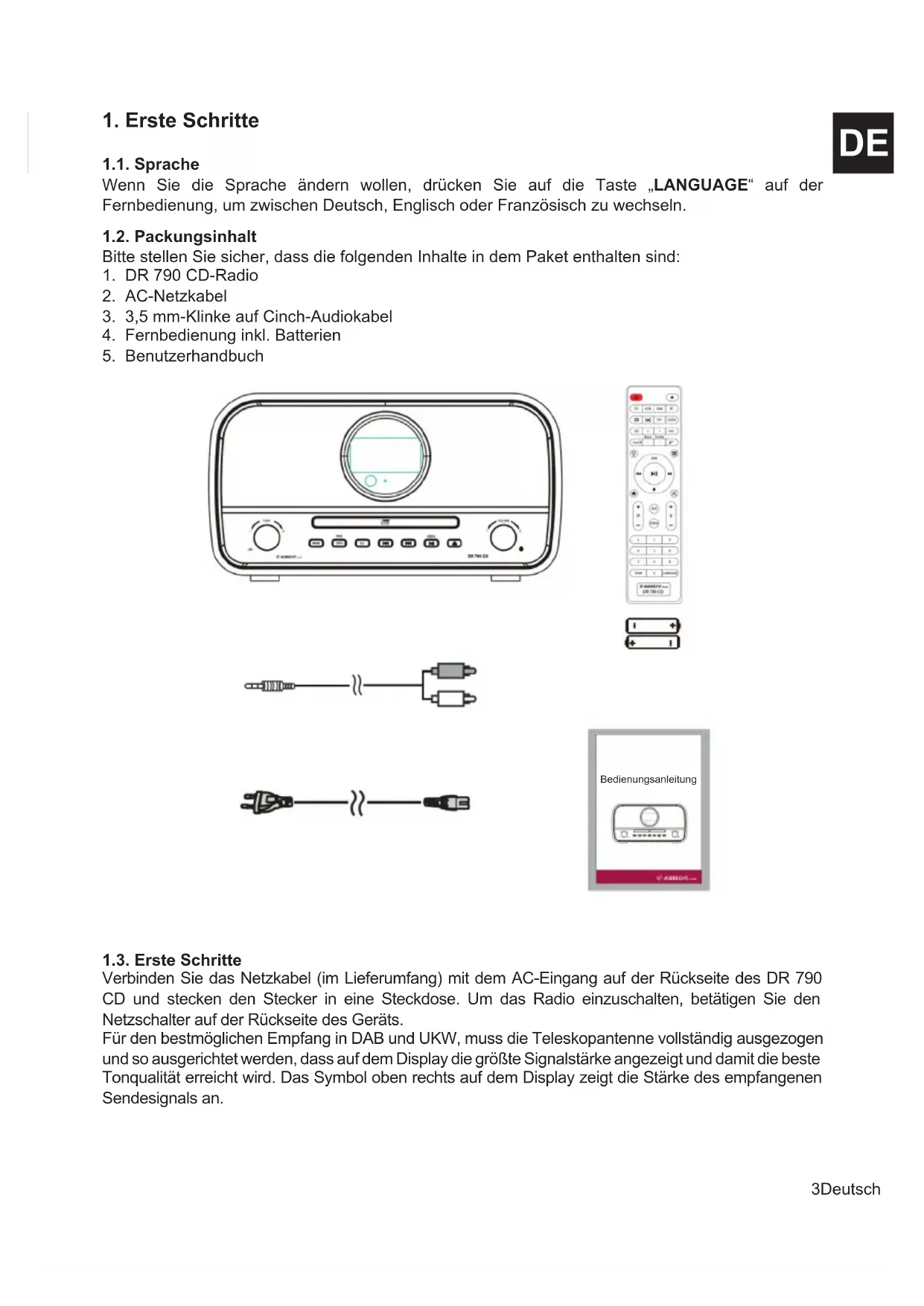 Bedienungsanleitung 1.3. Erste Schritte Verbinden Sie das Netzkabel (im Lieferumfang) mit dem AC-Eingang auf der Rückseite des DR 790 CD und stecken den Stecker in eine Steckdose. Um das Radio einzuschalten, betätigen Sie den Netzschalter auf der Rückseite des Geräts. Für den bestmöglichen Empfang in DAB und UKW, muss die Teleskopantenne vollständig ausgezogen und so ausgerichtet werden, dass auf dem Display die größte Signalstärke angezeigt und damit die beste Tonqualität erreicht wird. Das Symbol oben rechts auf dem Display zeigt die Stärke des empfangenen Sendesignals an.4 Deutsch