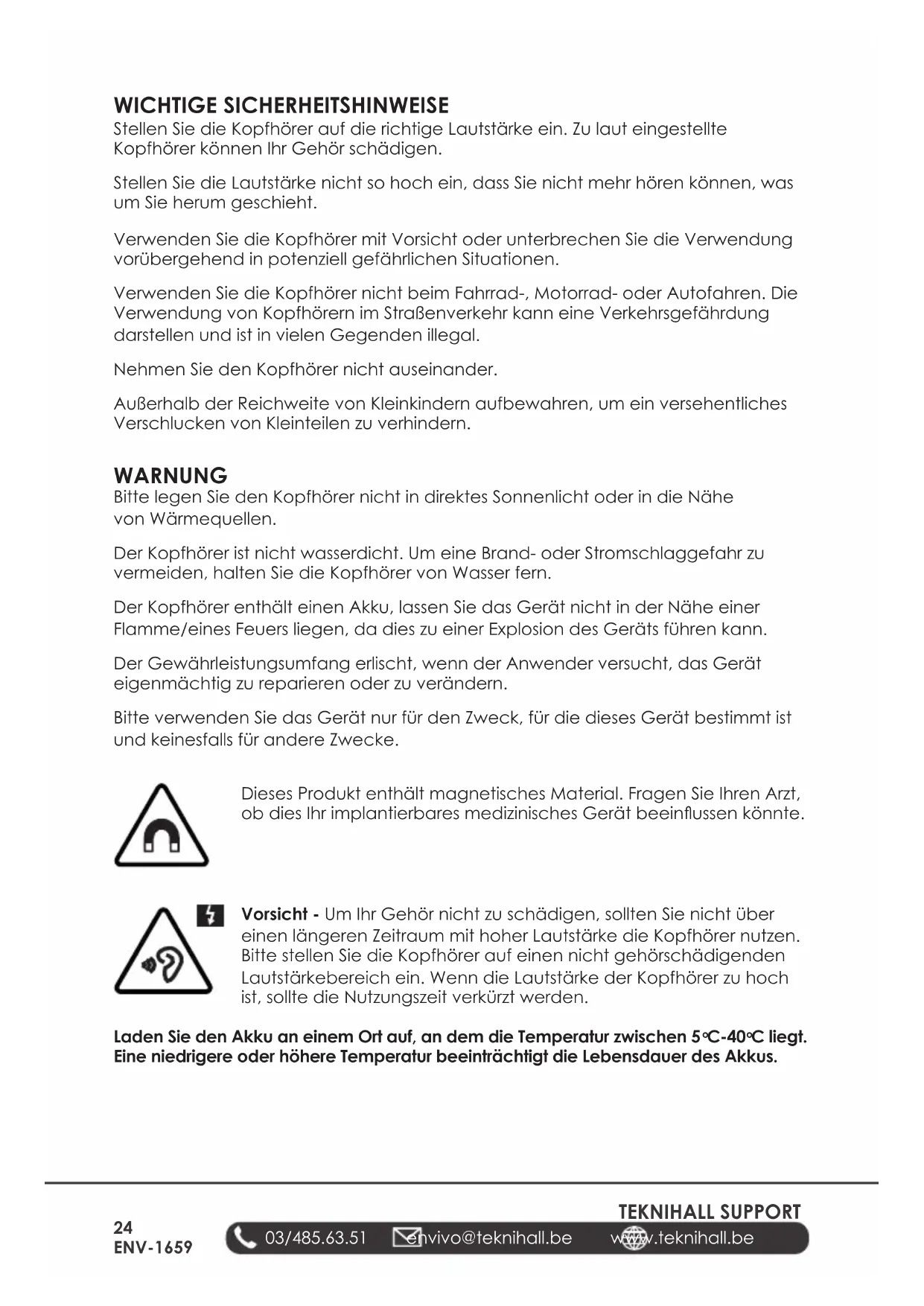 03/485.63.51 envivo@teknihall.be www.teknihall.be TEKNIHALL SUPPORT WICHTIGE SICHERHEITSHINWEISE Stellen Sie die Kopfhörer auf die richtige Lautstärke ein. Zu laut eingestellte Kopfhörer können Ihr Gehör schädigen. Stellen Sie die Lautstärke nicht so hoch ein, dass Sie nicht mehr hören können, was um Sie herum geschieht. Verwenden Sie die Kopfhörer mit Vorsicht oder unterbrechen Sie die Verwendung vorübergehend in potenziell gefährlichen Situationen. Verwenden Sie die Kopfhörer nicht beim Fahrrad-, Motorrad- oder Autofahren. Die Verwendung von Kopfhörern im Straßenverkehr kann eine Verkehrsgefährdung darstellen und ist in vielen Gegenden illegal. Nehmen Sie den Kopfhörer nicht auseinander. Außerhalb der Reichweite von Kleinkindern aufbewahren, um ein versehentliches Verschlucken von Kleinteilen zu verhindern. WARNUNG Bitte legen Sie den Kopfhörer nicht in direktes Sonnenlicht oder in die Nähe von Wärmequellen. Der Kopfhörer ist nicht wasserdicht. Um eine Brand- oder Stromschlaggefahr zu vermeiden, halten Sie die Kopfhörer von Wasser fern. Der Kopfhörer enthält einen Akku, lassen Sie das Gerät nicht in der Nähe einer Flamme/eines Feuers liegen, da dies zu einer Explosion des Geräts führen kann. Der Gewährleistungsumfang erlischt, wenn der Anwender versucht, das Gerät eigenmächtig zu reparieren oder zu verändern. Bitte verwenden Sie das Gerät nur für den Zweck, für die dieses Gerät bestimmt ist und keinesfalls für andere Zwecke. Dieses Produkt enthält magnetisches Material. Fragen Sie Ihren Arzt, ob dies Ihr implantierbares medizinisches Gerät beeinussen könnte. Vorsicht - Um Ihr Gehör nicht zu schädigen, sollten Sie nicht über einen längeren Zeitraum mit hoher Lautstärke die Kopfhörer nutzen. Bitte stellen Sie die Kopfhörer auf einen nicht gehörschädigenden Lautstärkebereich ein. Wenn die Lautstärke der Kopfhörer zu hoch ist, sollte die Nutzungszeit verkürzt werden. Laden Sie den Akku an einem Ort auf, an dem die Temperatur zwischen 5