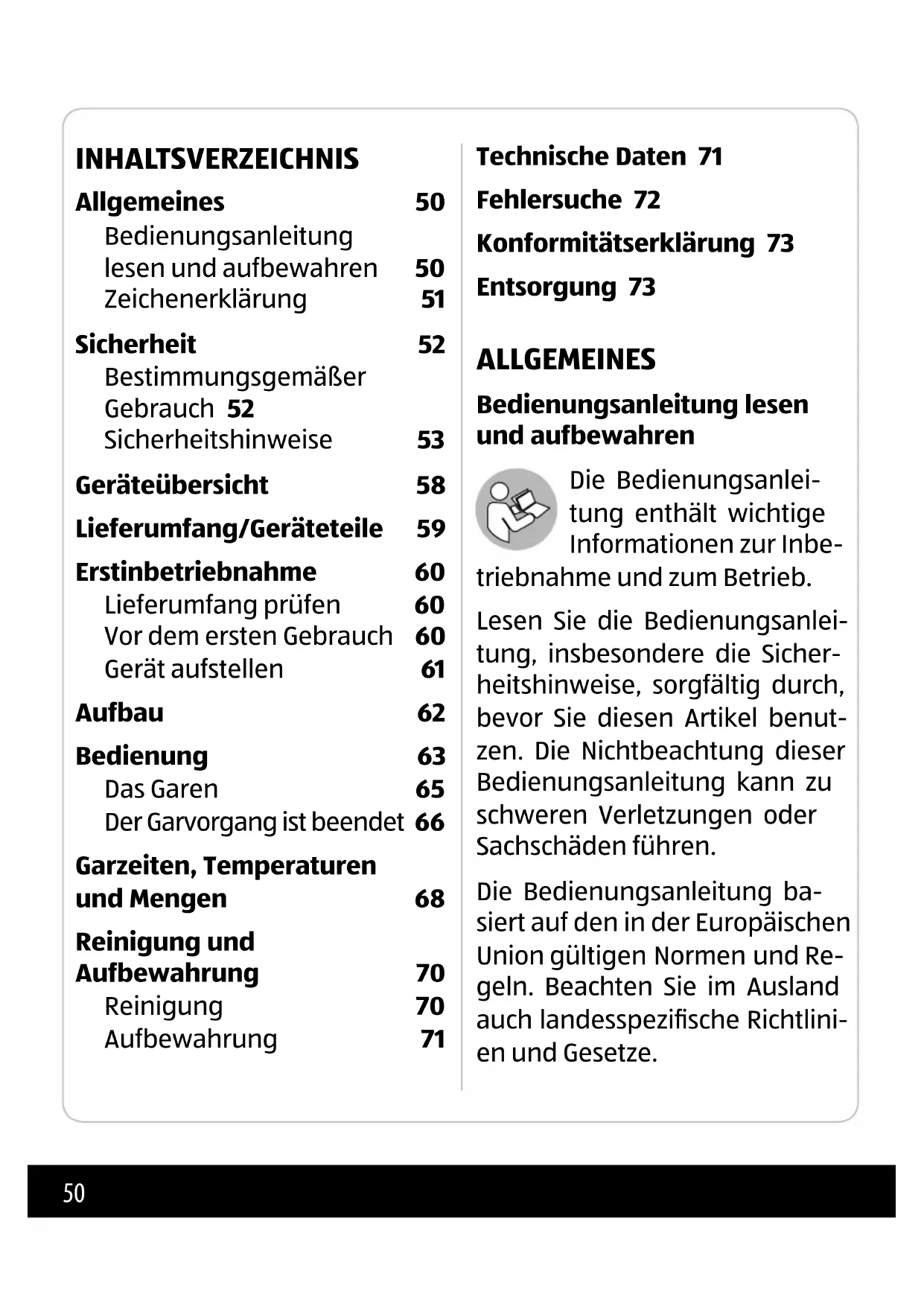 Éliminer l’emballage Mettez au rebut l’embal- lage selon les exigences de tri. Mettez le carton et les boîtes en carton au vieux pa- pier, les fi lms à la collecte des ma- tières de valeur. Éliminer l’appareil hors d’usage (Applicable dans l’Union euro- péenne et d’autres Etats euro- péens disposant de systèmes pour la collecte séparée des ma- tières de valeur) Les appareils hors d’usage ne doivent pas être jetés avec les ordures ména- gères ! Si un appareil ne peut plus être utilisé, tout utilisateur a l’obli- gation légale d’éliminer les ap- pareils hors d’usage différem- ment des ordures ménagères, par exemple à un point de col- lecte de sa commune/de son quartier. Ceci permet de garantir que les appareils hors d’usage sont traités professionnellement et d’éviter des effets négatifs sur l’environnement. C’est pourquoi les appareils électriques sont caractérisés par le symbole fi gu- rant ci-dessus.50 Technische Daten 71 Fehlersuche 72 Konformitätserklärung 73 Entsorgung 73 ALLGEMEINES Bedienungsanleitung lesen und aufbewahren Die Bedienungsanlei- tung enthält wichtige Informationen zur Inbe- triebnahme und zum Betrieb. Lesen Sie die Bedienungsanlei- tung, insbesondere die Sicher- heitshinweise, sorgfältig durch, bevor Sie diesen Artikel benut- zen. Die Nichtbeachtung dieser Bedienungsanleitung kann zu schweren Verletzungen oder Sachschäden führen. Die Bedienungsanleitung ba- siert auf den in der Europäischen Union gültigen Normen und Re- geln. Beachten Sie im Ausland auch landesspezifi sche Richtlini- en und Gesetze. INHALTSVERZEICHNIS Allgemeines 50 Bedienungsanleitung lesen und aufbewahren 50 Zeichenerklärung 51 Sicherheit 52 Bestimmungsgemäßer Gebrauch 52 Sicherheitshinweise 53 Geräteübersicht 58 Lieferumfang/Geräteteile 59 Erstinbetriebnahme 60 Lieferumfang prüfen 60 Vor dem ersten Gebrauch 60 Gerät aufstellen 61 Aufbau 62 Bedienung 63 Das Garen 65 Der Garvorgang ist beendet 66 Garzeiten, Temperaturen und Mengen 68 Reinigung und Aufbewahrung 70 Reinigung 70 Aufbewahrung 7151 Bewahren Sie die Bedienungs- anleitung für die weitere Nut- zung auf. Wenn Sie diesen Artikel an Dritte weitergeben, geben Sie unbedingt diese Bedienungsan- leitung mit. Sie können diese Bedienungsan- leitung auch als PDF-Datei auf der Homepage www.gt-support.de herunterladen. Zeichenerklärung Die folgenden Symbole und Si- gnalworte werden in dieser Be- dienungsanleitung, auf dem Artikel oder auf der Verpackung verwendet. WARNUNG! Dieses Signalsymbol/- wort bezeichnet eine Gefähr- dung mit einem mittleren Risi- kograd, die, wenn sie nicht vermieden wird, den Tod oder eine schwere Verletzung zur Folge haben kann. VORSICHT! Dieses Signalsymbol/- wort bezeichnet eine Gefähr- dung mit einem niedrigen Risikograd, die, wenn sie nicht vermieden wird, eine geringfü- gige oder mäßige Verletzung zur Folge haben kann. Heiße Oberfl äche! Dieses Symbol kennzeichnet hei- ße Oberfl ächen im Betrieb – nicht mit bloßen Händen berühren. HINWEIS! Dieses Signalsymbol-/ wort warnt vor möglichen Sach- schäden. Dieses Symbol gibt Ihnen nützliche Zusatzinformati- onen zum Aufbau oder zur Be- dienung. Konformitätserklärung (siehe Kapitel „Konformi- tätserklärung“): Mit diesem Sym- bol gekennzeichnete Produkte erfüllen alle anzuwendenden Gemeinschaftsvorschriften des Europäischen Wirtschaftsraums.52 Das Siegel „Geprüfte Si- cherheit“ (GS-Zeichen) bestätigt, dass dieser Artikel den Anforderungen des deutschen Produktsicherheits- gesetzes entspricht. SICHERHEIT Bestimmungsgemäßer Gebrauch Dieses Gerät ist ausschließlich für das Zubereiten von Lebensmit- teln in haushaltsüblichen Men- gen geeignet und darf nur in In- nenräumen verwendet werden. Es kann sowohl zum Zubereiten von z.B. Gemüse, Pommes, Fisch, Fleisch und Gefl ügel als auch für Teigwaren verwendet werden. Das Gerät ist ausschließlich für den Privatgebrauch bestimmt. Verwenden Sie das Gerät nur wie in dieser Bedienungsanleitung beschrieben. Jede andere Verwendung gilt als nicht bestimmungsgemäß und kann zu Sachschäden oder sogar zu Personenschäden führen. Verwenden Sie die Heißluft- fritteuse keinesfalls zum Erhit- zen von Wasser oder anderen Flüssigkeiten. Der Hersteller oder Händler übernimmt keine Haftung für Schäden, die durch nicht bestim- mungsgemäße Verwendung, unsachgemäße Reparaturen, unerlaubt vorgenommenen Ver- änderungen oder Verwendung nicht zugelassener Zubehör- oder Ersatzteile entstanden sind. Dieser Artikel ist nicht für den gewerblichen Bereich geeignet, wie z. B.: