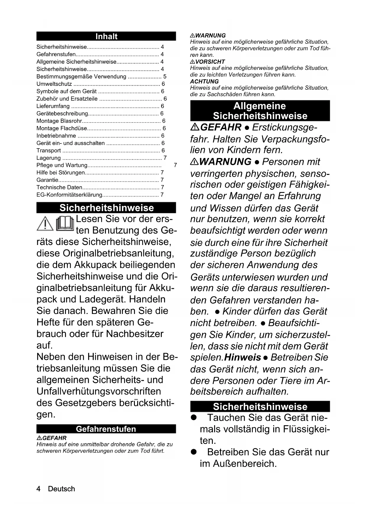 - 128AB C D E F4 Deutsch Inhalt Sicherheitshinweise Lesen Sie vor der ers- ten Benutzung des Ge- räts diese Sicherheitshinweise, diese Originalbetriebsanleitung, die dem Akkupack beiliegenden Sicherheitshinweise und die Ori- ginalbetriebsanleitung für Akku- pack und Ladegerät. Handeln Sie danach. Bewahren Sie die Hefte für den späteren Ge- brauch oder für Nachbesitzer auf. Neben den Hinweisen in der Be- triebsanleitung müssen Sie die allgemeinen Sicherheits- und Unfallverhütungsvorschriften des Gesetzgebers berücksichti- gen. Gefahrenstufen GEFAHR Hinweis auf eine unmittelbar drohende Gefahr, die zu schweren Körperverletzungen oder zum Tod führt. 몇 WARNUNG Hinweis auf eine möglicherweise gefährliche Situation, die zu schweren Körperverletzungen oder zum Tod füh- ren kann. 몇 VORSICHT Hinweis auf eine möglicherweise gefährliche Situation, die zu leichten Verletzungen führen kann. ACHTUNG Hinweis auf eine möglicherweise gefährliche Situation, die zu Sachschäden führen kann. Allgemeine Sicherheitshinweise GEFAHR ● Erstickungsge- fahr. Halten Sie Verpackungsfo- lien von Kindern fern. 몇 WARNUNG ● Personen mit verringerten physischen, senso- rischen oder geistigen Fähigkei- ten oder Mangel an Erfahrung und Wissen dürfen das Gerät nur benutzen, wenn sie korrekt beaufsichtigt werden oder wenn sie durch eine für ihre Sicherheit zuständige Person bezüglich der sicheren Anwendung des Geräts unterwiesen wurden und wenn sie die daraus resultieren- den Gefahren verstanden ha- ben. ● Kinder dürfen das Gerät nicht betreiben. ● Beaufsichti- gen Sie Kinder, um sicherzustel- len, dass sie nicht mit dem Gerät spielen.Hinweis ● Betreiben Sie das Gerät nicht, wenn sich an- dere Personen oder Tiere im Ar- beitsbereich aufhalten. Sicherheitshinweise Tauchen Sie das Gerät nie- mals vollständig in Flüssigkei- ten. Betreiben Sie das Gerät nur im Außenbereich. Sicherheitshinweise p. 4