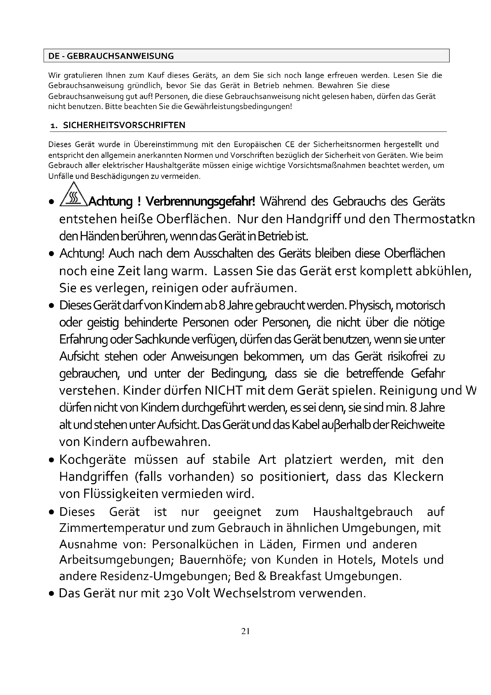 - Achtung ! Verbrennungsgefahr! Während des Gebrauchs des Geräts entstehen heiße Oberflächen. Nur den Handgriff und den Thermostatknopf mit den Händen berühren, wenn das Gerät in Betrieb ist.