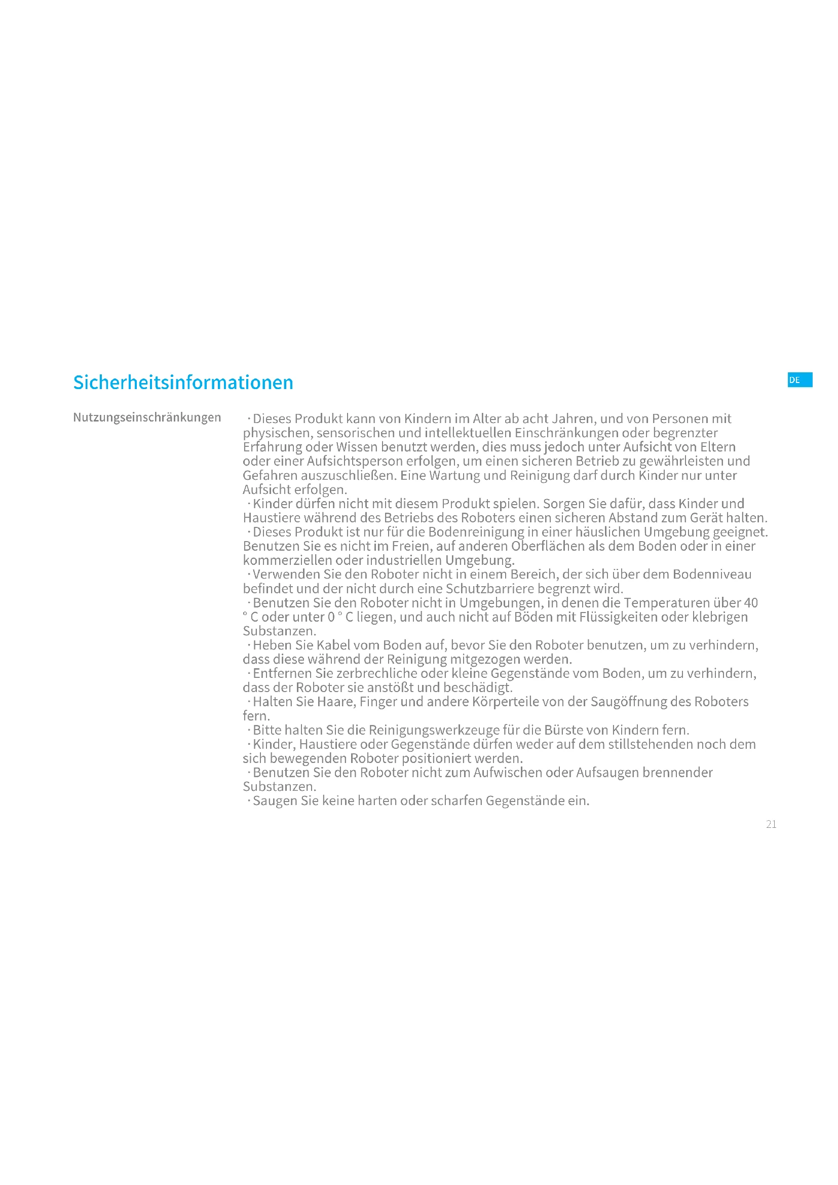 - Benutzen Sie den Roboter nicht zum Aufwischen oder Aufsaugen brennender Substanzen.