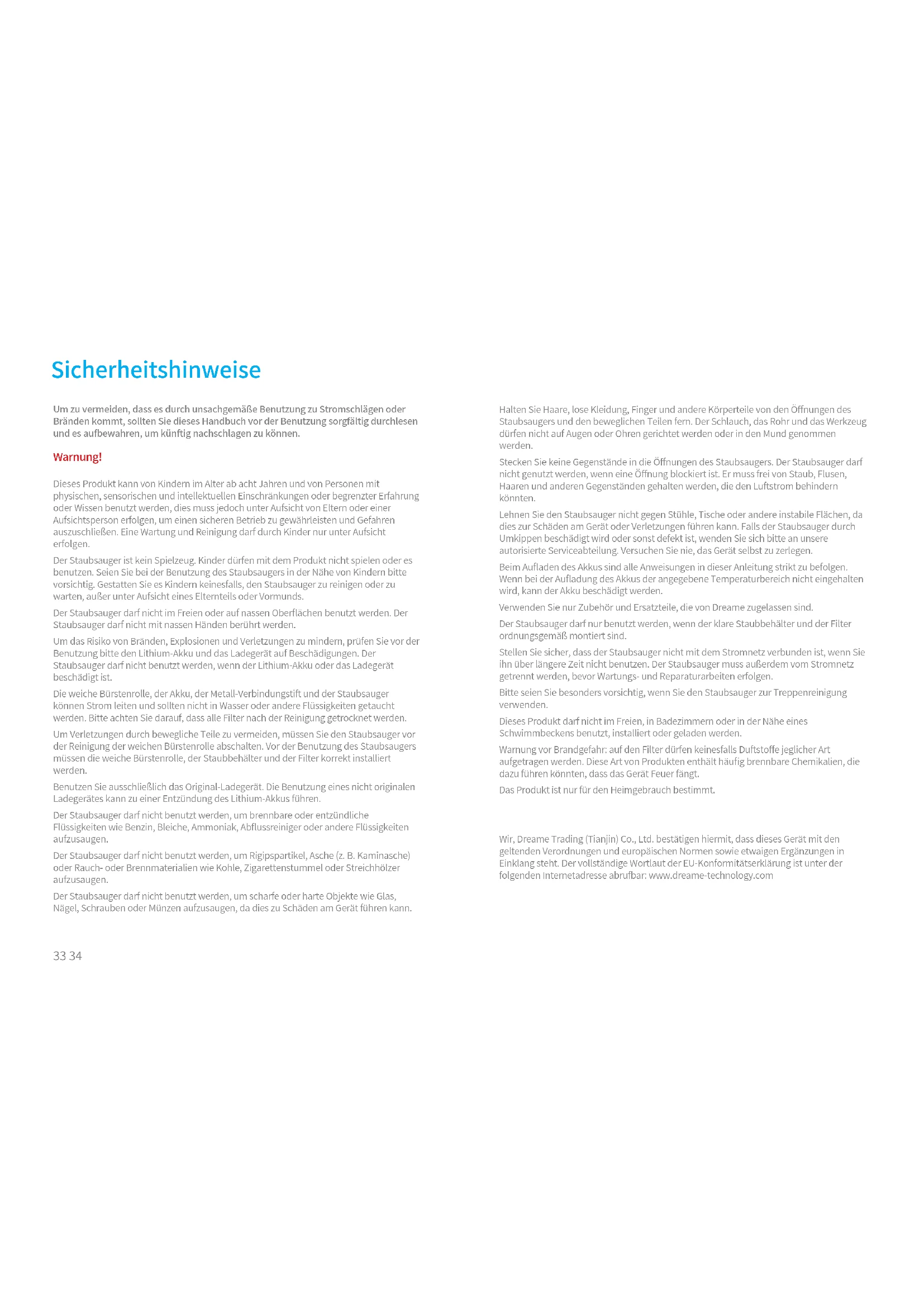 réinstallez-la en suivant la procédure de démontage dans l’ordre inverse. Entretien et maintenance31 32 Ce produit contient des batteries uniquement remplaçables par des techniciens qualifiés ou le service après-vente. Ce produit contient des batteries non remplaçables. FAQ En cas de dysfonctionnement de l’aspirateur, consultez le tableau ci-dessous. Erreurs Causes possibles Solutions L’aspirateur ne fonctionne pas. La batterie de l’aspirateur est déchargée ou faiblement chargée. Rechargez complètement l’aspirateur avant de commencer à le réutiliser. Déclenchement du mode Protection suite à une obstruction. Attendez que l’aspirateur refroidisse, puis réactivez-le. L’orifice d’aspiration ou le passage d’air est obstrué. Retirez les débris susceptibles de bloquer l’ orifice d’aspiration ou le passage de l’air. Réduction de la puissance d’aspiration. Le compartiment à poussière est rempli et/ou l’ensemble filtre HEPA est obstrué. Videz le compartiment à poussière et nettoyez l’ensemble filtre HEPA. L’accessoire est obstrué. Retirez les débris susceptibles d’obstruer l’accessoire. Le moteur fait un bruit anormal. L’orifice d’aspiration principal ou la tige de rallonge est obstruée. Retirez les débris susceptibles de bloquer l’orifice d’aspiration principal ou la tige de rallonge. La recharge s’effectue lentement. La température de la batterie est trop faible ou trop élevée. Attendez que la température de la batterie redevienne normale, puis recommencez à l’utiliser. Le premier voyant est rouge après la mise sous tension de l’ aspirateur. La batterie est déchargée. Contactez le service après-vente pour maintenance. Le premier voyant clignote en rouge après la mise sous tension de l’aspirateur. L’adaptateur secteur est incompatible. Utilisez uniquement l’adaptateur secteur d’origine pour recharger l ’a s p i r a t e u r . Le voyant de la batterie ne s’allume pas lors de la recharge. L’adaptateur secteur n’est pas connecté à l’aspirateur. Assurez-vous que l’adaptateur secteur est correctement branché. La batterie est complètement chargée et est passée en mode veille. Elle peut être utilisée normalement. Si le problème persiste après avoir éliminé les deux possibilités ci-dessus. Contactez le service après-vente pour maintenance. Tous les produits portant ce symbole deviennent des déchets d’équipements électriques et électroniques (DEEE dans la Directive européenne 2012/19/UE) qui ne doivent pas être mélangés aux déchets ménagers non triés. Vous devez contribuer à la protection de l’environnement et de la santé humaine en apportant l’équipement usagé à un point de collecte dédié au recyclage des équipements électriques et électroniques, agréé par le gouvernement ou les autorités locales. Le recyclage et la destruction appropriés permettront d’éviter tout impact potentiellement négatif sur l’environnement et la santé humaine. Contactez l’installateur ou les autorités locales pour obtenir plus d’informations concernant l’emplacement ainsi que les conditions d’utilisation de ce type de point de collecte. Informations DEEE33 34 Um zu vermeiden, dass es durch unsachgemäße Benutzung zu Stromschlägen oder Bränden kommt, sollten Sie dieses Handbuch vor der Benutzung sorgfältig durchlesen und es aufbewahren, um künftig nachschlagen zu können. Warnung! Dieses Produkt kann von Kindern im Alter ab acht Jahren und von Personen mit physischen, sensorischen und intellektuellen Einschränkungen oder begrenzter Erfahrung oder Wissen benutzt werden, dies muss jedoch unter Aufsicht von Eltern oder einer Aufsichtsperson erfolgen, um einen sicheren Betrieb zu gewährleisten und Gefahren auszuschließen. Eine Wartung und Reinigung darf durch Kinder nur unter Aufsicht erfolgen. Der Staubsauger ist kein Spielzeug. Kinder dürfen mit dem Produkt nicht spielen oder es benutzen. Seien Sie bei der Benutzung des Staubsaugers in der Nähe von Kindern bitte vorsichtig. Gestatten Sie es Kindern keinesfalls, den Staubsauger zu reinigen oder zu warten, außer unter Aufsicht eines Elternteils oder Vormunds. Der Staubsauger darf nicht im Freien oder auf nassen Oberflächen benutzt werden. Der Staubsauger darf nicht mit nassen Händen berührt werden. Um das Risiko von Bränden, Explosionen und Verletzungen zu mindern, prüfen Sie vor der Benutzung bitte den Lithium-Akku und das Ladegerät auf Beschädigungen. Der Staubsauger darf nicht benutzt werden, wenn der Lithium-Akku oder das Ladegerät beschädigt ist. Die weiche Bürstenrolle, der Akku, der Metall-Verbindungstift und der Staubsauger können Strom leiten und sollten nicht in Wasser oder andere Flüssigkeiten getaucht werden. Bitte achten Sie darauf, dass alle Filter nach der Reinigung getrocknet werden. Um Verletzungen durch bewegliche Teile zu vermeiden, müssen Sie den Staubsauger vor der Reinigung der weichen Bürstenrolle abschalten. Vor der Benutzung des Staubsaugers müssen die weiche Bürstenrolle, der Staubbehälter und der Filter korrekt installiert werden. Benutzen Sie ausschließlich das Original-Ladegerät. Die Benutzung eines nicht originalen Ladegerätes kann zu einer Entzündung des Lithium-Akkus führen. Der Staubsauger darf nicht benutzt werden, um brennbare oder entzündliche Flüssigkeiten wie Benzin, Bleiche, Ammoniak, Abflussreiniger oder andere Flüssigkeiten aufzusaugen. Der Staubsauger darf nicht benutzt werden, um Rigipspartikel, Asche (z. B. Kaminasche) oder Rauch- oder Brennmaterialien wie Kohle, Zigarettenstummel oder Streichhölzer aufzusaugen. Der Staubsauger darf nicht benutzt werden, um scharfe oder harte Objekte wie Glas, Nägel, Schrauben oder Münzen aufzusaugen, da dies zu Schäden am Gerät führen kann. Halten Sie Haare, lose Kleidung, Finger und andere Körperteile von den Öffnungen des Staubsaugers und den beweglichen Teilen fern. Der Schlauch, das Rohr und das