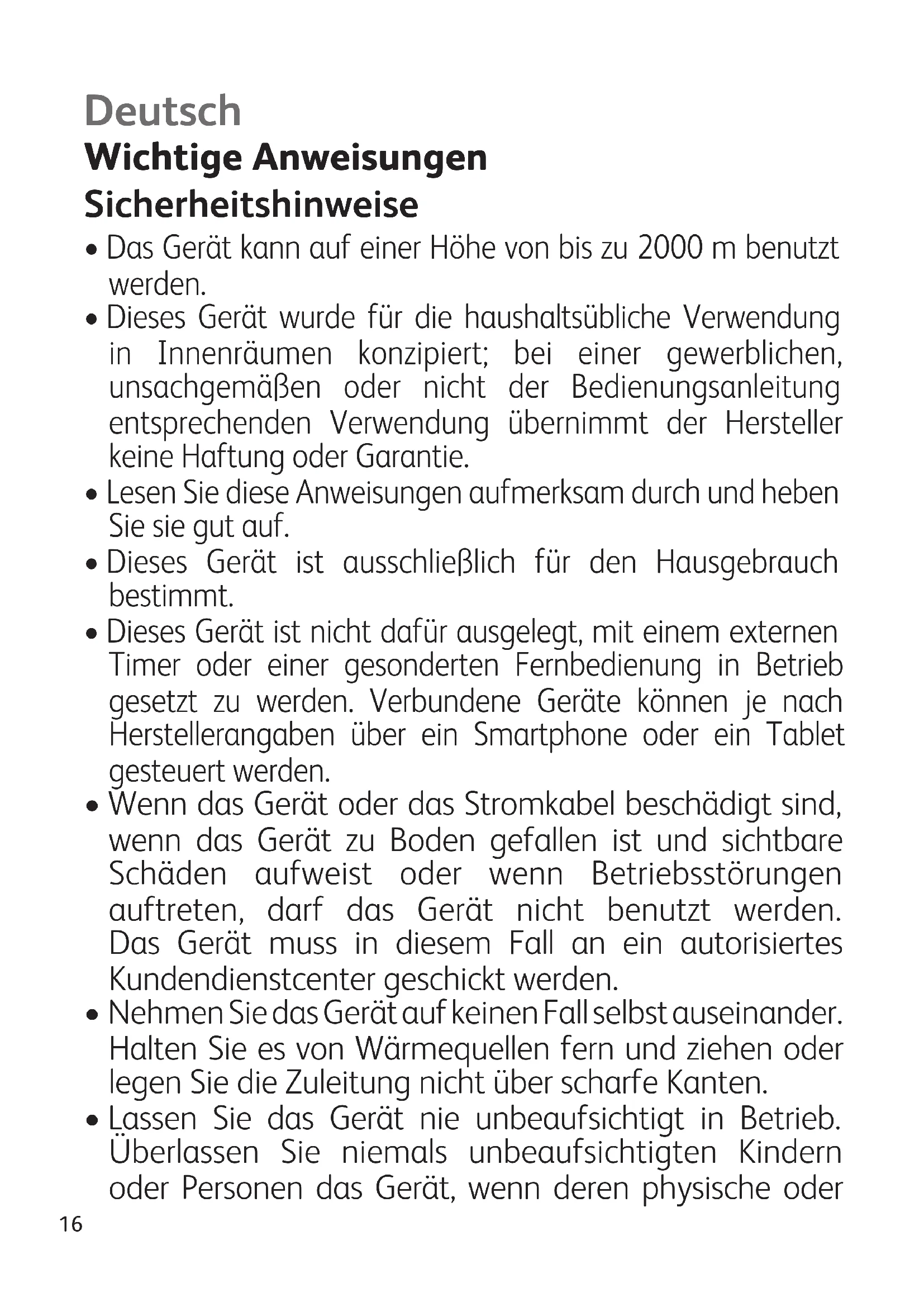 - Lassen Sie das Gerät nie unbeaufsichtigt in Betrieb. Überlassen Sie niemals unbeaufsichtigten Kindern oder Personen das Gerät, wenn deren physische oder Deutsch17 sensorische Fähigkeiten oder Mangel an Erfahrung und Wissen sie am sicheren Gebrauch hindern. Sie müssen stets überwacht werden und zuvor unterwiesen sein. Bewahren Sie das Gerät nicht in Reichweite von Kindern auf. Kinder müssen beaufsichtigt werden, damit sie nicht mit dem Gerät spielen.
