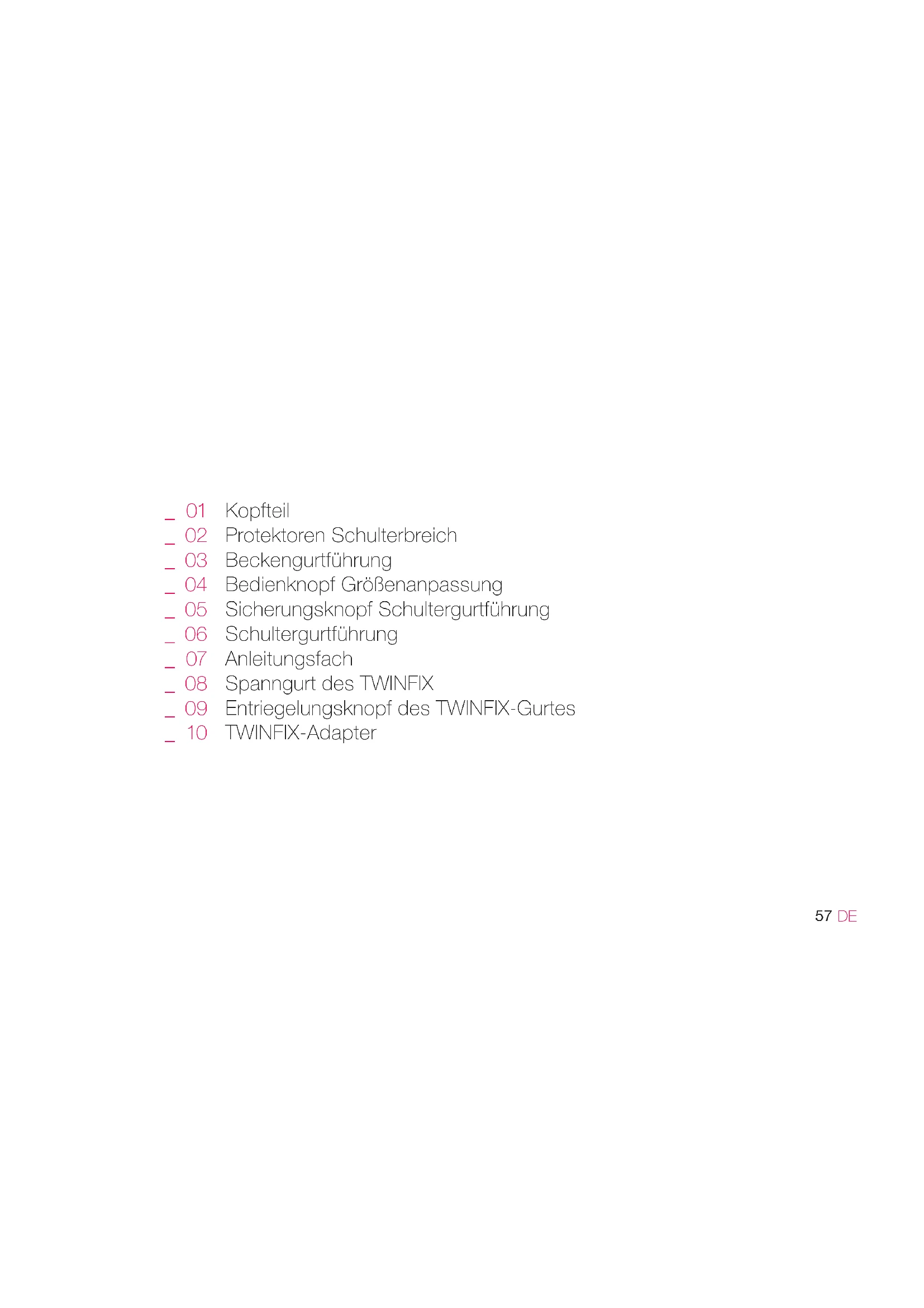 Kopfteil Protektoren Schulterbreich Beckengurtführung Bedienknopf Größenanpassung Sicherungsknopf Schultergurtführung Schultergurtführung Anleitungsfach Spanngurt des TWINFIX Entriegelungsknopf des TWINFIX-Gurtes TWINFIX-Adapter _ 01 _ 02 _ 03 _ 04 _ 05 _ 06 _ 07 _ 08 _ 09 _ 10 IM 2230.01 TRANSFORMER_iTECH int.indd 57 18/6/21 15:3458