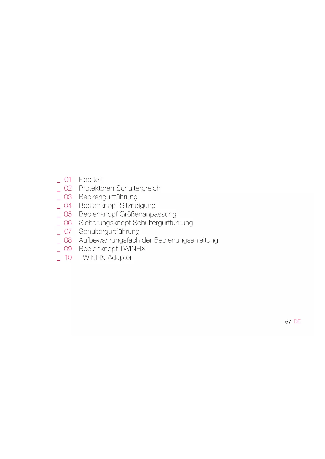 Kopfteil Protektoren Schulterbreich Beckengurtführung Bedienknopf Sitzneigung Bedienknopf Größenanpassung Sicherungsknopf Schultergurtführung Schultergurtführung Aufbewahrungsfach der Bedienungsanleitung Bedienknopf TWINFIX TWINFIX-Adapter _ 01 _ 02 _ 03 _ 04 _ 05 _ 06 _ 07 _ 08 _ 09 _ 10 IM 2193.01 TRANSFORMER_iPLUS int.indd 57 18/6/21 17:2858