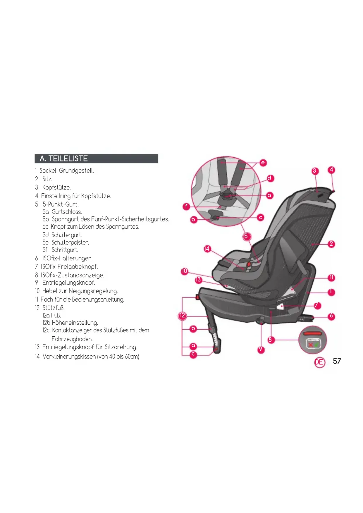 ANLEITUNG 1 Sockel, Grundgestell. 2 Sitz. 3 Kopfstütze. 4 Einstellring für Kopfstütze. 5 5-Punkt-Gurt. 5a Gurtschloss. 5b Spanngurt des Fünf-Punkt-Sicherheitsgurtes. 5c Knopf zum Lösen des Spanngurtes. 5d Schultergurt. 5e Schulterpolster. 5f Schrittgurt. 6 ISOx-Halterungen. 7 ISOx-Freigabeknopf. 8 ISOx-Zustandsanzeige. 9 Entriegelungsknopf. 10 Hebel zur Neigungsregelung. 11 Fach für die Bedienungsanleitung. 12 Stützfuß. 12a Fuß. 12b Höheneinstellung. 12c Kontaktanzeiger des Stützfußes mit dem Fahrzeugboden. 13 Entriegelungsknopf für Sitzdrehung. 14 Verkleinerungskissen (von 40 bis 60cm) A. TEILELISTE