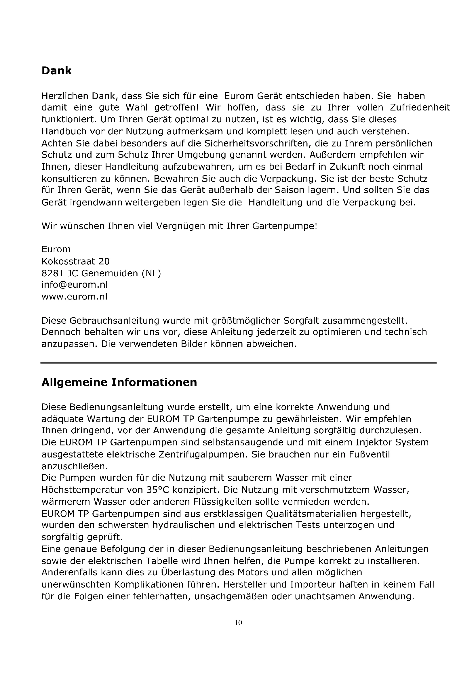 Removal In the EU this symbol indicates that this product may not be disposed of as ordinary household waste. Old equipment contains valuable materials, suitable for recycling. These materials should be made suitable for reuse in order to prevent any adverse effects to health and the environment caused by unregulated waste collection. Therefore, please make sure that you bring old equipment to a designated collection point. Alternatively, contact the original supplier, who can make sure that as many of the components as possible can be recycled CE-declaration See page 34.10 Dank Herzlichen Dank, dass Sie sich für eine Eurom Gerät entschieden haben. Sie haben damit eine gute Wahl getroffen! Wir hoffen, dass sie zu Ihrer vollen Zufriedenheit funktioniert. Um Ihren Gerät optimal zu nutzen, ist es wichtig, dass Sie dieses Handbuch vor der Nutzung aufmerksam und komplett lesen und auch verstehen. Achten Sie dabei besonders auf die Sicherheitsvorschriften, die zu Ihrem persönlichen Schutz und zum Schutz Ihrer Umgebung genannt werden. Außerdem empfehlen wir Ihnen, dieser Handleitung aufzubewahren, um es bei Bedarf in Zukunft noch einmal konsultieren zu können. Bewahren Sie auch die Verpackung. Sie ist der beste Schutz für Ihren Gerät, wenn Sie das Gerät außerhalb der Saison lagern. Und sollten Sie das Gerät irgendwann weitergeben legen Sie die Handleitung und die Verpackung bei. Wir wünschen Ihnen viel Vergnügen mit Ihrer Gartenpumpe! Eurom Kokosstraat 20 8281 JC Genemuiden (NL) info@eurom.nl www.eurom.nl Diese Gebrauchsanleitung wurde mit größtmöglicher Sorgfalt zusammengestellt. Dennoch behalten wir uns vor, diese Anleitung jederzeit zu optimieren und technisch anzupassen. Die verwendeten Bilder können abweichen.