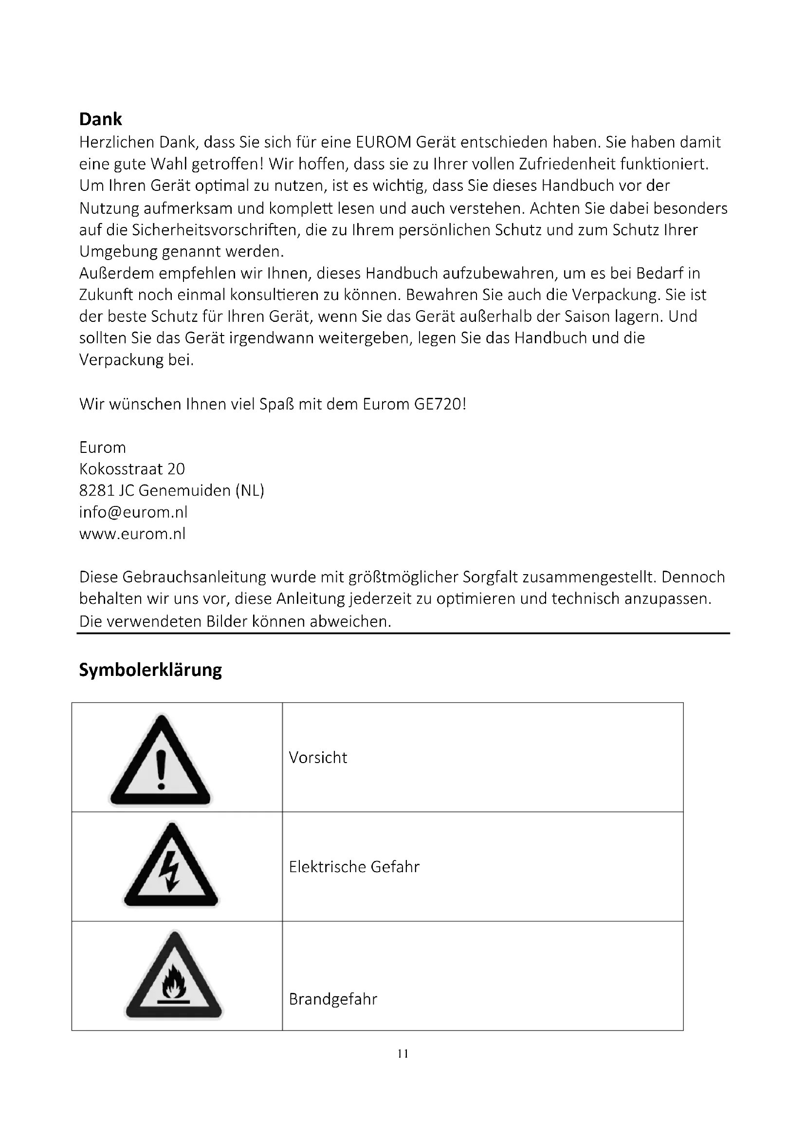 Dank Herzlichen Dank, dass Sie sich für eine EUROM Gerät entschieden haben. Sie haben damit eine gute Wahl getroffen! Wir hoffen, dass sie zu Ihrer vollen Zufriedenheit funktioniert. Um Ihren Gerät optimal zu nutzen, ist es wichtig, dass Sie dieses Handbuch vor der Nutzung aufmerksam und komplett lesen und auch verstehen. Achten Sie dabei besonders auf die Sicherheitsvorschriften, die zu Ihrem persönlichen Schutz und zum Schutz Ihrer Umgebung genannt werden. Außerdem empfehlen wir Ihnen, dieses Handbuch aufzubewahren, um es bei Bedarf in Zukunft noch einmal konsultieren zu können. Bewahren Sie auch die Verpackung. Sie ist der beste Schutz für Ihren Gerät, wenn Sie das Gerät außerhalb der Saison lagern. Und sollten Sie das Gerät irgendwann weitergeben, legen Sie das Handbuch und die Verpackung bei. Wir wünschen Ihnen viel Spaß mit dem Eurom GE720! Eurom Kokosstraat 20 8281 JC Genemuiden (NL) info@eurom.nl www.eurom.nl Diese Gebrauchsanleitung wurde mit größtmöglicher Sorgfalt zusammengestellt. Dennoch behalten wir uns vor, diese Anleitung jederzeit zu optimieren und technisch anzupassen. Die verwendeten Bilder können abweichen. Symbolerklärung