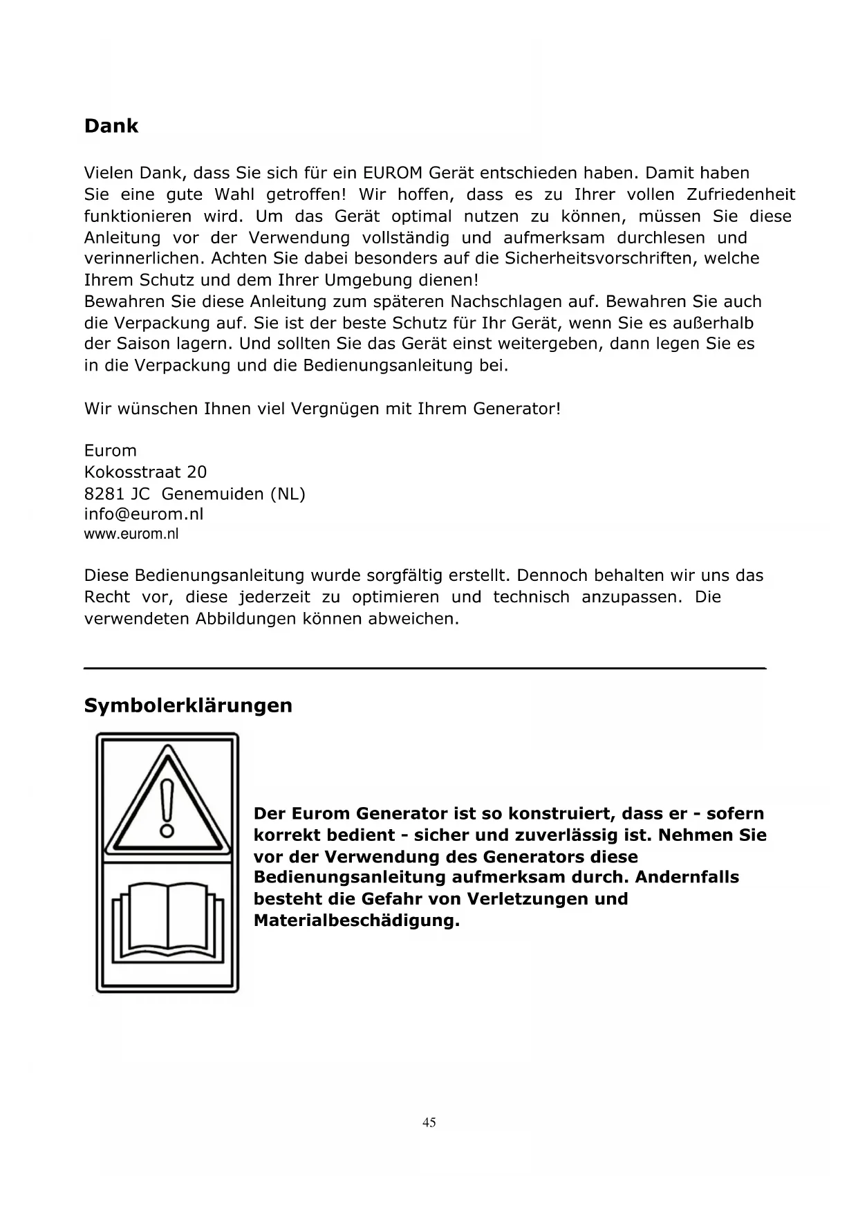 Dank Vielen Dank, dass Sie sich für ein EUROM Gerät entschieden haben. Damit haben Sie eine gute Wahl getroffen! Wir hoffen, dass es zu Ihrer vollen Zufriedenheit funktionieren wird. Um das Gerät optimal nutzen zu können, müssen Sie diese Anleitung vor der Verwendung vollständig und aufmerksam durchlesen und verinnerlichen. Achten Sie dabei besonders auf die Sicherheitsvorschriften, welche Ihrem Schutz und dem Ihrer Umgebung dienen! Bewahren Sie diese Anleitung zum späteren Nachschlagen auf. Bewahren Sie auch die Verpackung auf. Sie ist der beste Schutz für Ihr Gerät, wenn Sie es außerhalb der Saison lagern. Und sollten Sie das Gerät einst weitergeben, dann legen Sie es in die Verpackung und die Bedienungsanleitung bei. Wir wünschen Ihnen viel Vergnügen mit Ihrem Generator! Eurom Kokosstraat 20 8281 JC Genemuiden (NL) info@eurom.nl www.eurom.nl Diese Bedienungsanleitung wurde sorgfältig erstellt. Dennoch behalten wir uns das Recht vor, diese jederzeit zu optimieren und technisch anzupassen. Die verwendeten Abbildungen können abweichen.