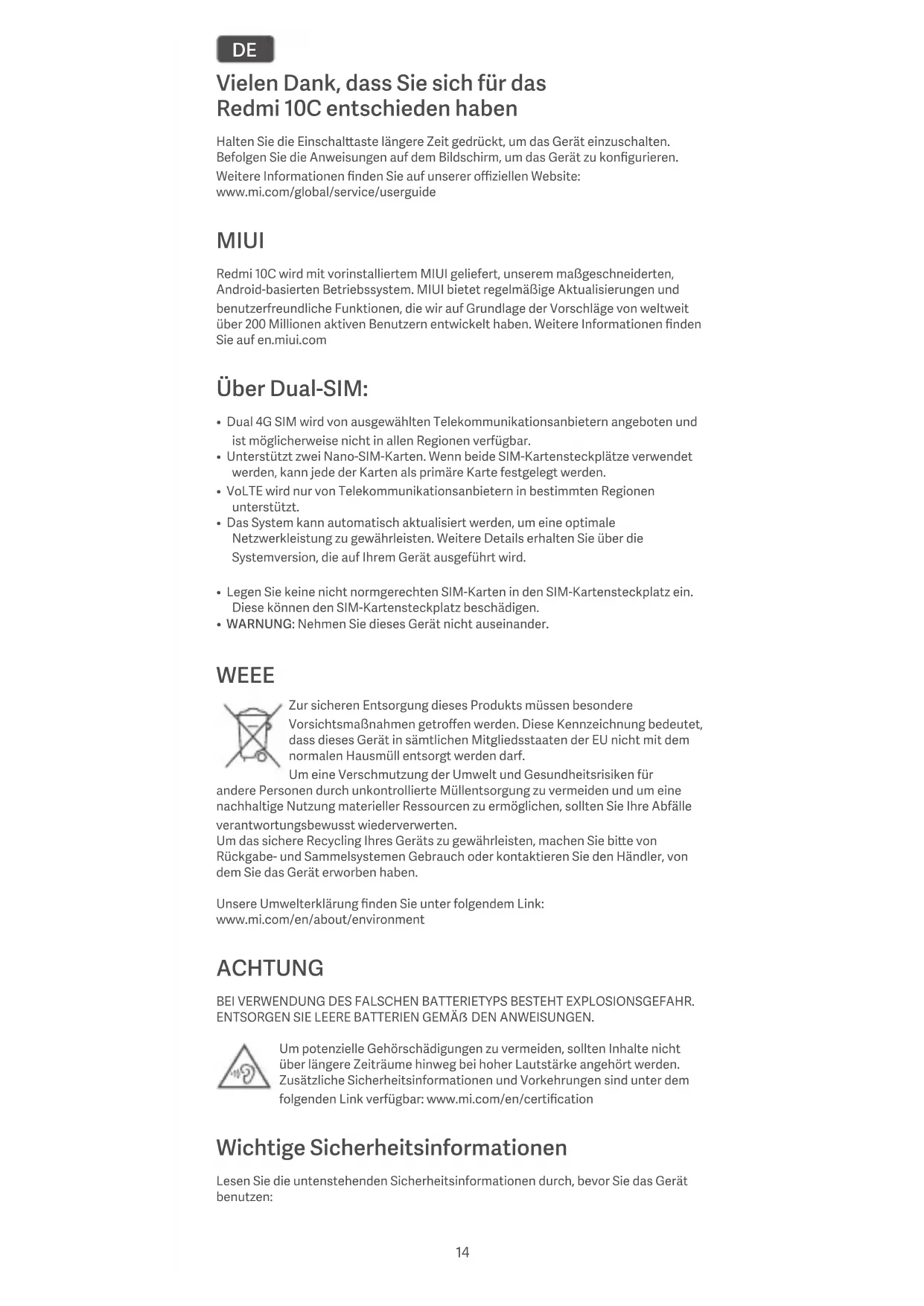 - WARNUNG: Nehmen Sie dieses Gerät nicht auseinander. WEEE Zur sicheren Entsorgung dieses Produkts müssen besondere Vorsichtsmaßnahmen getroffen werden. Diese Kennzeichnung bedeutet, dass dieses Gerät in sämtlichen Mitgliedsstaaten der EU nicht mit dem normalen Hausmüll entsorgt werden darf. Um eine Verschmutzung der Umwelt und Gesundheitsrisiken für andere Personen durch unkontrollierte Müllentsorgung zu vermeiden und um eine nachhaltige Nutzung materieller Ressourcen zu ermöglichen, sollten Sie Ihre Abfälle verantwortungsbewusst wiederverwerten. Um das sichere Recycling Ihres Geräts zu gewährleisten, machen Sie bie von Rückgabe- und Sammelsystemen Gebrauch oder kontaktieren Sie den Händler, von dem Sie das Gerät erworben haben. Unsere Umwelterklärung finden Sie unter folgendem Link: www.mi.com/en/about/environment ACHTUNG BEI VERWENDUNG DES FALSCHEN BATTERIETYPS BESTEHT EXPLOSIONSGEFAHR. ENTSORGEN SIE LEERE BATTERIEN GEMÄẞ DEN ANWEISUNGEN. Um potenzielle Gehörschädigungen zu vermeiden, sollten Inhalte nicht über längere Zeiträume hinweg bei hoher Lautstärke angehört werden. Zusätzliche Sicherheitsinformationen und Vorkehrungen sind unter dem folgenden Link verfügbar: www.mi.com/en/certification Wichtige Sicherheitsinformationen Lesen Sie die untenstehenden Sicherheitsinformationen durch, bevor Sie das Gerät benutzen: 14• Die Verwendung nicht zugelassene Kabel, Netzteile oder Baerien kann zu Bränden, Explosionen oder anderen Risiken führen.