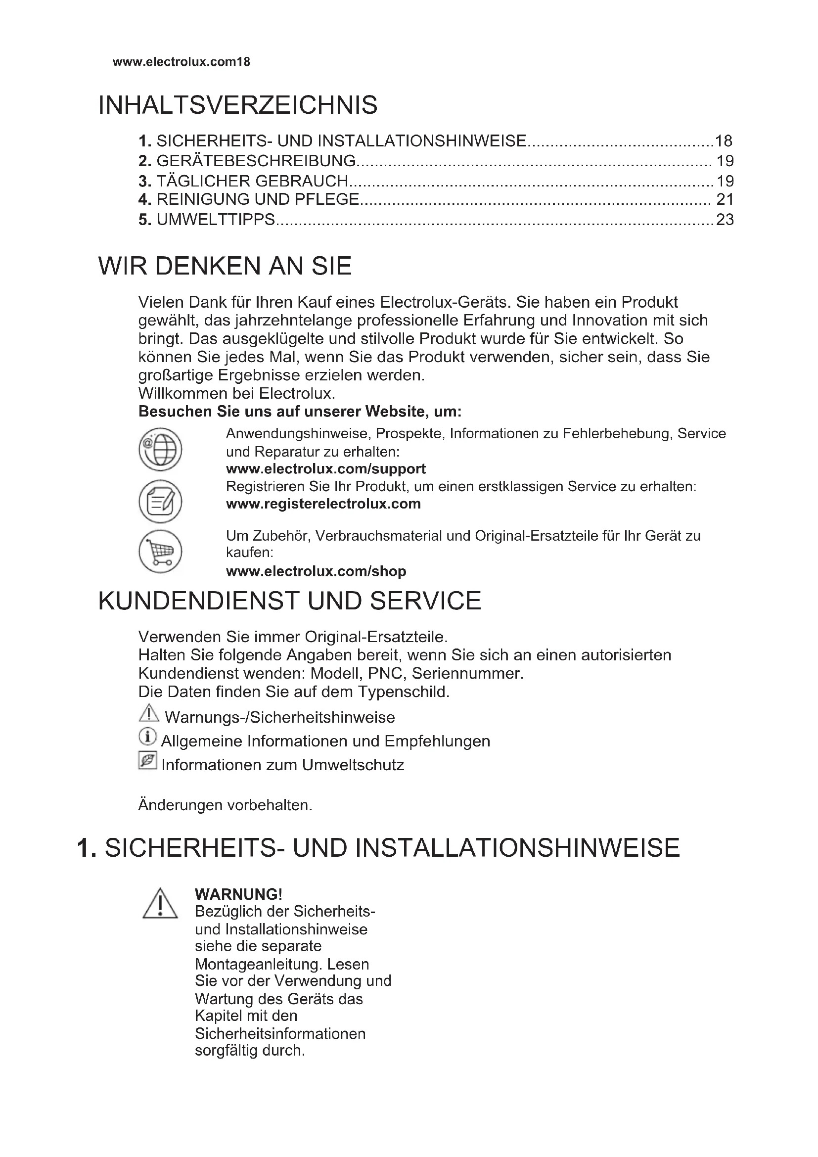 Vielen Dank für Ihren Kauf eines Electrolux-Geräts. Sie haben ein Produkt gewählt, das jahrzehntelange professionelle Erfahrung und Innovation mit sich bringt. Das ausgeklügelte und stilvolle Produkt wurde für Sie entwickelt. So können Sie jedes Mal, wenn Sie das Produkt verwenden, sicher sein, dass Sie großartige Ergebnisse erzielen werden. Willkommen bei Electrolux. Besuchen Sie uns auf unserer Website, um: Anwendungshinweise, Prospekte, Informationen zu Fehlerbehebung, Service und Reparatur zu erhalten: www.electrolux.com/support Registrieren Sie Ihr Produkt, um einen erstklassigen Service zu erhalten: www.registerelectrolux.com Um Zubehör, Verbrauchsmaterial und Original-Ersatzteile für Ihr Gerät zu kaufen: www.electrolux.com/shop