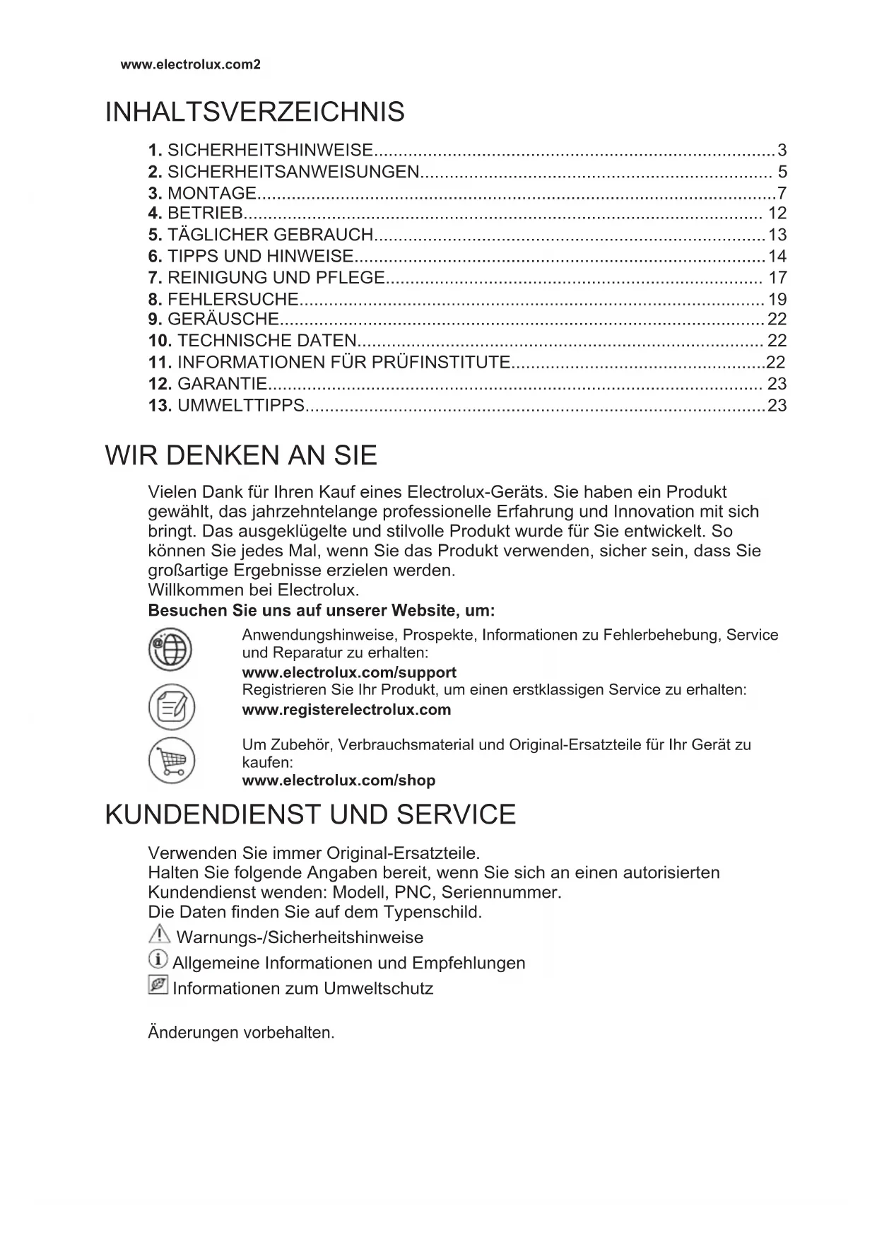Verwenden Sie immer Original-Ersatzteile. Halten Sie folgende Angaben bereit, wenn Sie sich an einen autorisierten Kundendienst wenden: Modell, PNC, Seriennummer. Die Daten finden Sie auf dem Typenschild. Warnungs-/Sicherheitshinweise Allgemeine Informationen und Empfehlungen Informationen zum Umweltschutz Änderungen vorbehalten. www.electrolux.com21. SICHERHEITSHINWEISE Lesen Sie vor der Montage und dem Gebrauch des Geräts zuerst die Bedienungsanleitung. Bei Verletzungen oder Schäden infolge nicht ordnungsgemäßer Montage oder Verwendung übernimmt der Hersteller keine Haftung. Bewahren Sie die Anleitung zum Nachschlagen an einem sicheren und zugänglichen Ort auf.
