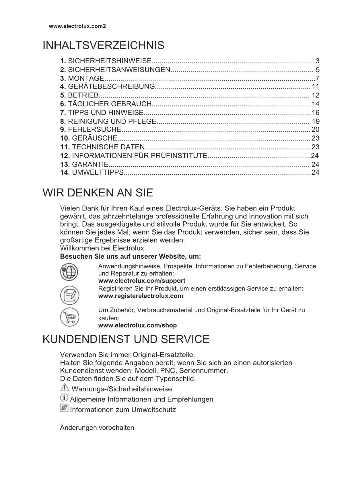 Verwenden Sie immer Original-Ersatzteile. Halten Sie folgende Angaben bereit, wenn Sie sich an einen autorisierten Kundendienst wenden: Modell, PNC, Seriennummer. Die Daten finden Sie auf dem Typenschild. Warnungs-/Sicherheitshinweise Allgemeine Informationen und Empfehlungen Informationen zum Umweltschutz Änderungen vorbehalten. www.electrolux.com21. SICHERHEITSHINWEISE Lesen Sie vor der Montage und dem Gebrauch des Geräts zuerst die Bedienungsanleitung. Bei Verletzungen oder Schäden infolge nicht ordnungsgemäßer Montage oder Verwendung übernimmt der Hersteller keine Haftung. Bewahren Sie die Anleitung zum Nachschlagen an einem sicheren und zugänglichen Ort auf.