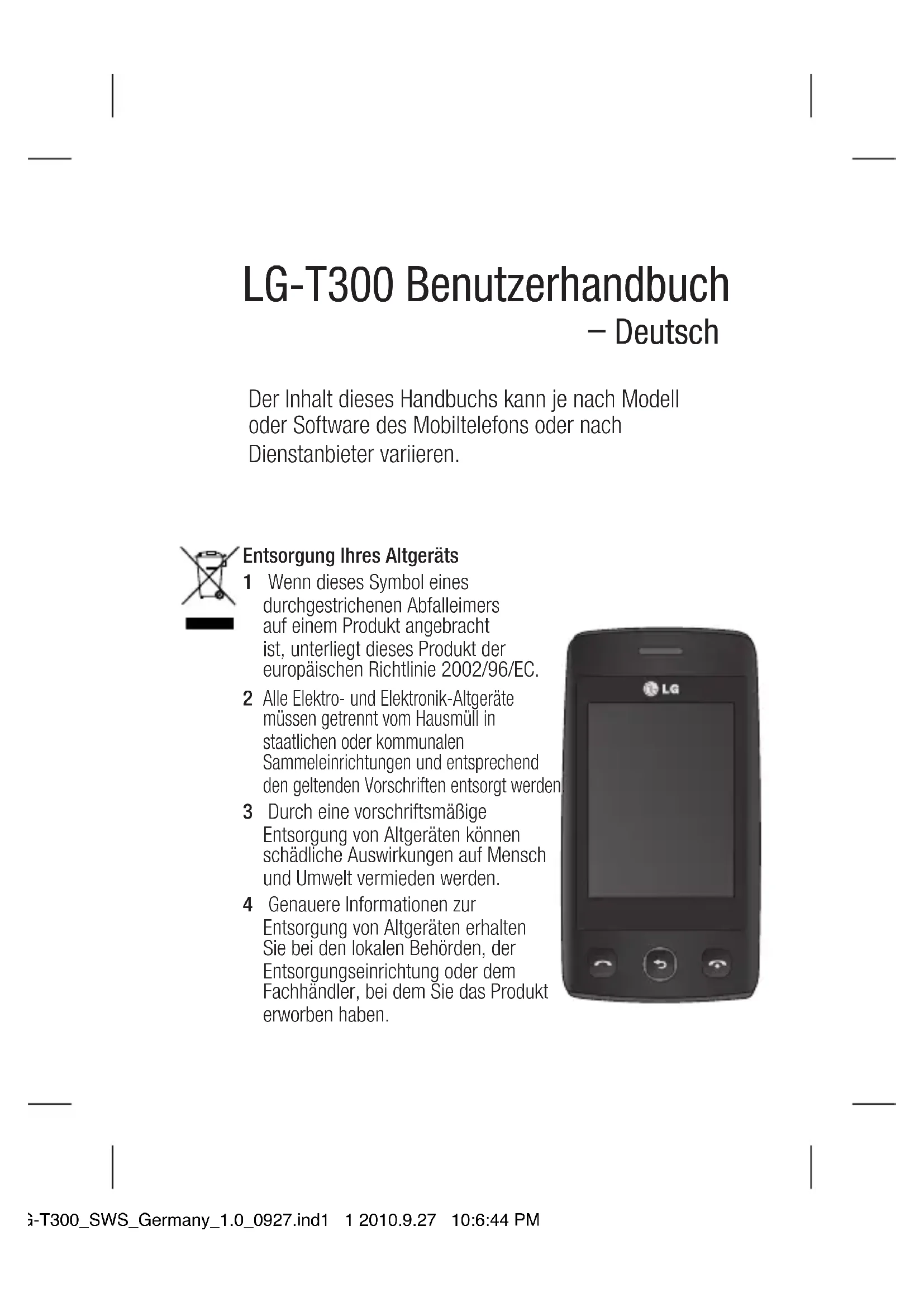 Deutsch Der Inhalt dieses Handbuchs kann je nach Modell oder Software des Mobiltelefons oder nach Dienstanbieter variieren. Entsorgung Ihres Altgeräts 1 Wenn dieses Symbol eines durchgestrichenen Abfalleimers auf einem Produkt angebracht ist, unterliegt dieses Produkt der europäischen Richtlinie 2002/96/EC.