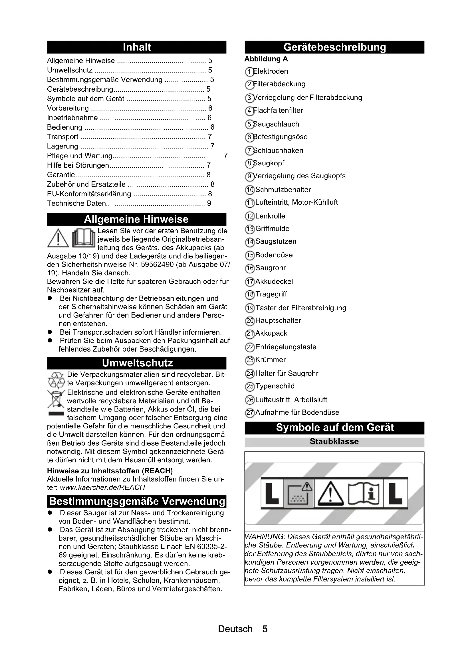 - GDeutsch 5 Inhalt Allgemeine Hinweise Lesen Sie vor der ersten Benutzung die jeweils beiliegende Originalbetriebsan- leitung des Geräts, des Akkupacks (ab Ausgabe 10/19) und des Ladegeräts und die beiliegen- den Sicherheitshinweise Nr. 59562490 (ab Ausgabe 07/ 19). Handeln Sie danach. Bewahren Sie die Hefte für späteren Gebrauch oder für Nachbesitzer auf. Bei Nichtbeachtung der Betriebsanleitungen und der Sicherheitshinweise können Schäden am Gerät und Gefahren für den Bediener und andere Perso- nen entstehen. Bei Transportschaden sofort Händler informieren. Prüfen Sie beim Auspacken den Packungsinhalt auf fehlendes Zubehör oder Beschädigungen. Umweltschutz Die Verpackungsmaterialien sind recyclebar. Bit- te Verpackungen umweltgerecht entsorgen. Elektrische und elektronische Geräte enthalten wertvolle recyclebare Materialien und oft Be- standteile wie Batterien, Akkus oder Öl, die bei falschem Umgang oder falscher Entsorgung eine potentielle Gefahr für die menschliche Gesundheit und die Umwelt darstellen können. Für den ordnungsgemä- ßen Betrieb des Geräts sind diese Bestandteile jedoch notwendig. Mit diesem Symbol gekennzeichnete Gerä- te dürfen nicht mit dem Hausmüll entsorgt werden. Hinweise zu Inhaltsstoffen (REACH) Aktuelle Informationen zu Inhaltsstoffen finden Sie un- ter: www.kaercher.de/REACH Bestimmungsgemäße Verwendung Dieser Sauger ist zur Nass- und Trockenreinigung von Boden- und Wandflächen bestimmt. Das Gerät ist zur Absaugung trockener, nicht brenn- barer, gesundheitsschädlicher Stäube an Maschi- nen und Geräten; Staubklasse L nach EN 60335-2- 69 geeignet. Einschränkung: Es dürfen keine kreb- serzeugende Stoffe aufgesaugt werden. Dieses Gerät ist für den gewerblichen Gebrauch ge- eignet, z. B. in Hotels, Schulen, Krankenhäusern, Fabriken, Läden, Büros und Vermietergeschäften. Gerätebeschreibung Abbildung A 1 Elektroden 2 Filterabdeckung 3 Verriegelung der Filterabdeckung 4 Flachfaltenfilter 5 Saugschlauch 6 Befestigungsöse 7 Schlauchhaken 8 Saugkopf 9 Verriegelung des Saugkopfs 10 Schmutzbehälter 11 Lufteintritt, Motor-Kühlluft 12 Lenkrolle 13 Griffmulde 14 Saugstutzen 15 Bodendüse 16 Saugrohr 17 Akkudeckel 18 Tragegriff 19 Taster der Filterabreinigung 20 Hauptschalter 21 Akkupack 22 Entriegelungstaste 23 Krümmer 24 Halter für Saugrohr 25 Typenschild 26 Luftaustritt, Arbeitsluft 27 Aufnahme für Bodendüse Symbole auf dem Gerät Staubklasse Allgemeine Hinweise p. 5