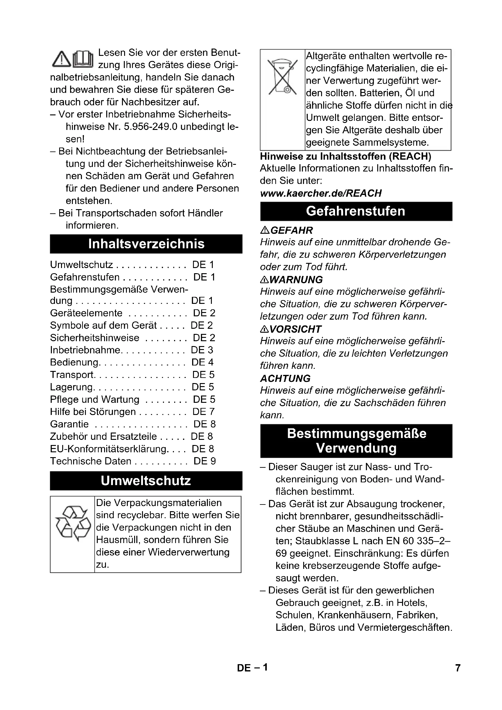 6– 1 Lesen Sie vor der ersten Benut- zung Ihres Gerätes diese Origi- nalbetriebsanleitung, handeln Sie danach und bewahren Sie diese für späteren Ge- brauch oder für Nachbesitzer auf. – Vor erster Inbetriebnahme Sicherheits- hinweise Nr. 5.956-249.0 unbedingt le- sen! – Bei Nichtbeachtung der Betriebsanlei- tung und der Sicherheitshinweise kön- nen Schäden am Gerät und Gefahren für den Bediener und andere Personen entstehen. – Bei Transportschaden sofort Händler informieren. Hinweise zu Inhaltsstoffen (REACH) Aktuelle Informationen zu Inhaltsstoffen fin- den Sie unter: www.kaercher.de/REACH GEFAHR Hinweis auf eine unmittelbar drohende Ge- fahr, die zu schweren Körperverletzungen oder zum Tod führt. 몇 WARNUNG Hinweis auf eine möglicherweise gefährli- che Situation, die zu schweren Körperver- letzungen oder zum Tod führen kann. 몇 VORSICHT Hinweis auf eine möglicherweise gefährli- che Situation, die zu leichten Verletzungen führen kann. ACHTUNG Hinweis auf eine möglicherweise gefährli- che Situation, die zu Sachschäden führen kann. – Dieser Sauger ist zur Nass- und Tro- ckenreinigung von Boden- und Wand- flächen bestimmt. – Das Gerät ist zur Absaugung trockener, nicht brennbarer, gesundheitsschädli- cher Stäube an Maschinen und Gerä- ten; Staubklasse L nach EN 60 335–2– 69 geeignet. Einschränkung: Es dürfen keine krebserzeugende Stoffe aufge- saugt werden. – Dieses Gerät ist für den gewerblichen Gebrauch geeignet, z.B. in Hotels, Schulen, Krankenhäusern, Fabriken, Läden, Büros und Vermietergeschäften. Inhaltsverzeichnis Umweltschutz ... DE 1 Gefahrenstufen ... DE 1 Bestimmungsgemäße Verwen- dung ... DE 1 Geräteelemente ... DE 2 Symbole auf dem Gerät ... DE 2 Sicherheitshinweise ... DE 2 Inbetriebnahme... DE 3 Bedienung... DE 4 Transport... DE 5 Lagerung... DE 5 Pflege und Wartung ... DE 5 Hilfe bei Störungen ... DE 7 Garantie ... DE 8 Zubehör und Ersatzteile ... DE 8 EU-Konformitätserklärung... DE 8 Technische Daten ... DE 9 Umweltschutz Die Verpackungsmaterialien sind recyclebar. Bitte werfen Sie die Verpackungen nicht in den Hausmüll, sondern führen Sie diese einer Wiederverwertung zu. Altgeräte enthalten wertvolle re- cyclingfähige Materialien, die ei- ner Verwertung zugeführt wer- den sollten. Batterien, Öl und ähnliche Stoffe dürfen nicht in die Umwelt gelangen. Bitte entsor- gen Sie Altgeräte deshalb über geeignete Sammelsysteme. Gefahrenstufen Bestimmungsgemäße Verwendung 7DE– 2 1 Elektroden 2 Saugstutzen 3 Saugschlauch 4 Schlauchhaken 5 Verriegelung des Schubbügels (nur NT 50/1) 6 Fugendüse 7 Luftaustritt, Arbeitsluft 8 Saugkopf 9 Verriegelung des Saugkopfs 10 Griffmulde 11 Schmutzbehälter 12 Lenkrolle 13 Handgriff (nur NT 50/1) 14 Lufteintritt, Motor-Kühlluft 15 Bodendüse 16 Saugrohr 17 Anschlag für Werkzeugkoffer 18 Gummimuffe, schraubbar 19 Befestigungsöse 20 Filterabdeckung 21 Tragegriff 22 Saugkraftregler (stufenlos) 23 Werkzeugadapter (nur Ap Te L) 24 Schubbügel (nur NT 50/1) 25 Taster der Filterabreinigung 26 Drehschalter 27 Steckdose (nur Ap Te L) 28 Halter für Bodendüse 29 Ablassschlauch (nur NT 50/1) 30 Halter für Saugrohr 31 Kabelhaken (nur NT 50/1) 32 Krümmer 33 Netzkabel 34 Halter für Krümmer (nur NT 30/1, NT 40/1) 35 Filterrahmen 36 Flachfaltenfilter (PES) 37 Filterabreinigung 38 Typenschild GEFAHR – Wenn die Abluft in den Raum zurückge- führt wird, muss eine ausreichende Luftwechselrate L im Raum vorhanden sein. Um die geforderten Grenzwerte einzuhalten, darf der zurückgeführte Volumenstrom maximal 50% des Frischluftvolumenstroms (Raumvolu- men V