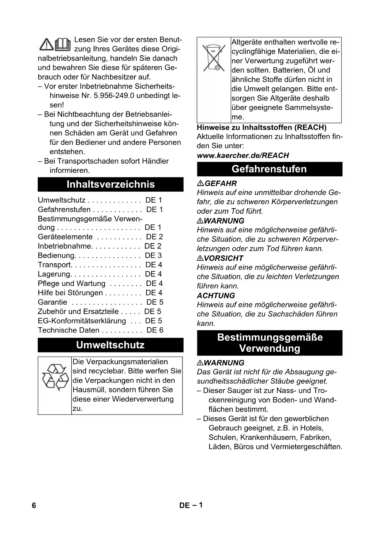 5– 1 Lesen Sie vor der ersten Benut- zung Ihres Gerätes diese Origi- nalbetriebsanleitung, handeln Sie danach und bewahren Sie diese für späteren Ge- brauch oder für Nachbesitzer auf. – Vor erster Inbetriebnahme Sicherheits- hinweise Nr. 5.956-249.0 unbedingt le- sen! – Bei Nichtbeachtung der Betriebsanlei- tung und der Sicherheitshinweise kön- nen Schäden am Gerät und Gefahren für den Bediener und andere Personen entstehen. – Bei Transportschaden sofort Händler informieren. Hinweise zu Inhaltsstoffen (REACH) Aktuelle Informationen zu Inhaltsstoffen fin- den Sie unter: www.kaercher.de/REACH GEFAHR Hinweis auf eine unmittelbar drohende Ge- fahr, die zu schweren Körperverletzungen oder zum Tod führt. 몇 WARNUNG Hinweis auf eine möglicherweise gefährli- che Situation, die zu schweren Körperver- letzungen oder zum Tod führen kann. 몇 VORSICHT Hinweis auf eine möglicherweise gefährli- che Situation, die zu leichten Verletzungen führen kann. ACHTUNG Hinweis auf eine möglicherweise gefährli- che Situation, die zu Sachschäden führen kann. 몇 WARNUNG Das Gerät ist nicht für die Absaugung ge- sundheitsschädlicher Stäube geeignet. – Dieser Sauger ist zur Nass- und Tro- ckenreinigung von Boden- und Wand- flächen bestimmt. – Dieses Gerät ist für den gewerblichen Gebrauch geeignet, z.B. in Hotels, Schulen, Krankenhäusern, Fabriken, Läden, Büros und Vermietergeschäften. Inhaltsverzeichnis Umweltschutz ... DE 1 Gefahrenstufen ... DE 1 Bestimmungsgemäße Verwen- dung ... DE 1 Geräteelemente ... DE 2 Inbetriebnahme... DE 2 Bedienung... DE 3 Transport... DE 4 Lagerung... DE 4 Pflege und Wartung ... DE 4 Hilfe bei Störungen ... DE 4 Garantie ... DE 5 Zubehör und Ersatzteile ... DE 5 EG-Konformitätserklärung ... DE 5 Technische Daten ... DE 6 Umweltschutz Die Verpackungsmaterialien sind recyclebar. Bitte werfen Sie die Verpackungen nicht in den Hausmüll, sondern führen Sie diese einer Wiederverwertung zu. Altgeräte enthalten wertvolle re- cyclingfähige Materialien, die ei- ner Verwertung zugeführt wer- den sollten. Batterien, Öl und ähnliche Stoffe dürfen nicht in die Umwelt gelangen. Bitte ent- sorgen Sie Altgeräte deshalb über geeignete Sammelsyste- me. Gefahrenstufen Bestimmungsgemäße Verwendung 6 DE– 2 1 Elektroden 2 Saugschlauch 3 Schubbügel, verstellbar 4 Verriegelung des Saugkopfs 5 Schmutzbehälter 6 Saugkopf 7 Lenkrolle 8 Fahrgestell 9 Saugstutzen 10 Fahrgestellgriff 11 Bodendüse 12 Saugrohr 13 Tragegriff 14 Schlauch- und Kabelhaken 15 Filterabdeckung 16 Krümmer 17 Drehschalter 18 Ablage für Bodendüse 19 Kipphilfe 20 Typenschild 21 Ablassschlauch 22 Halter für Saugrohre 23 Netzkabel 24 Befestigungsschraube des Schubbügels 25 Flachfaltenfilter 26 Filterabreinigung – Bedienelemente für den Reinigungs- prozess sind gelb. – Bedienelemente für die Wartung und den Service sind hellgrau. ACHTUNG Beim Saugen darf niemals der Flachfalten- filter entfernt werden. – Beim Aufsaugen von Feinstaub kann zusätzlich eine Papierfiltertüte, eine Vliesfiltertüte (Sonderzubehör) oder ein Membranfilter (Sonderzubehör) ver- wendet werden. Abbildung Saugkopf entriegeln und abnehmen. Papierfiltertüte, Vliesfiltertüte (Sonder- zubehör) oder Membranfilter (Sonder- zubehör) aufstecken. Saugkopf aufsetzen und verriegeln. ACHTUNG Beim Wechsel von Nass- auf Trocken- saugen beachten: Saugen von trockenem Staub bei nassem Filterelement setzt den Filter zu und kann ihn unbrauchbar machen. Nassen Filter vor Benutzung gut trock- nen oder durch trockenen ersetzen. Bei Bedarf Filter wechseln, wird unter Punkt "Pflege und Wartung" beschrie- ben. Hinweis: Bei permanentem Nasssaugen empfiehlt es sich, einen PES-Flachfaltenfil- ter zu verwenden (siehe Filtersysteme). Abbildung Bürstenstreifen ausbauen. Gummilippen einbauen. Hinweis: Die strukturierte Seite der Gum- milippen muss nach außen zeigen. – Beim Aufsaugen von Nassschmutz muss immer die Papierfiltertüte, die Vliesfiltertüte (Sonderzubehör) oder der Membranfilter (Sonderzubehör) ent- fernt werden. – Es empfiehlt sich eine Spezialfiltertüte (nass) zu verwenden (siehe Filtersyste- me). Geräteelemente Farbkennzeichnung Inbetriebnahme Trockensaugen Papierfiltertüte/Vliesfiltertüte einbauen Wechsel von Nass- auf Trockensaugen Nasssaugen Einbau Gummilippen Papierfiltertüte/Vliesfiltertüte entfernen 7DE– 3 몇 VORSICHT Örtliche Vorschriften zur Abwasserbehand- lung beachten. Gerät mit Metallbehälter: Abbildung Gerät mit Kunststoffbehälter: Abbildung Schmutzwasser über Ablassschlauch ablassen. – Beim Aufsaugen von Nassschmutz mit der Polster- oder Fugendüse, bezie- hungsweise wenn überwiegend Was- ser aus einem Behälter aufgesaugt wird, empfiehlt es sich, die Funktion „Automatische Filterabreinigung“ abzu- schalten. – Bei Erreichen des max. Flüssigkeits- stands schaltet das Gerät automatisch ab. – Bei nicht leitenden Flüssigkeiten (zum Beispiel Bohremulsion, Öle und Fette) wird das Gerät bei vollem Behälter nicht abgeschaltet. Der Füllstand muss ständig überprüft und der Behälter rechtzeitig entleert werden. – Nach Beendigung des Nasssaugens: Flachfaltenfilter mit der Filterabreini- gung abreinigen. Elektroden mit einer Bürste reinigen. Behälter mit einem feuchten Tuch reinigen und trocknen. Abbildung Der Saugschlauch ist mit einem Clip-Sys- tem ausgestattet. Alle C-40/C-DN-40 Zube- hörteile können angeschlossen werden. Netzstecker einstecken. Gerät am Drehschalter einschalten. Das Gerät verfügt über eine neuartige, doppelte Filterabreinigung, besonders wirksam bei feinem Staub. Dabei wird der Flachfaltenfilter alle 7,5 Sekunden durch ei- nen Luftstoß automatisch gereinigt (pulsie- rendes Geräusch). Gerät am Drehschalter ausschalten. Netzstecker ziehen. Behälter entleeren. Gerät innen und außen durch Absau- gen und Abwischen mit einem feuchten Tuch reinigen. Befestigungsschrauben des Schubbü- gels lösen und Schubbügel verstellen. Abbil